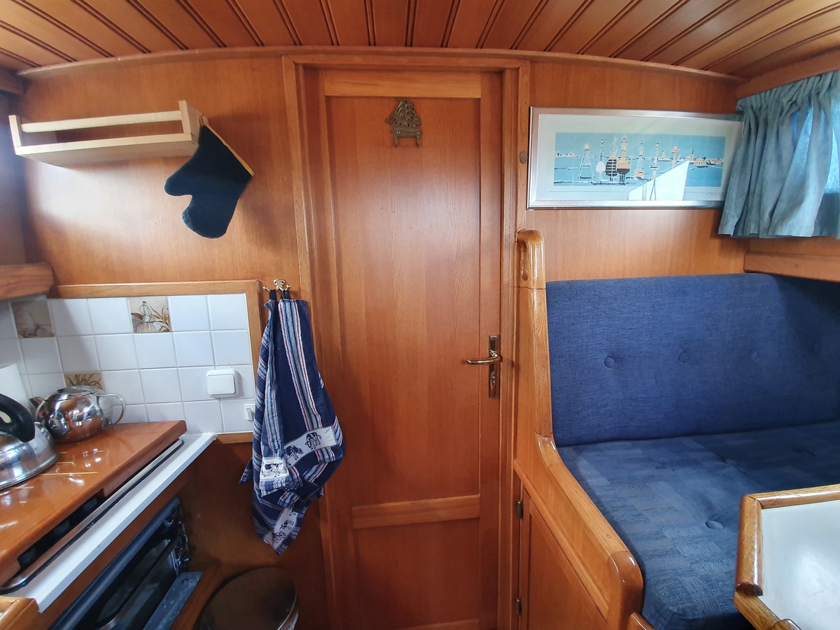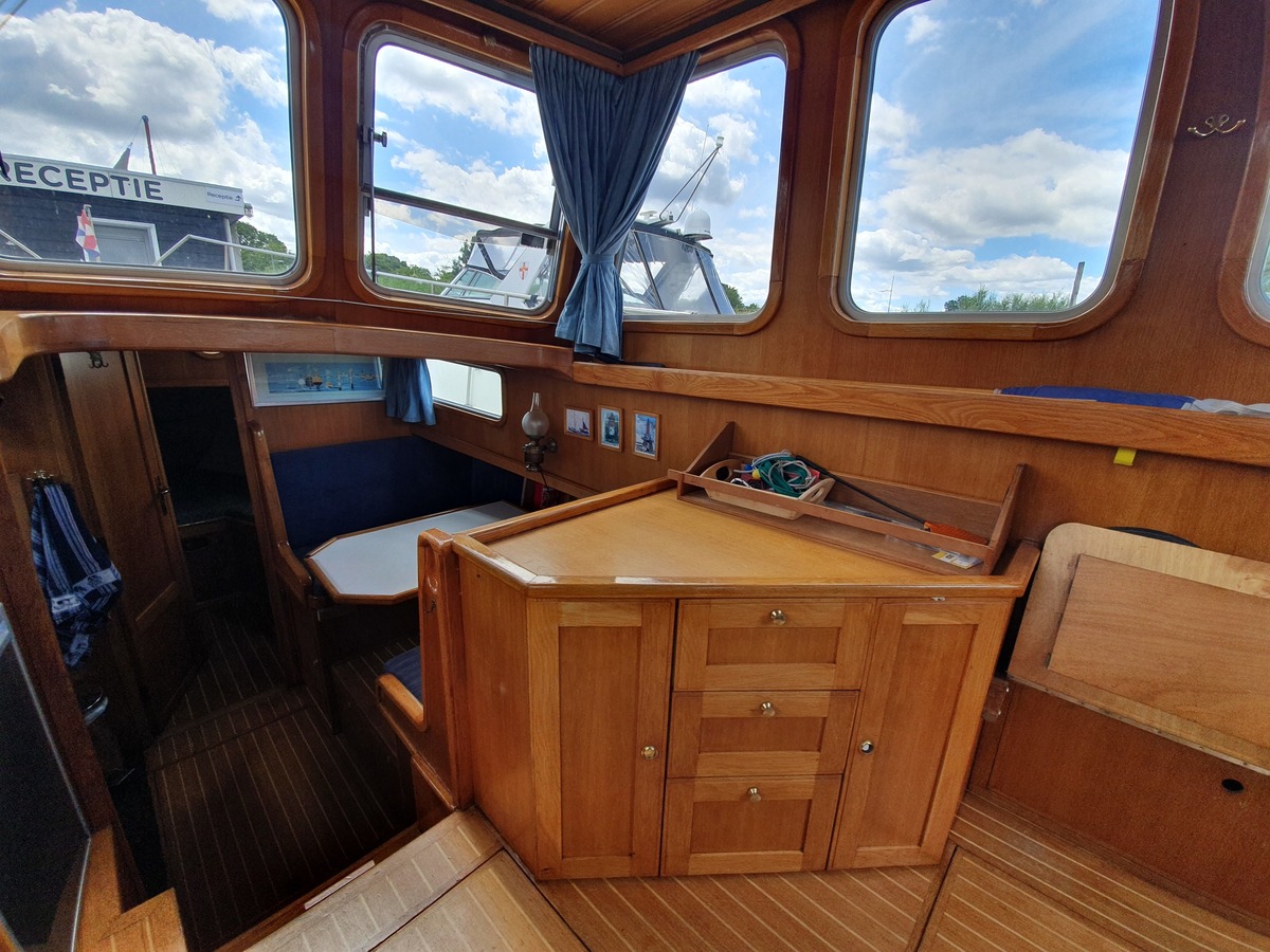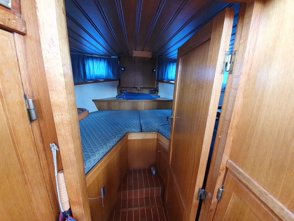 Ruime salon met langsbank en binnenstuurstand, kombuis met treinzit, voorpiek met 1 persoons bed, wastafel en toiletruimte, achtercabine met 2 bedden