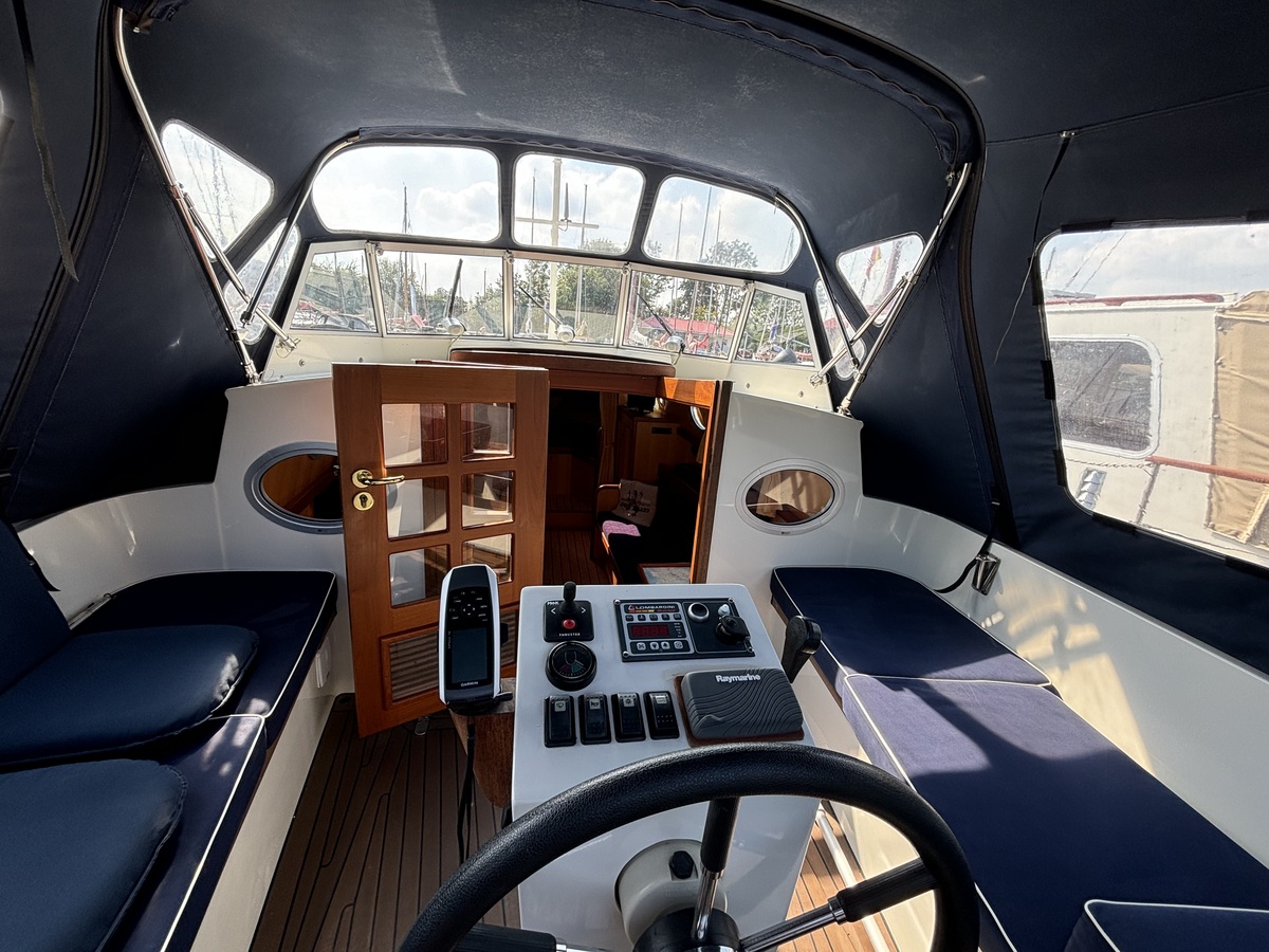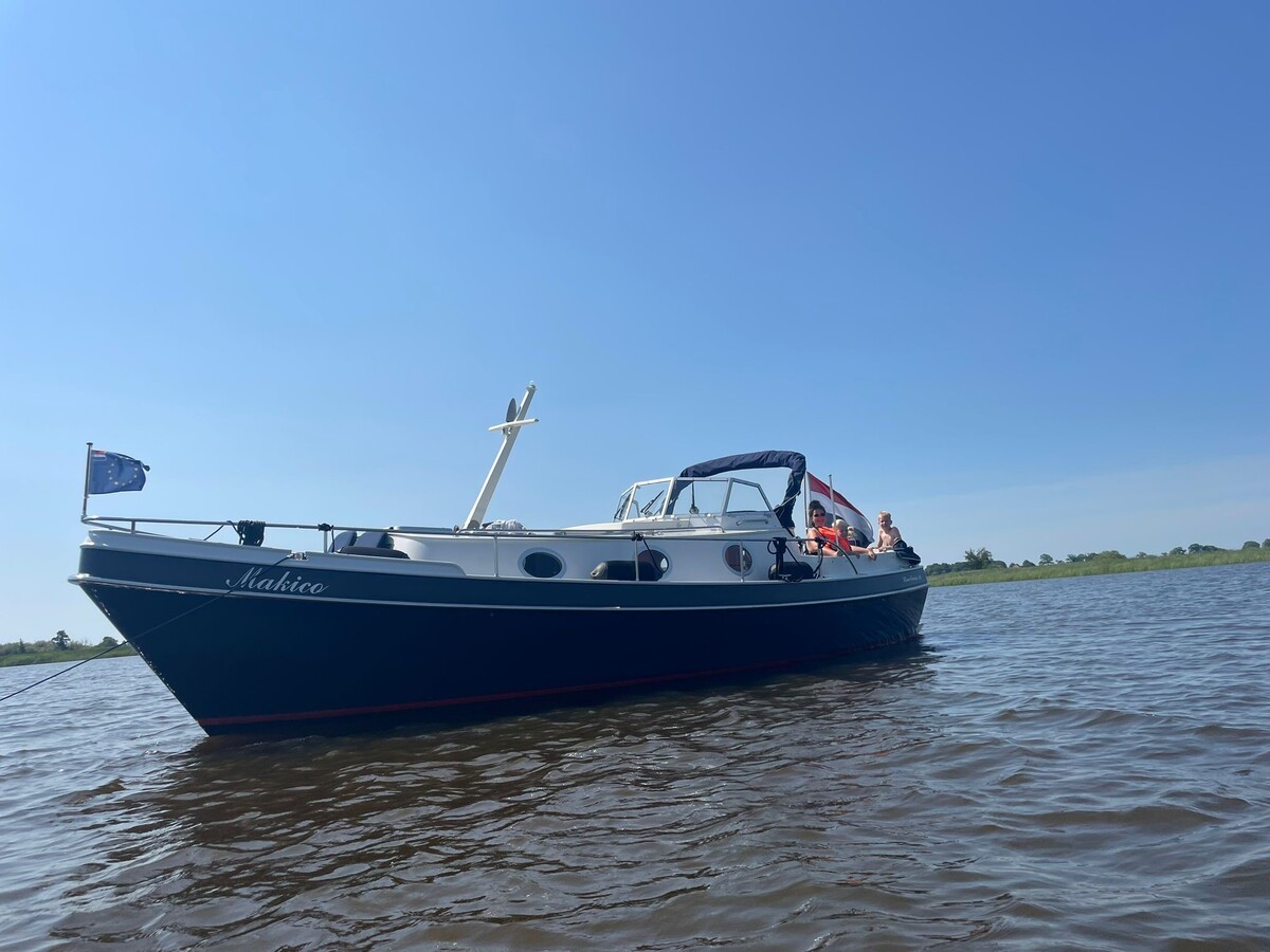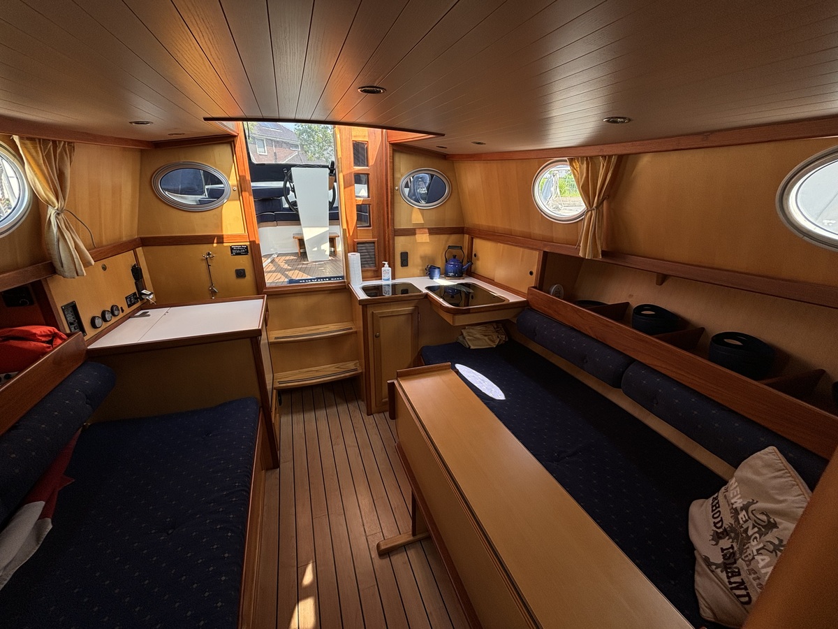 Deze motorboot is zeer compleet uitgerust voor lange tochten en een prettig verblijf aan boord. Douche, toilet, heet water, een heteluchtkachel en een omvormer voor 230V behoren tot de standaard uitrusting. Overal stahoogte, een ruim dubbel bed in de voorpiek en twee brede banken in de salon bieden verblijfsgemak voor max. 4 personen.