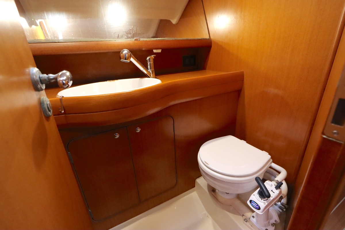 Grote V-berth in de boeg met douche/toilet (aan bakboord), 2 ruime tweepersoonshutten achterin. De mogelijkheid om de tafel in de kajuit in te klappen en een extra tweepersoonsbed te maken. De bank naast de kaartentafel kan dienen als extra slaapplaats (maximaal 160 cm). L-vormige keuken. Toilet/handdouche aan stuurboord achter de kaartentafel.