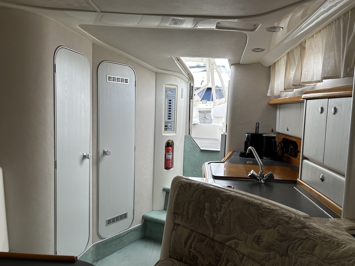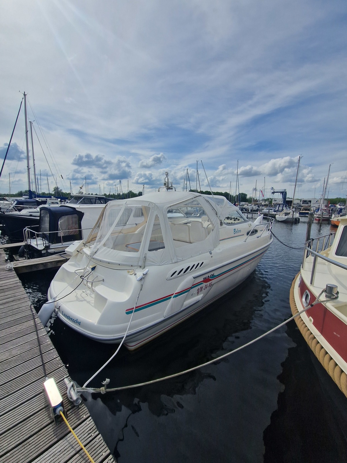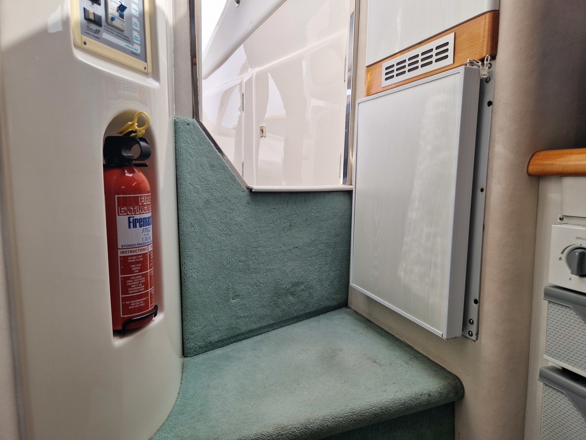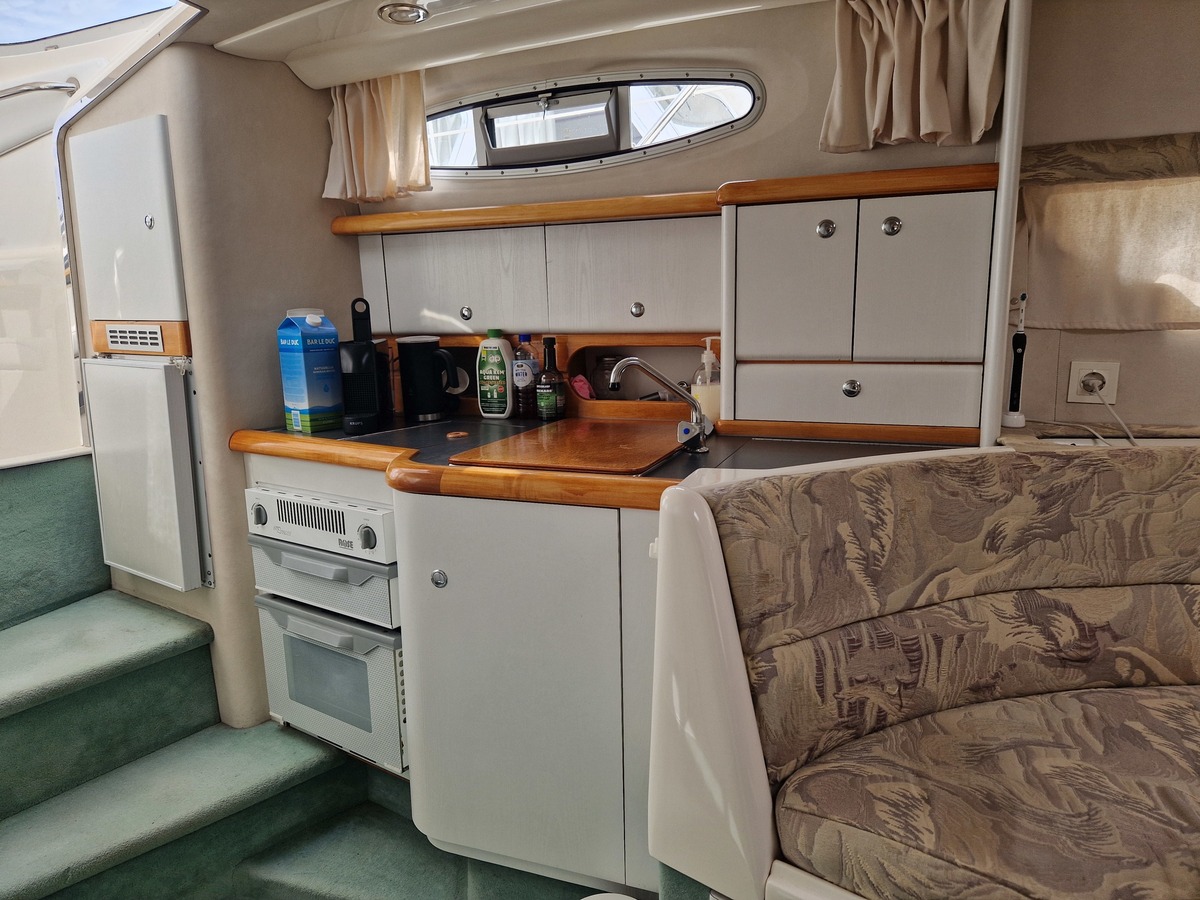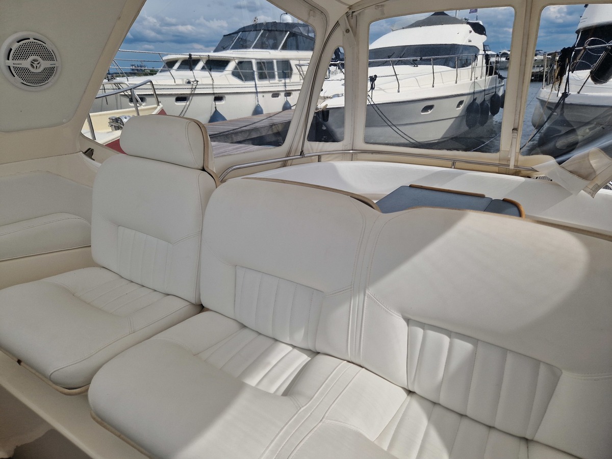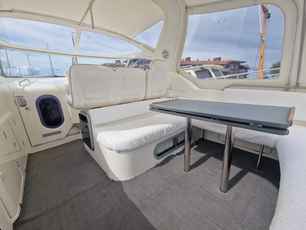 Deze zeer nette Sealine is uitgerust met 2 Mercruiser 3.0LX benzinemotoren. Inrichting compleet en netjes. Douche- en toiletruimte. Aparte hut met twee slaapplaatsen. Voorzien van een geluidsinstallatie, kooktoestel, oven en koelkast. De huidige eigenaar heeft de boot al weer 25 jaar in bezit en heeft in die tijd zeer goed zorggedragen voor de algehele staat van de boot. Dit valt meteen op bij het betreden van de boot.