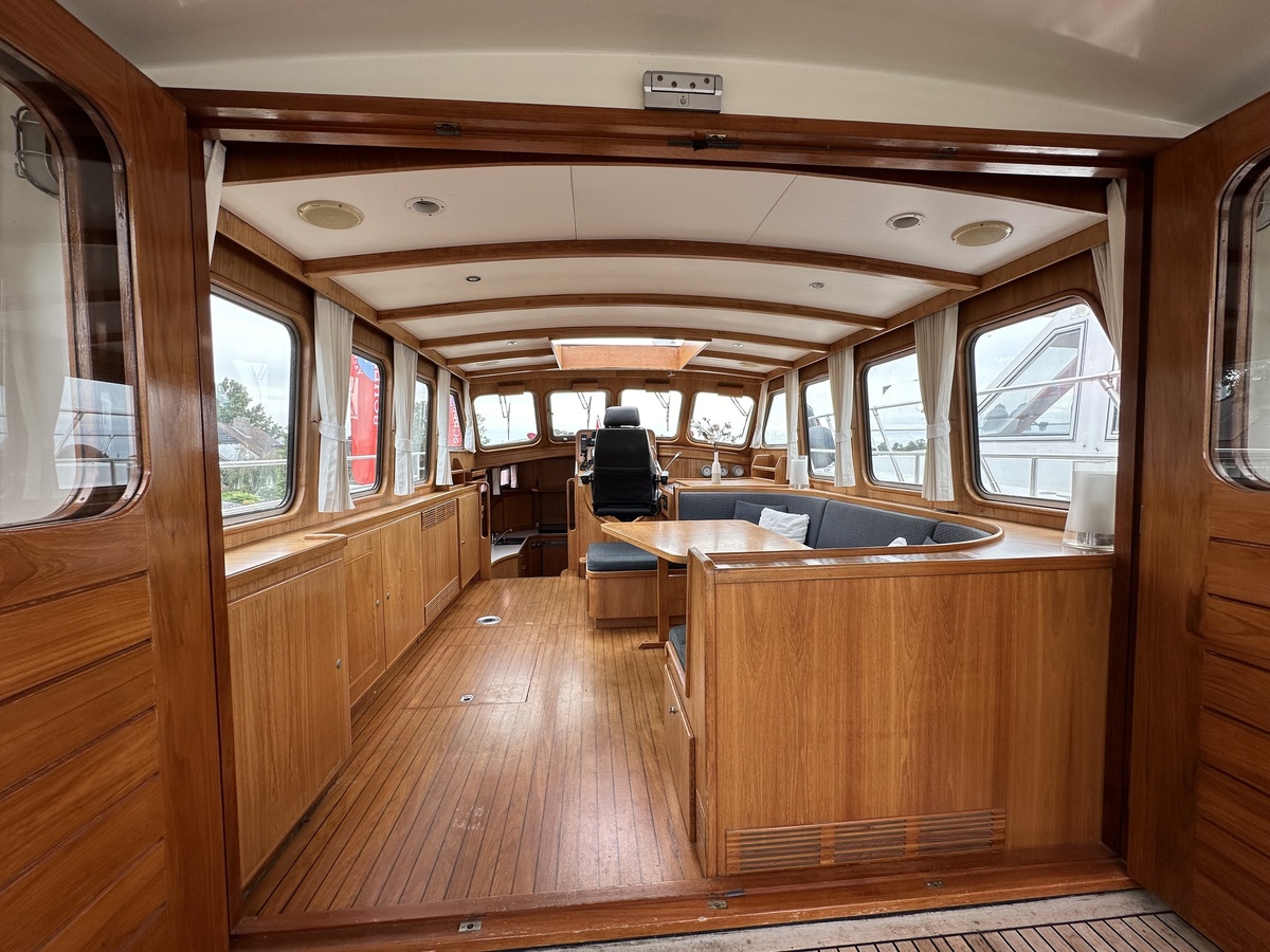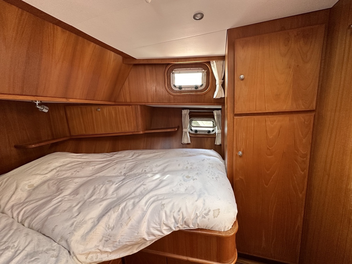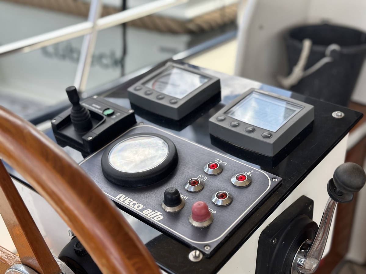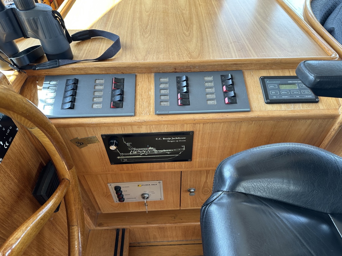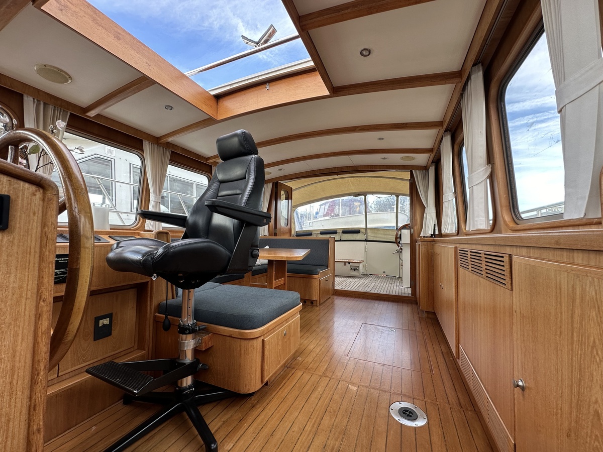 Stuurwiel HydraulischRuime Spiegelkotter ideaal om langere tijd op te verblijven vanwege de warm water verwarming en dubbele beglazing. Door de speciale ligging van de motor zijn drie ruime hutten ontstaan. Het schip wordt verkocht door de eerste eigenaar.