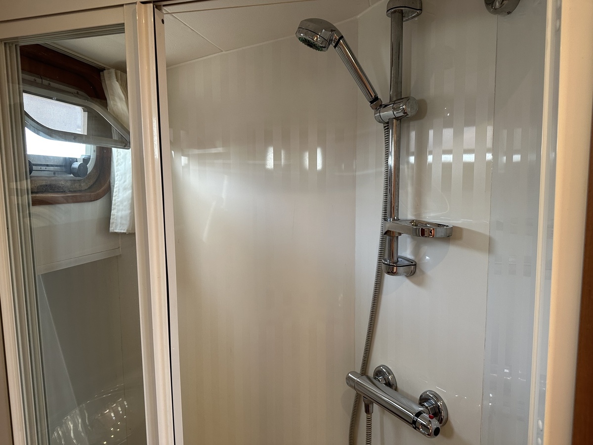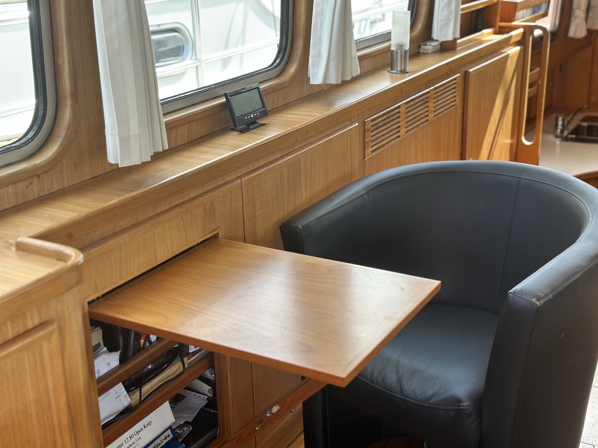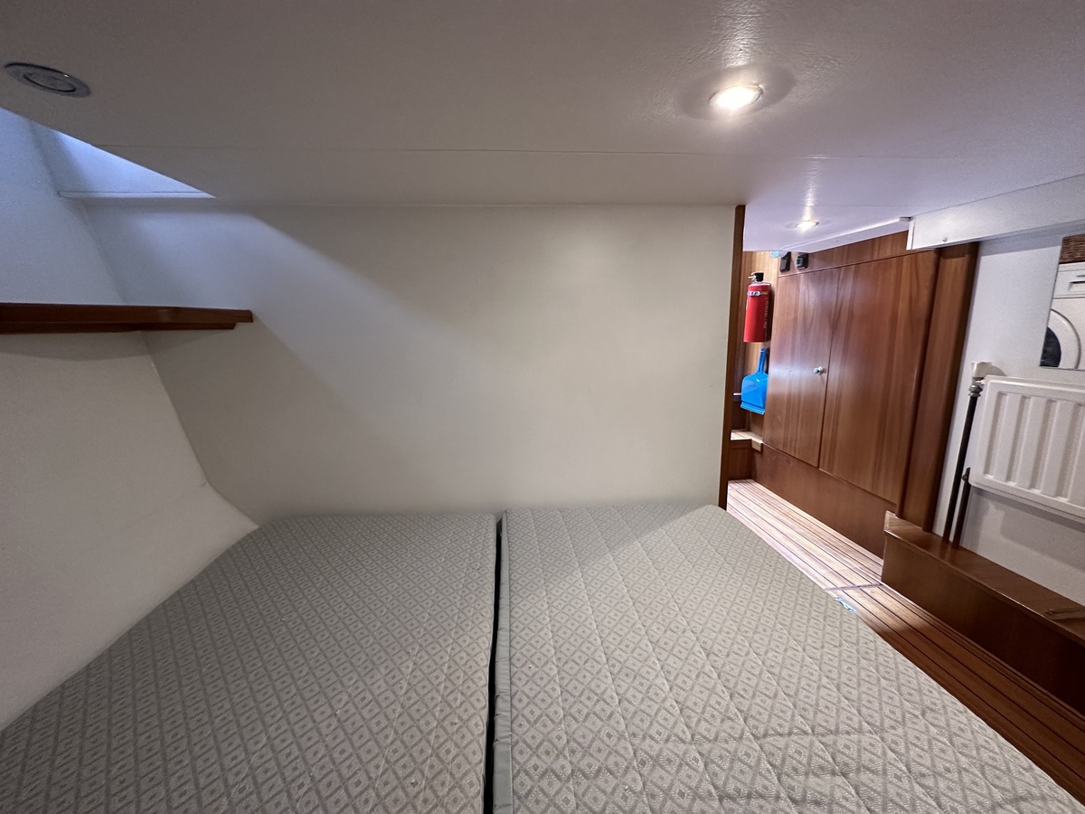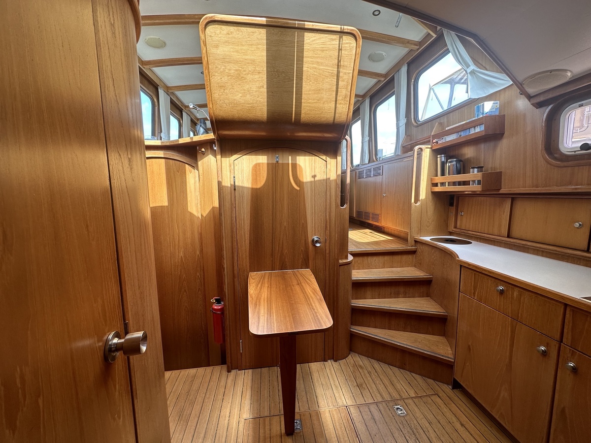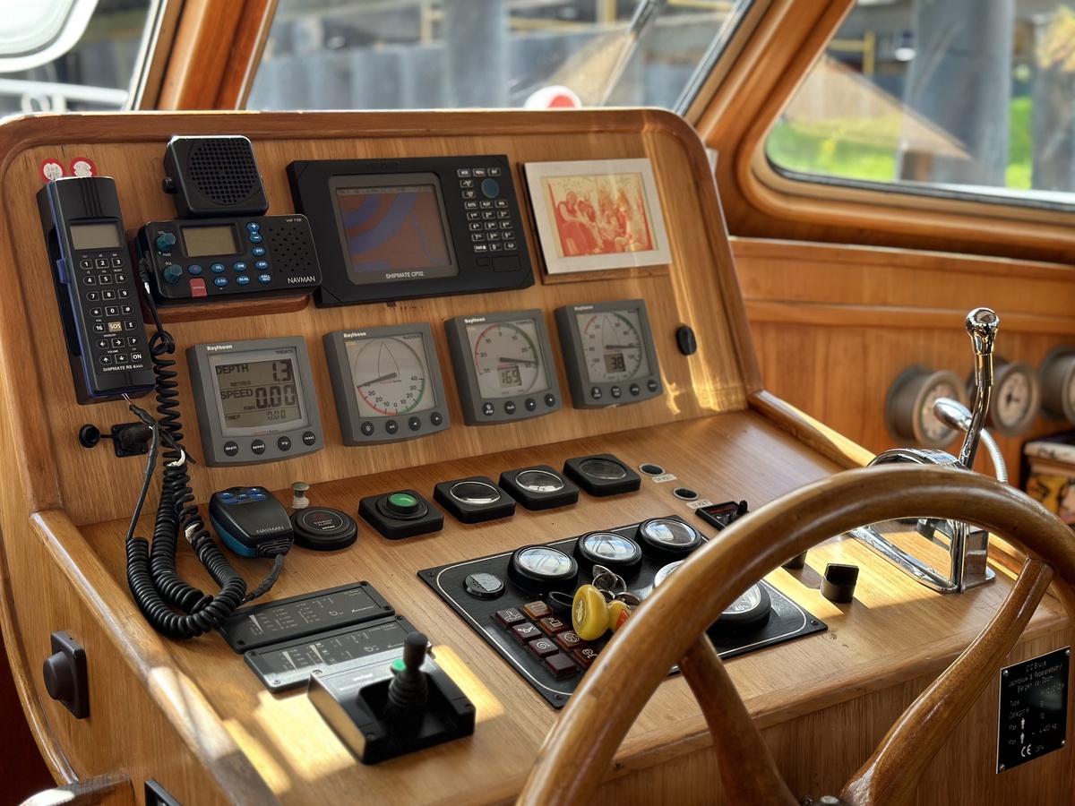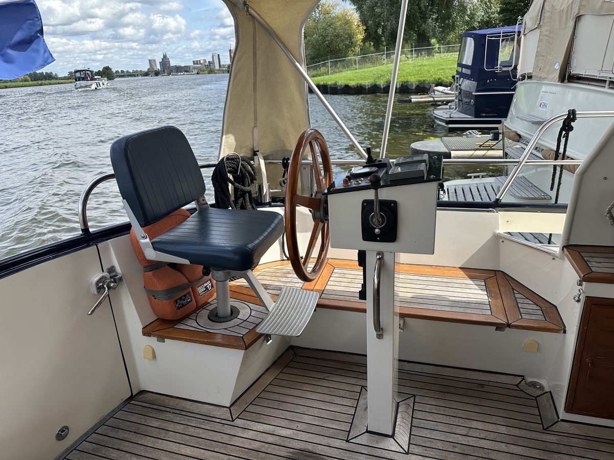 Stuurwiel HydraulischRuime Spiegelkotter ideaal om langere tijd op te verblijven vanwege de warm water verwarming en dubbele beglazing. Door de speciale ligging van de motor zijn drie ruime hutten ontstaan. Het schip wordt verkocht door de eerste eigenaar.