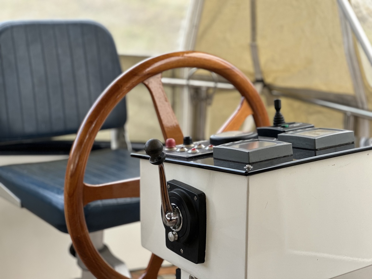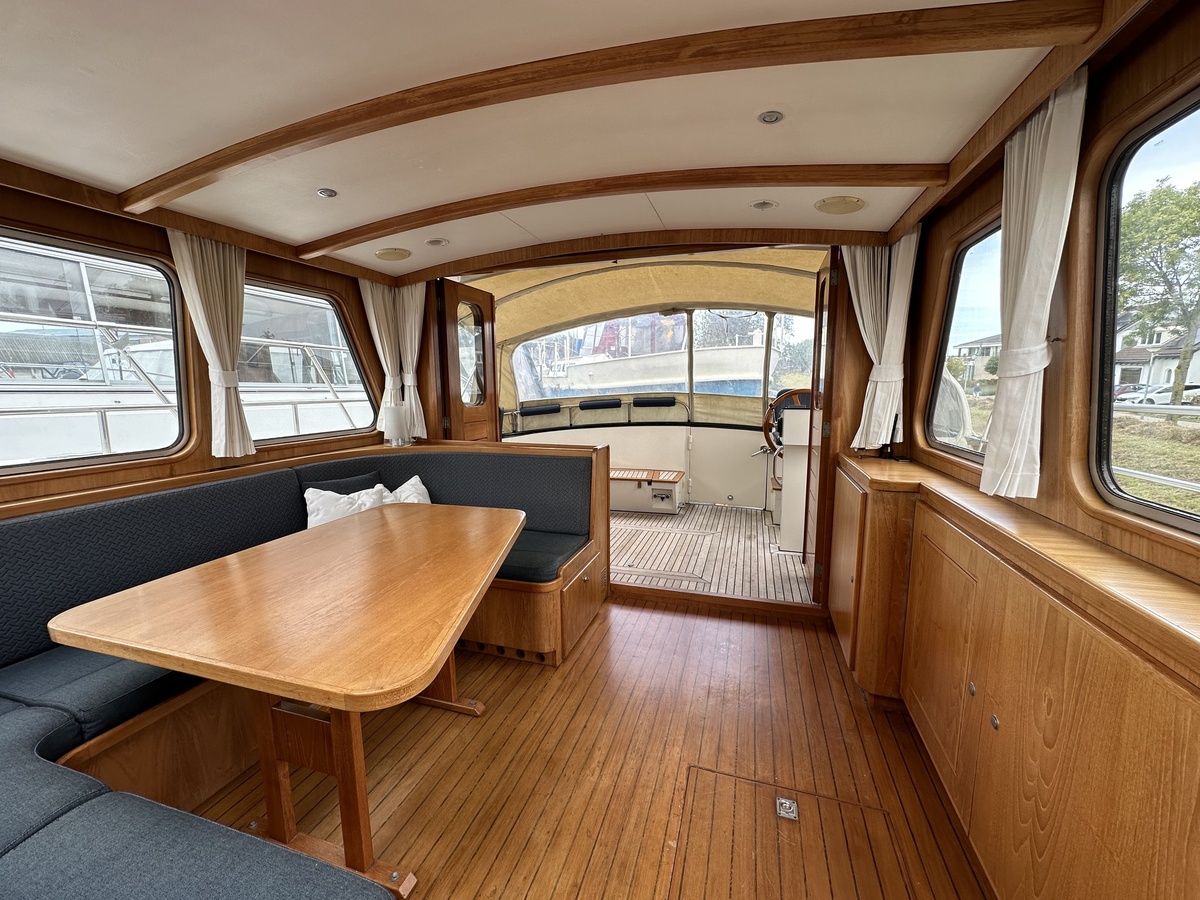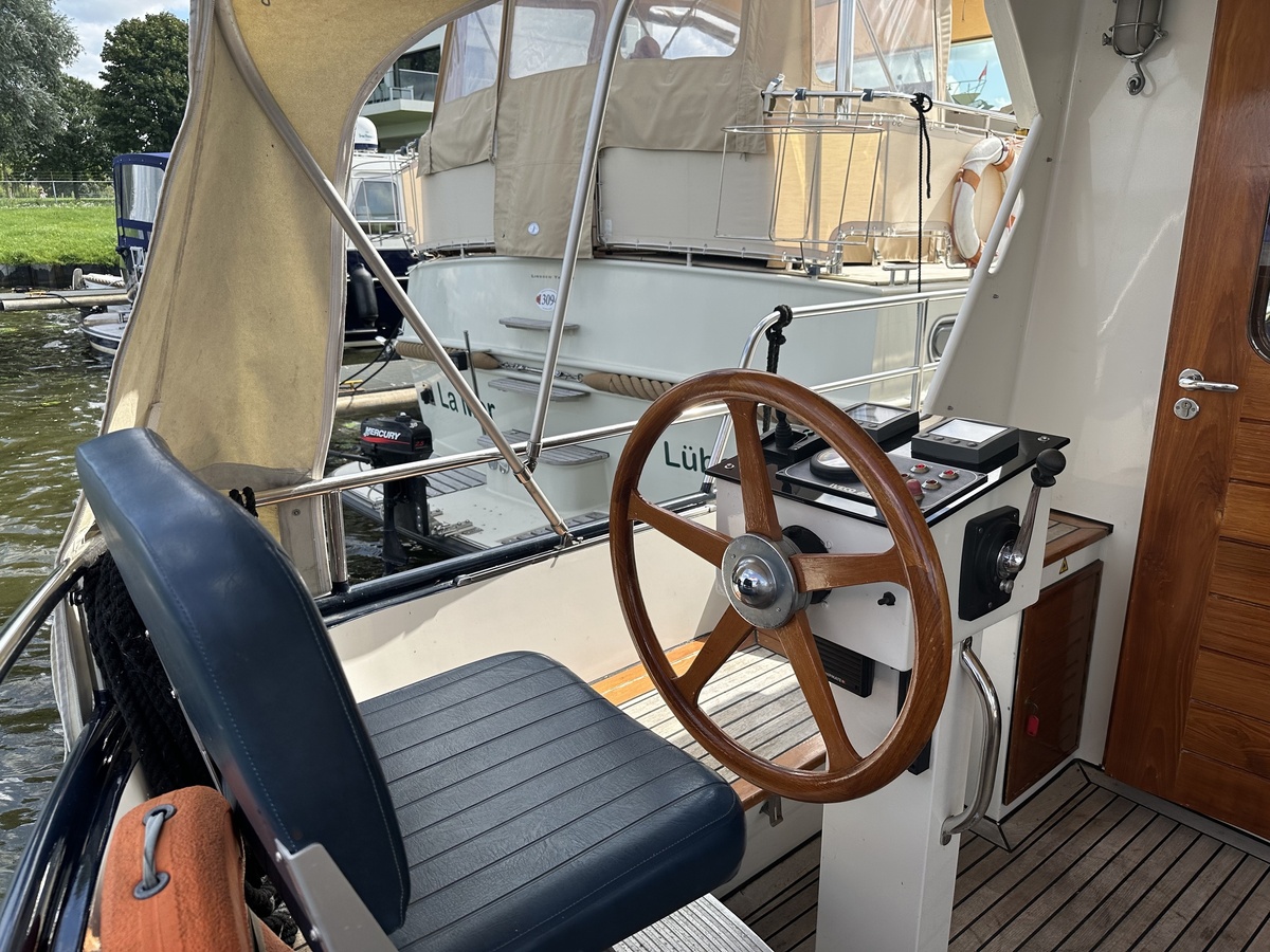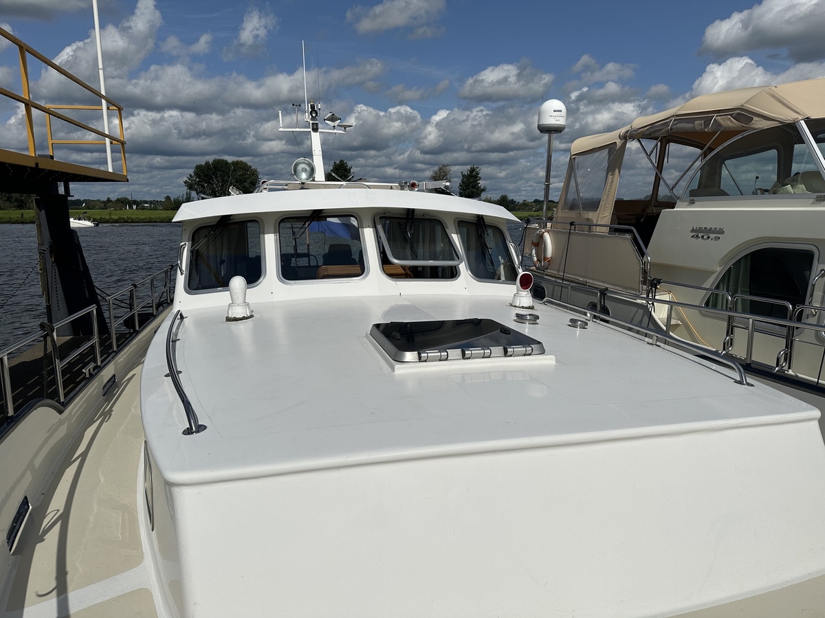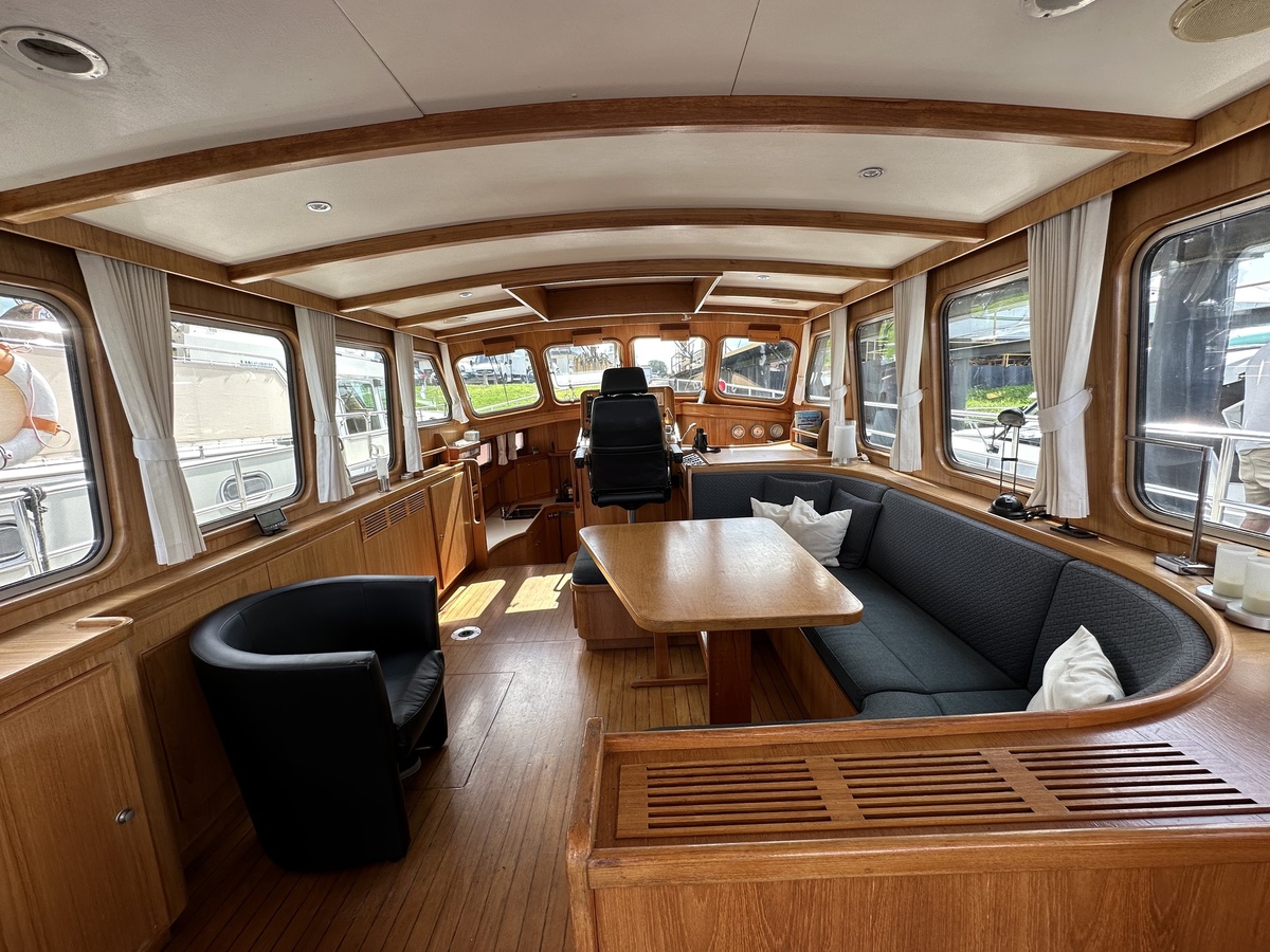 Stuurwiel HydraulischRuime Spiegelkotter ideaal om langere tijd op te verblijven vanwege de warm water verwarming en dubbele beglazing. Door de speciale ligging van de motor zijn drie ruime hutten ontstaan. Het schip wordt verkocht door de eerste eigenaar.