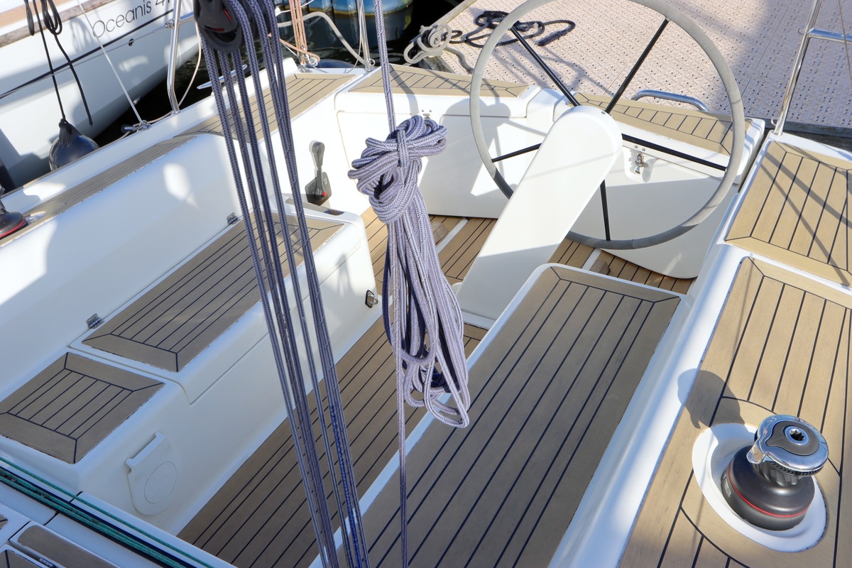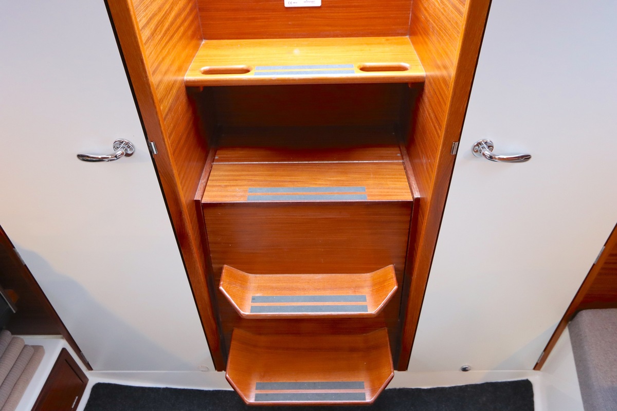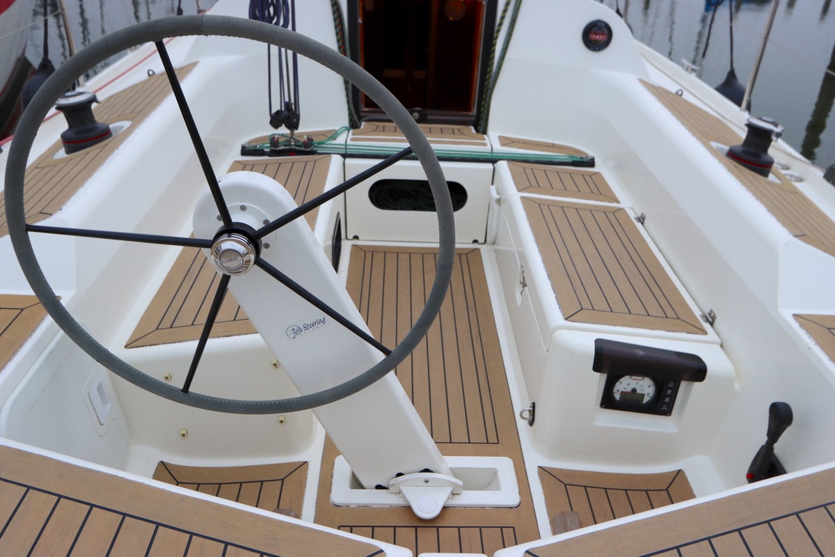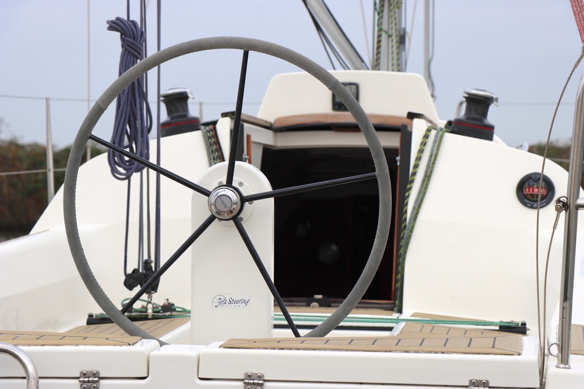 Het stuurwiel is kantelbaar in 3 posities, zodat men altijd aan een loef of lijzijde kan sturen en in de haven een vrije doorloop hebt.
