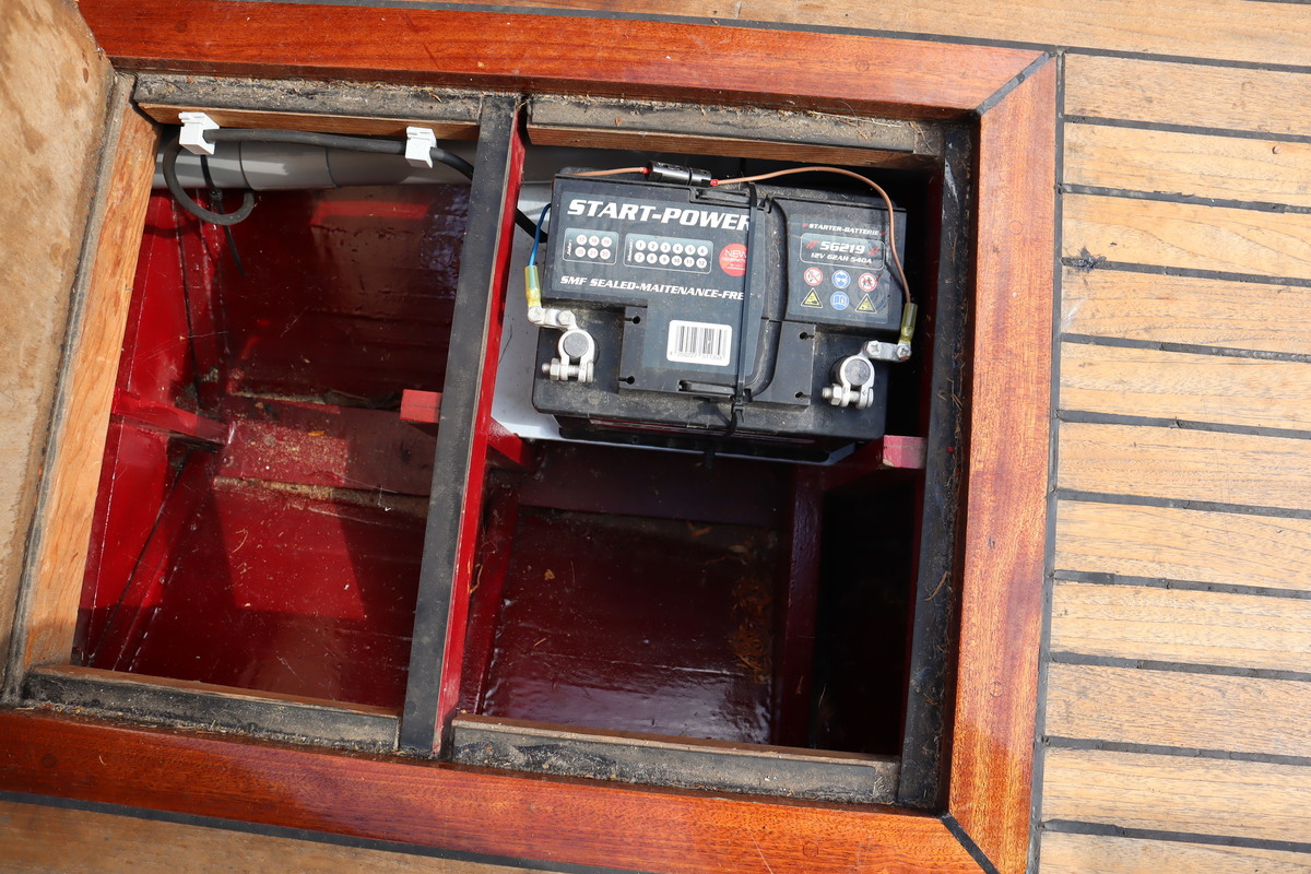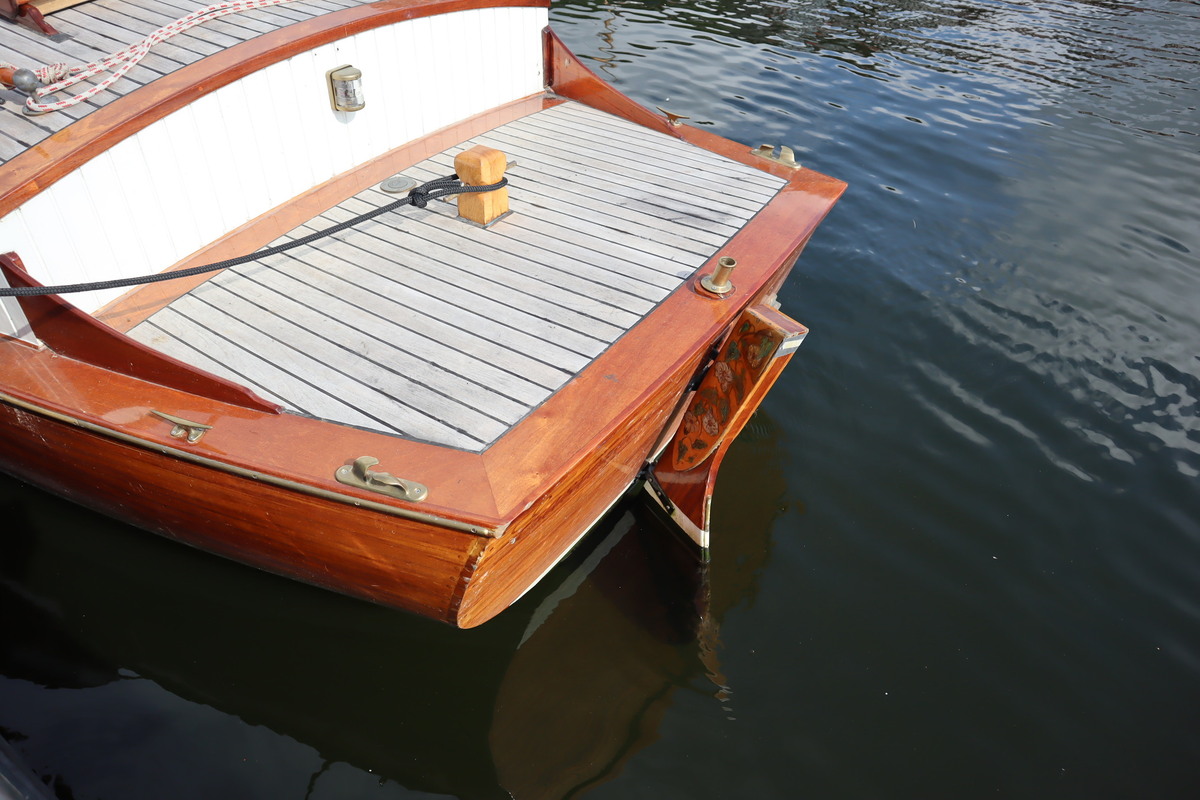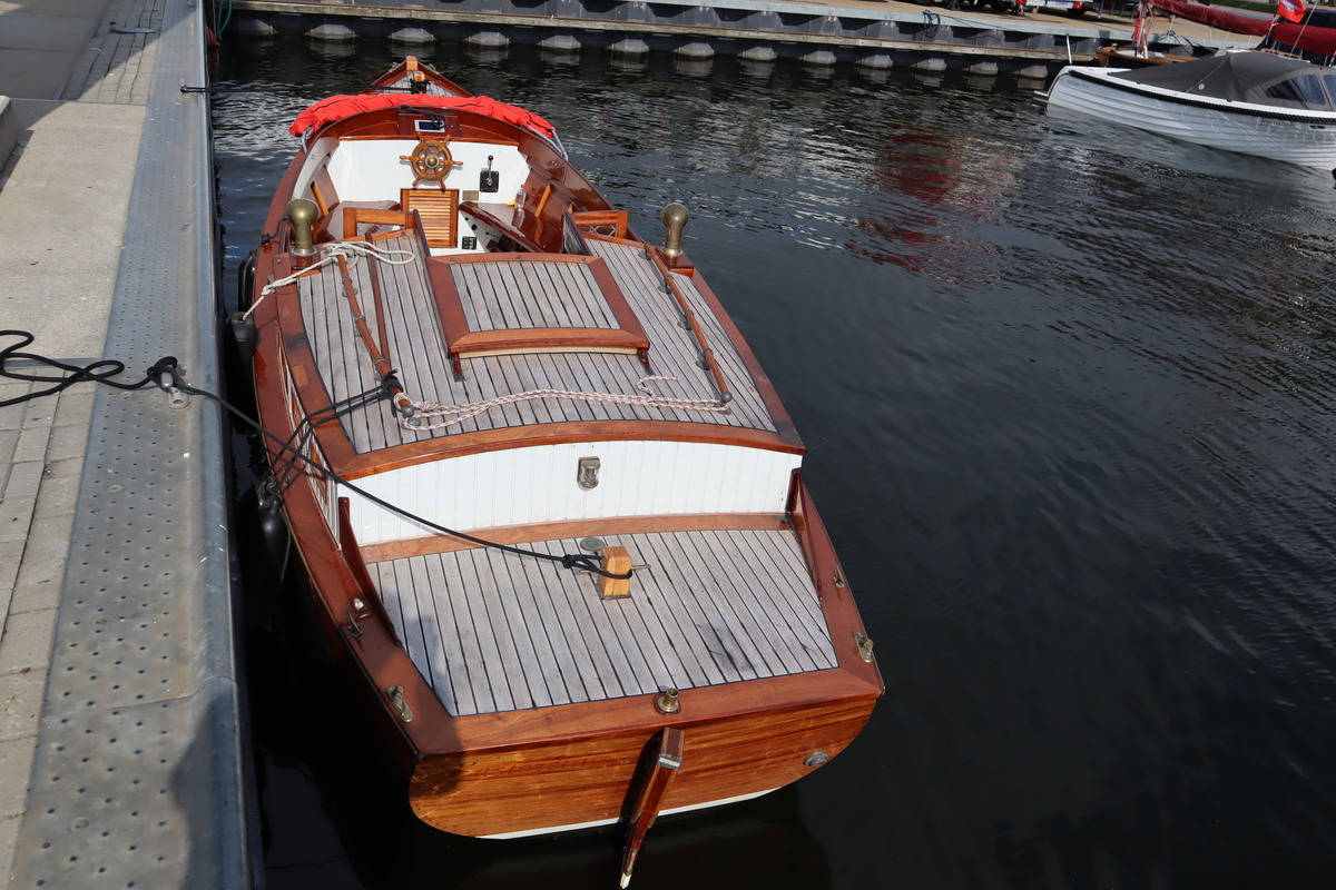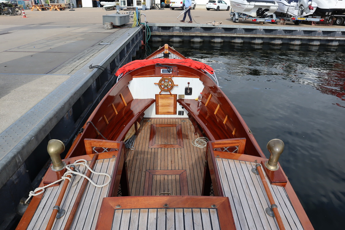 De sloep vaart geruisloos en door de 4 accu’s vaar je tot wel 12 uur aan een stuk. De houten romp is door de huidige eigenaar helemaal opgeknapt. De bodem staat tot net boven de waterlijn in de Epoxy.