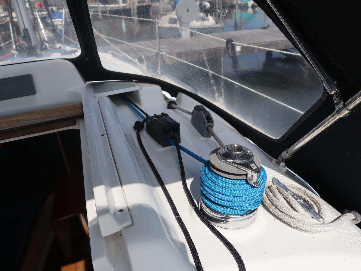 • Recente Zeilen De fractionele tuigage is uitgerust met een grootzeil en een fok, beide vernieuwd in 2020 en gemaakt van duurzaam Dacron. Het handige voorzeil rolsysteem draagt bij aan het gemak. Twee handmatige lieren zijn aanwezig.