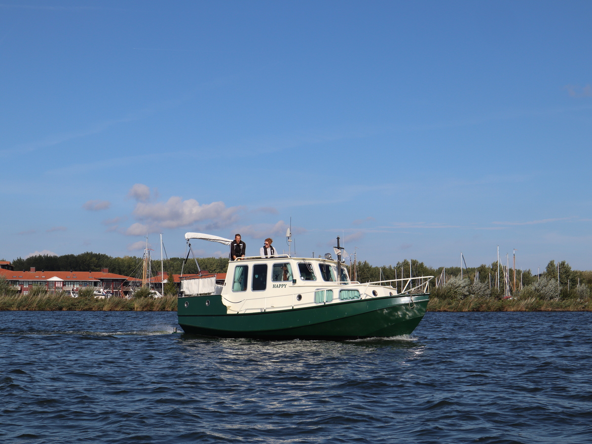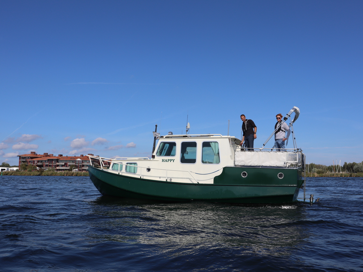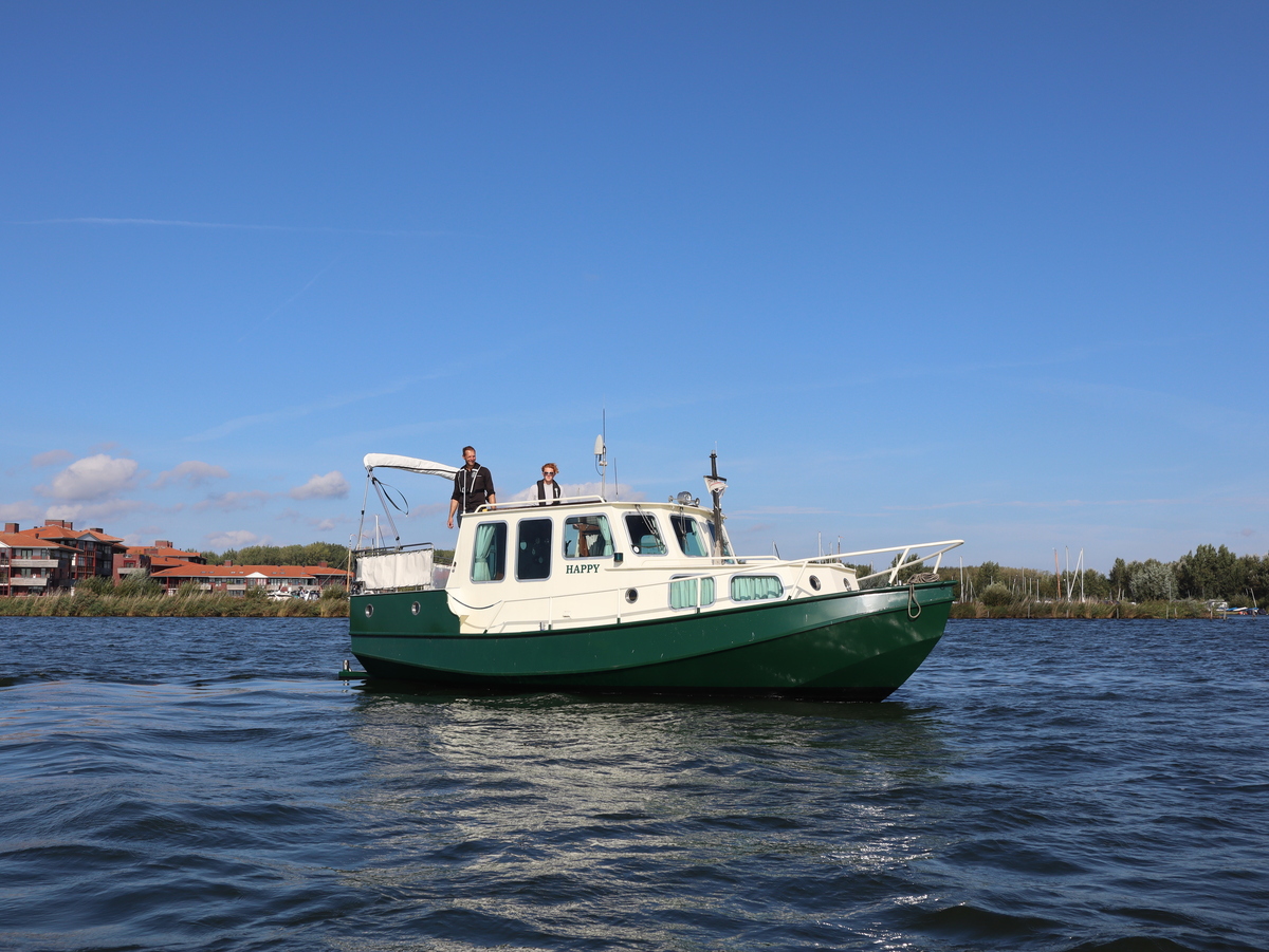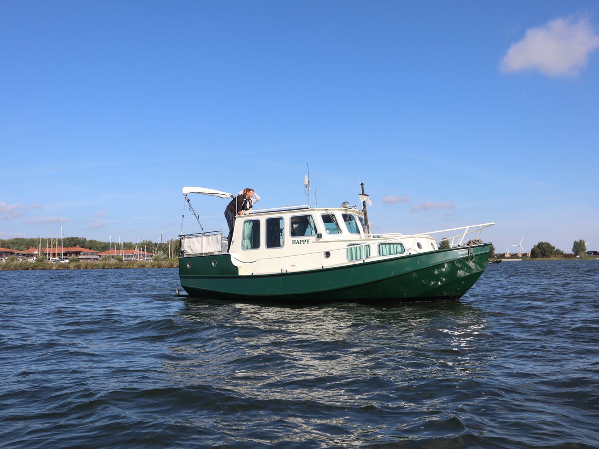 De 'Happy' is met haar indeling met een stuurhut, voorkajuit én een achterkajuit bijzonder ruim en veelzijdig. Het stalen schip (groene romp, witte opbouw) is degelijk gebouwd en voorzien van Aluminium ramen.