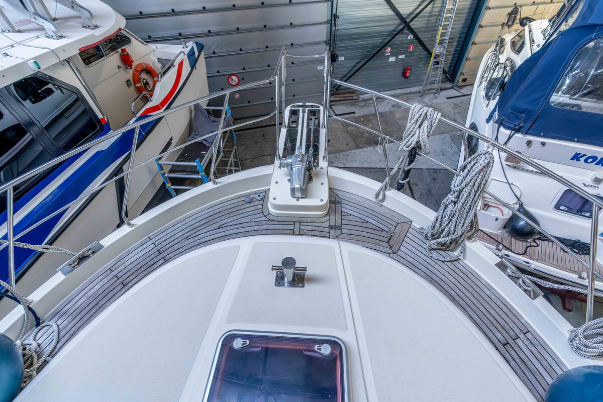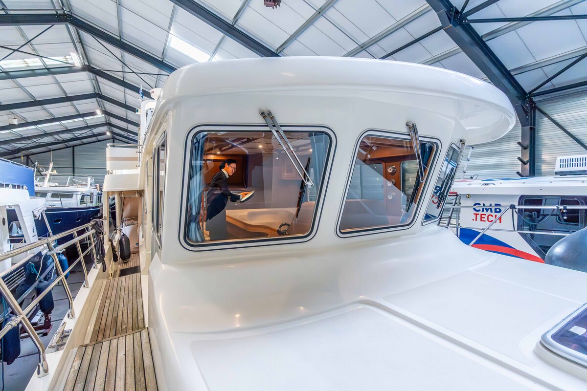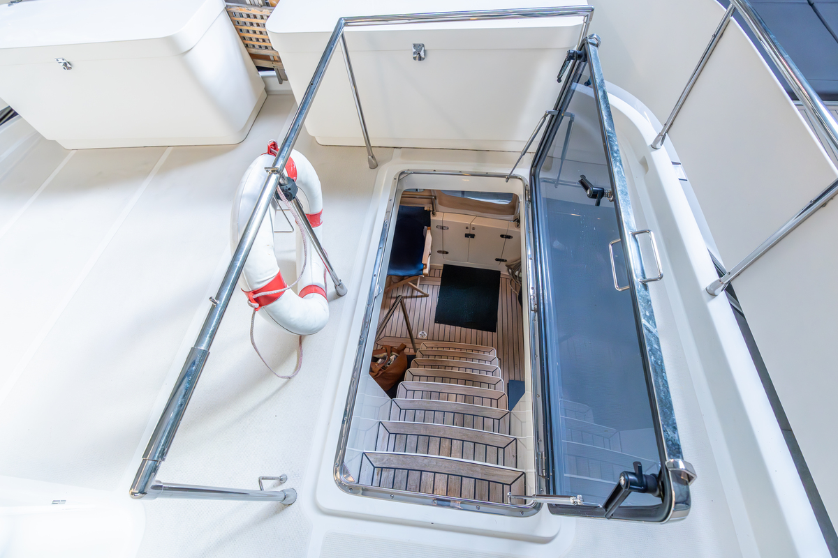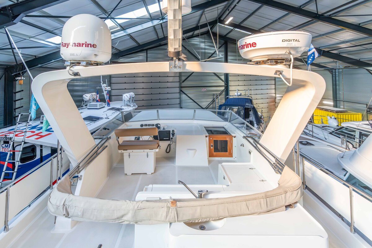 De installatiebeugel op de flybridge kan gestreken worden, waardoor de maximale doorvaarthoogte van 5.60 meter wordt verlaagd naar 3.50 meter.