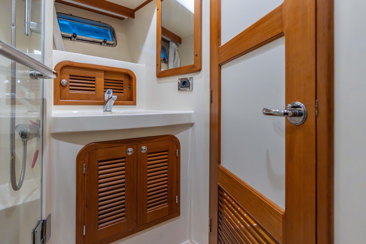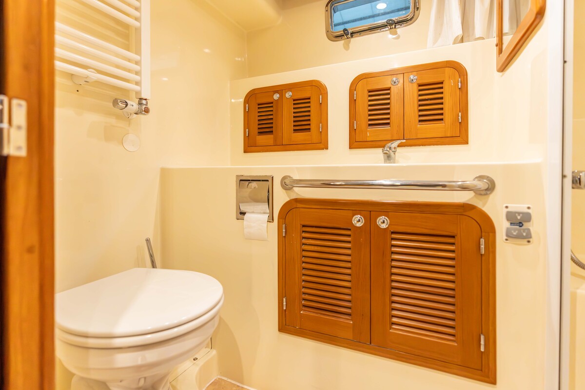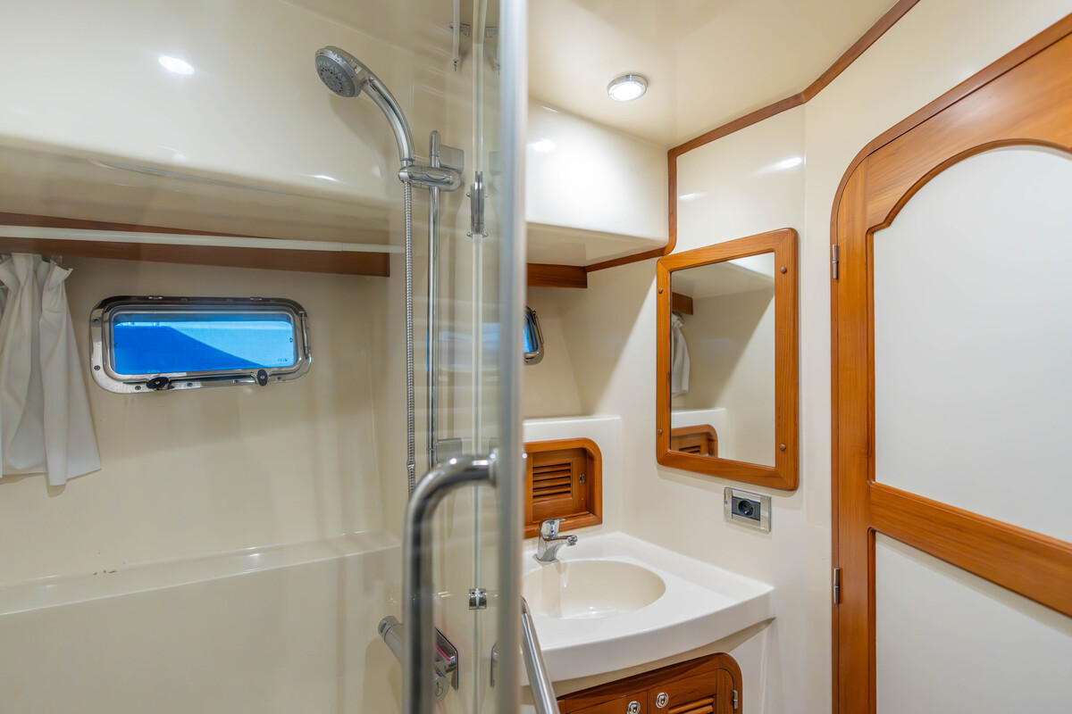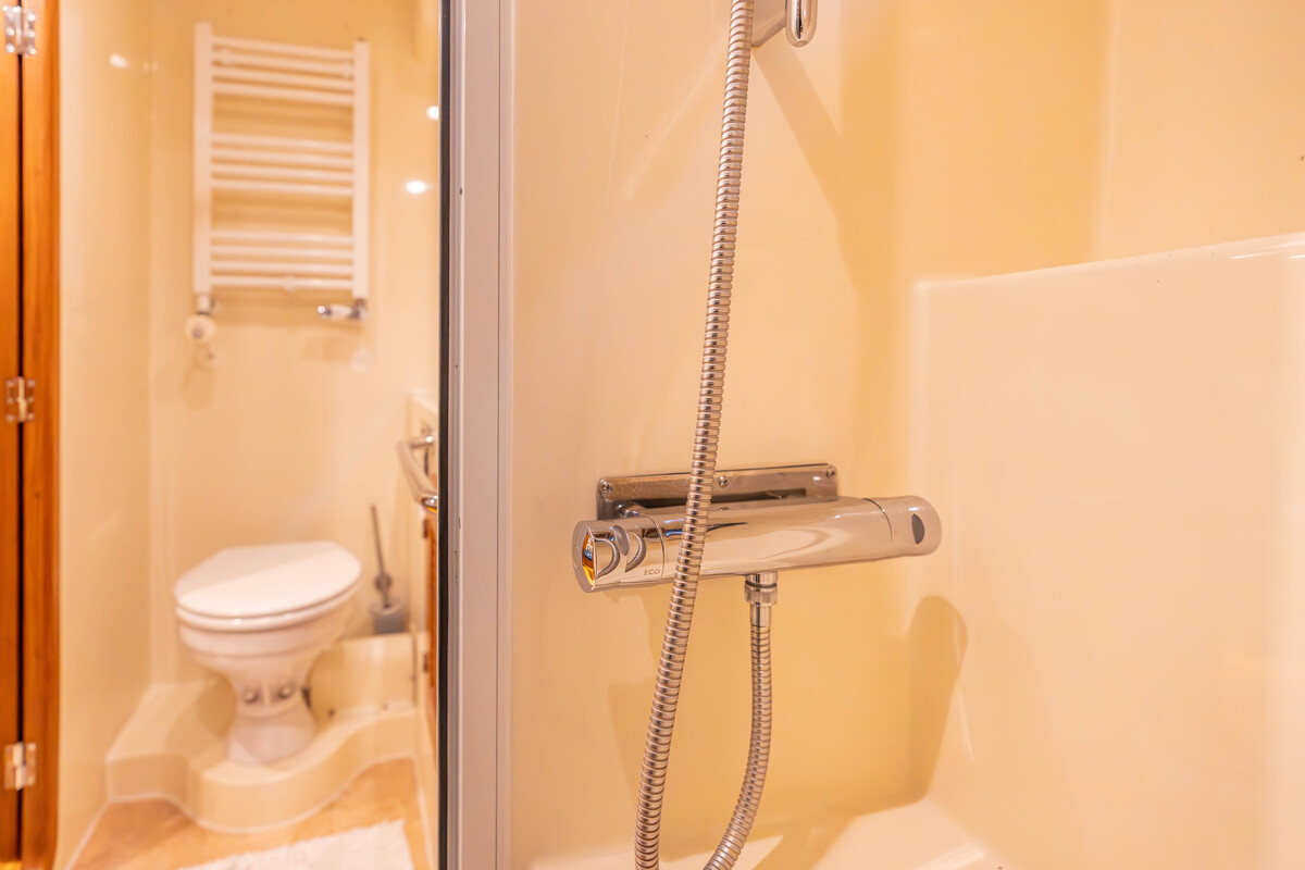 De 2 riante hutten met toilet en douche maken het verblijf aan boord zeer aangenaam. Er is veel kast- en opberg ruimte, evenals een wasmachine/droog combinatie.