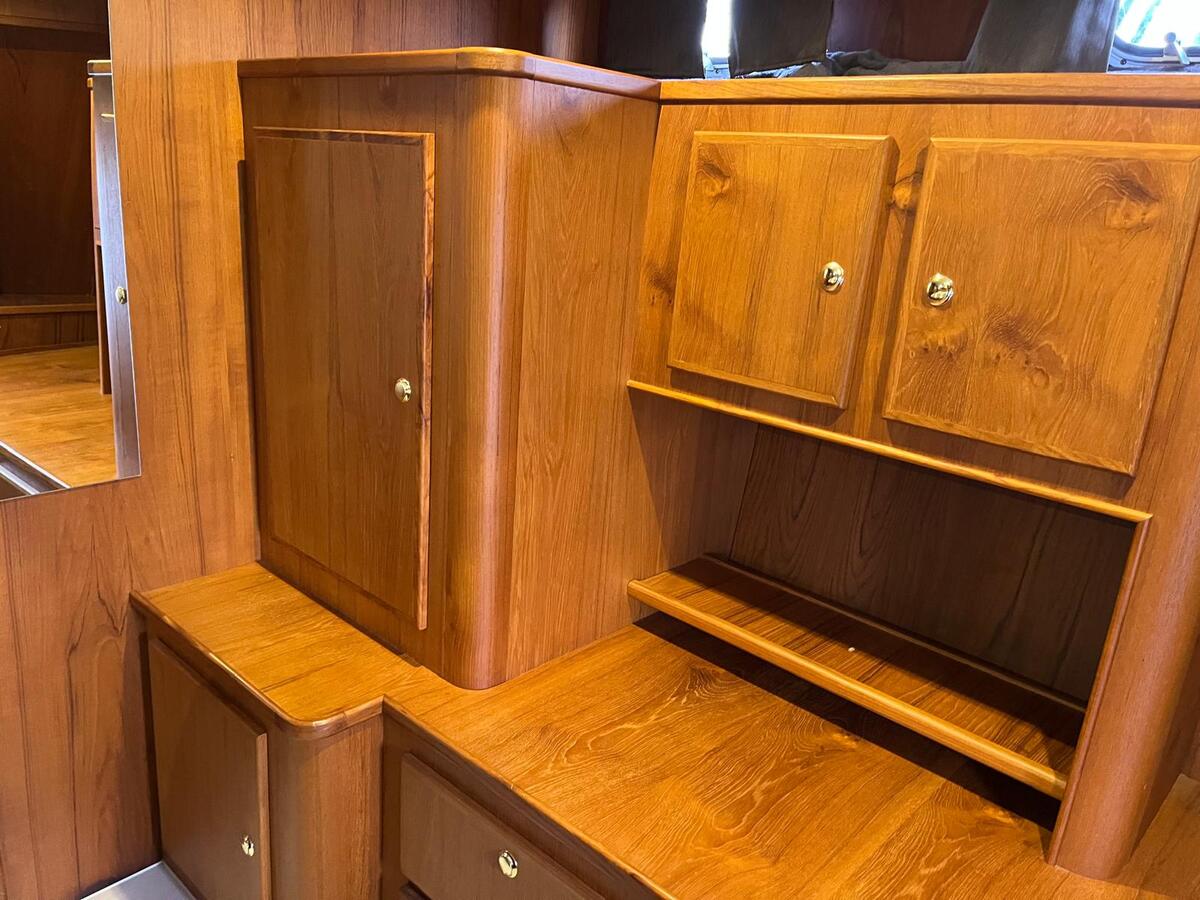 Kastenwand aan BB zijde. Achterkajuit met 2 pers. bed en voldoende kastruimte, aparte douche en toilet. Alle vloeren voorzien van nieuw pvc, alle doorvoeren en kogelkranen zijn vervangen in 2023.