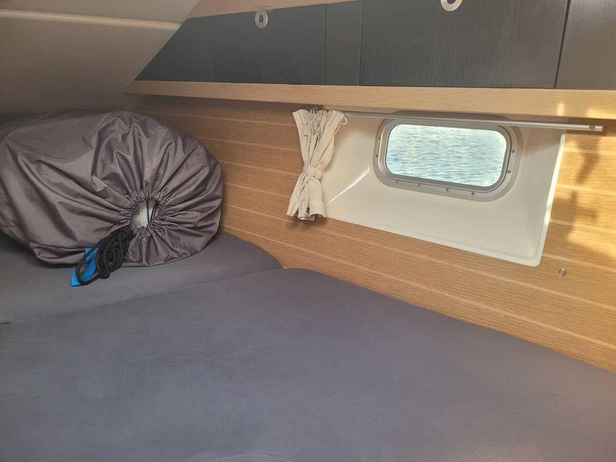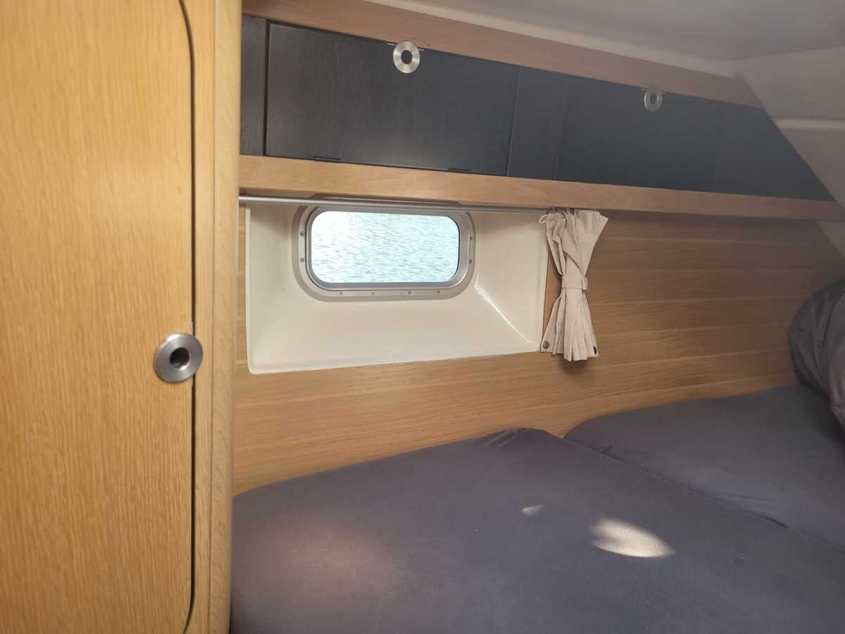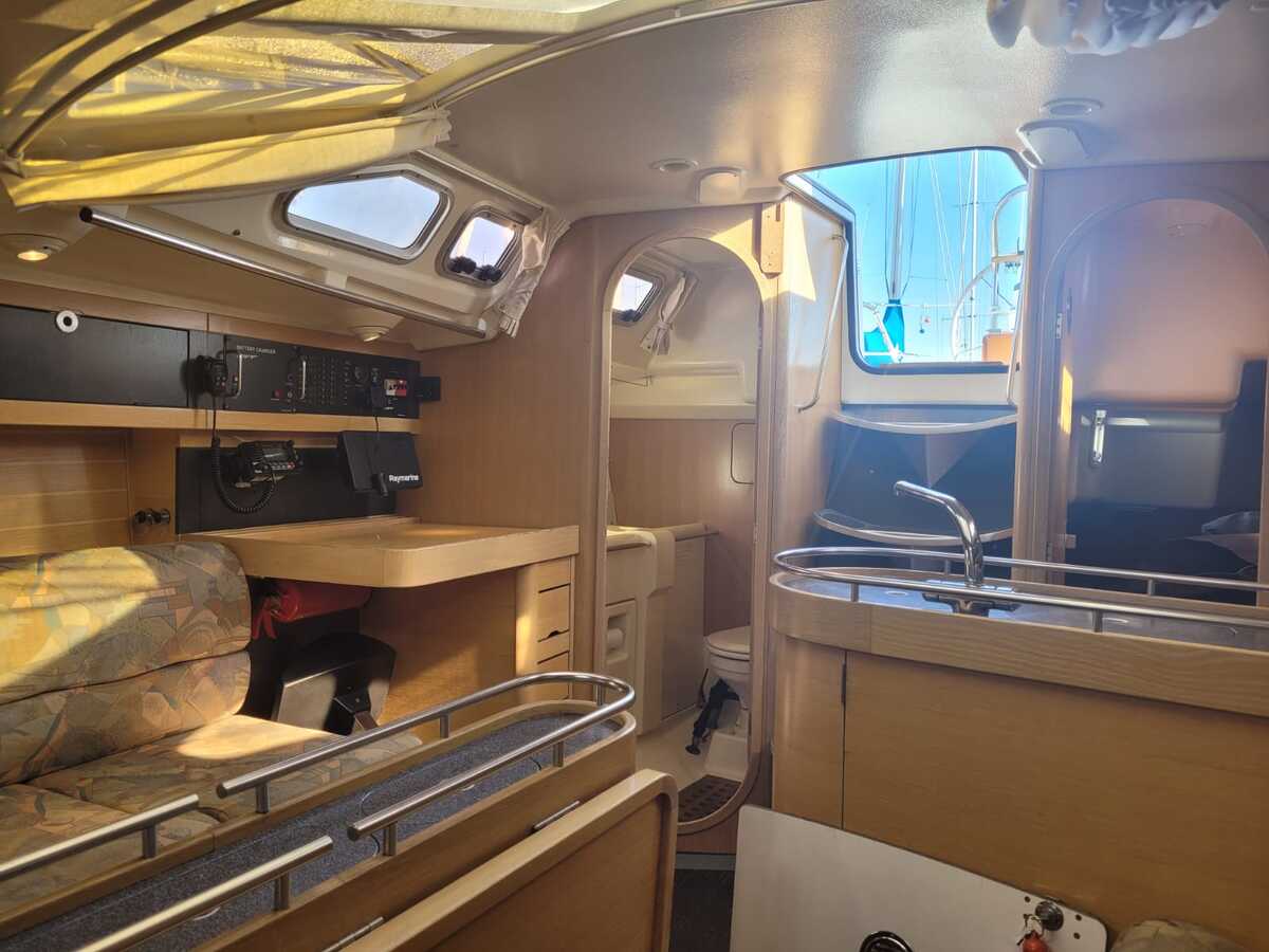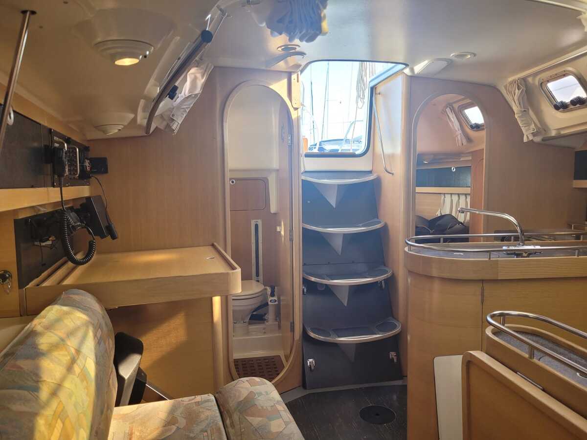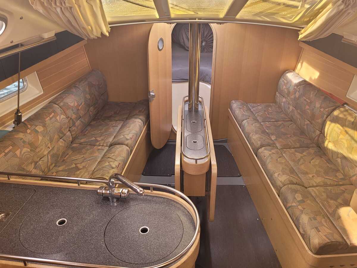 Ruime kuip, grote salon, licht interieur, natte cel aan stuurboord en een hut voorin.