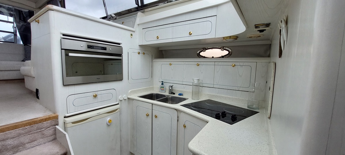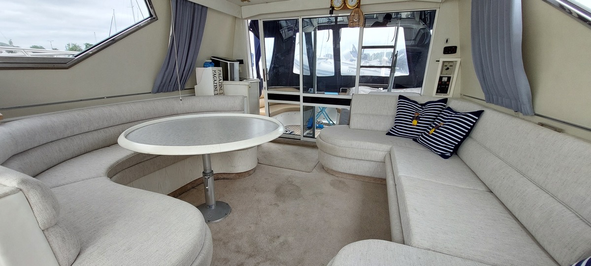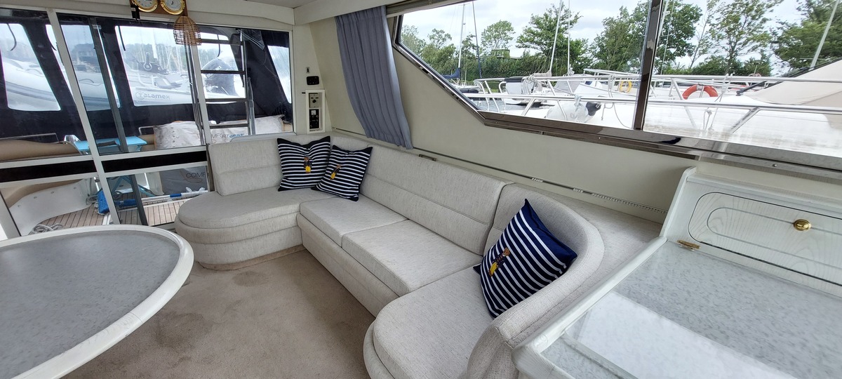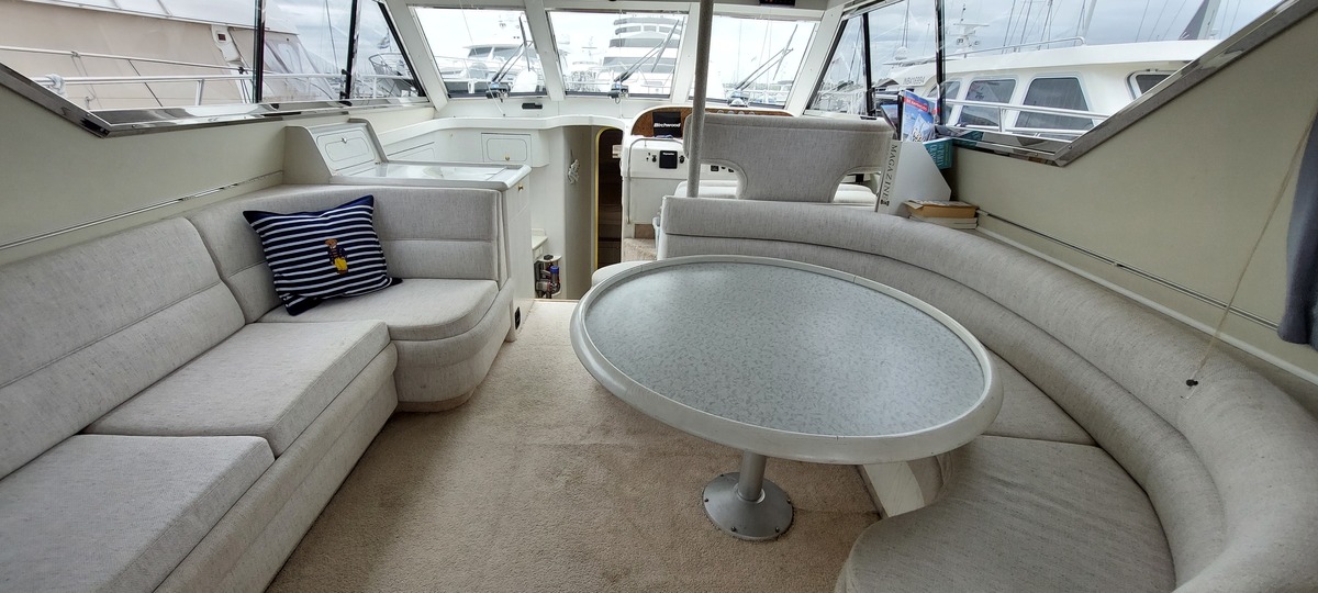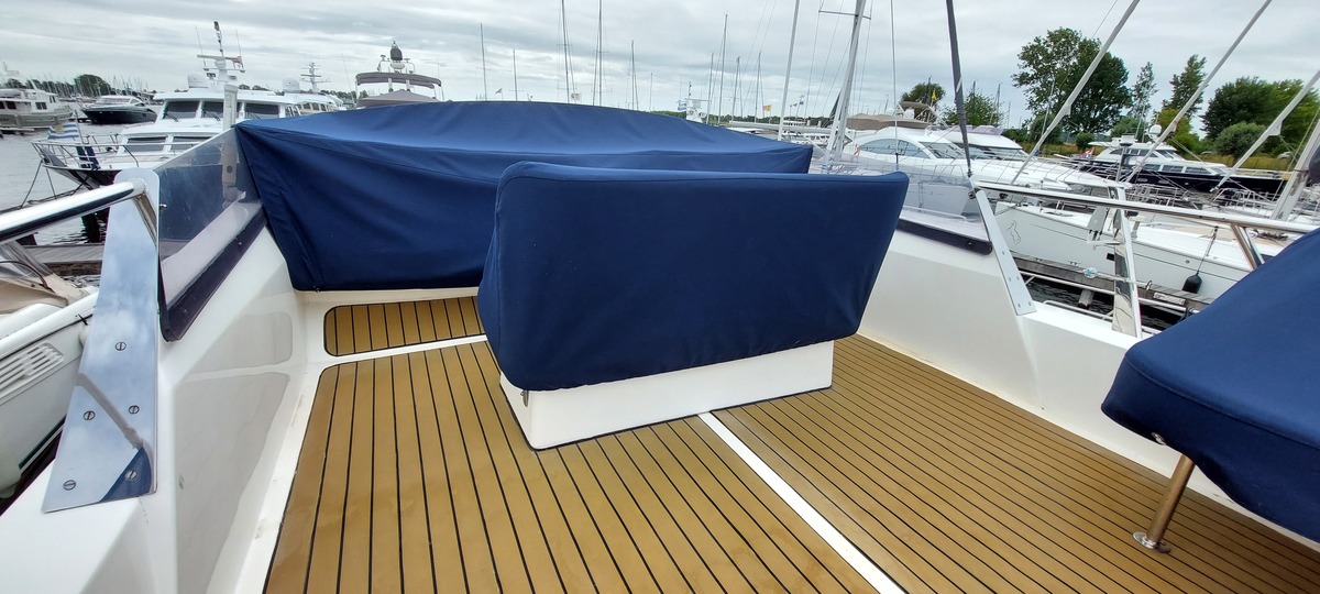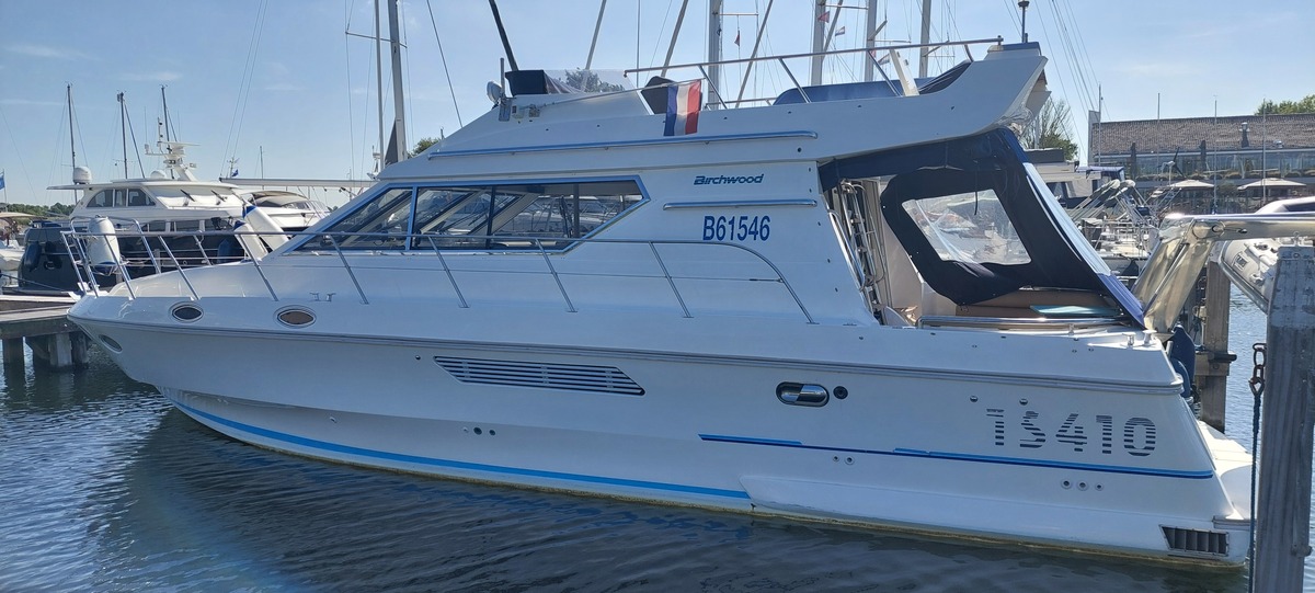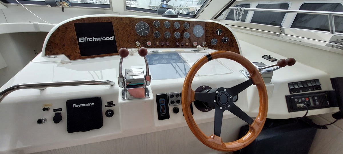Deze Birchwood TS41 (1993) is een stijlvol en robuust motorjacht met flybridge, gekenmerkt door haar tijdloze lijnen, brede romp en uitzonderlijk veel opbergruimte aan boord. Ideaal voor langere verblijven of comfortabel cruisen, zowel op binnenwateren als op zee.