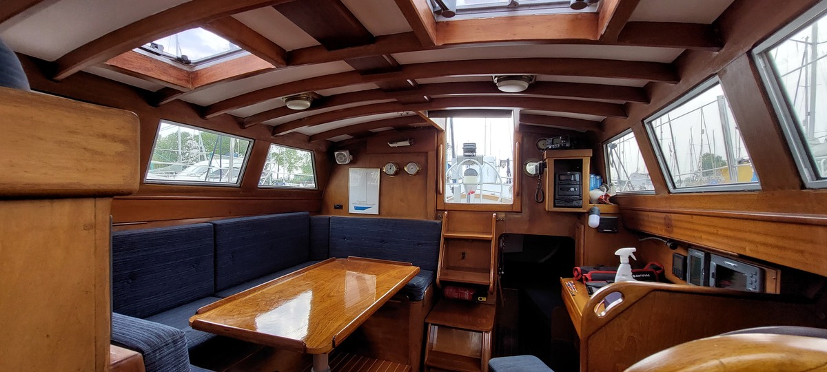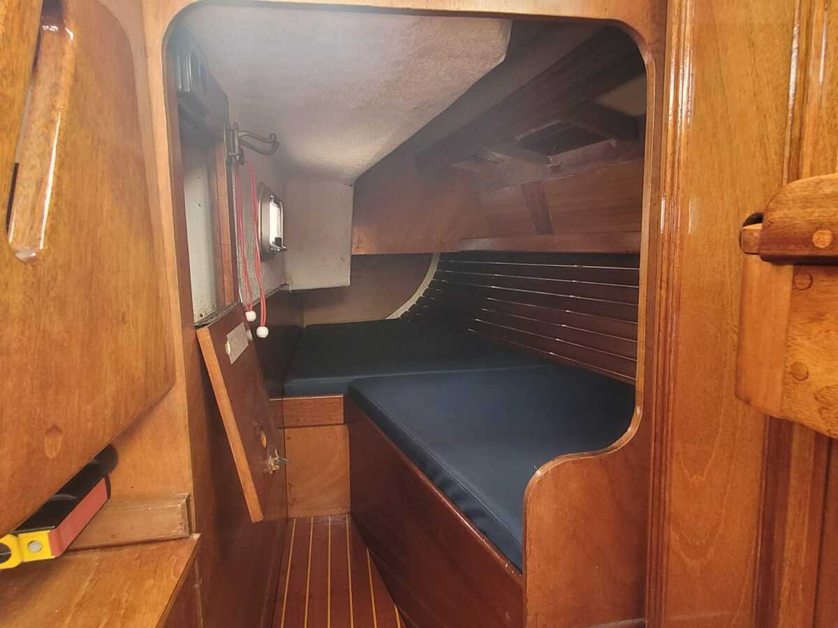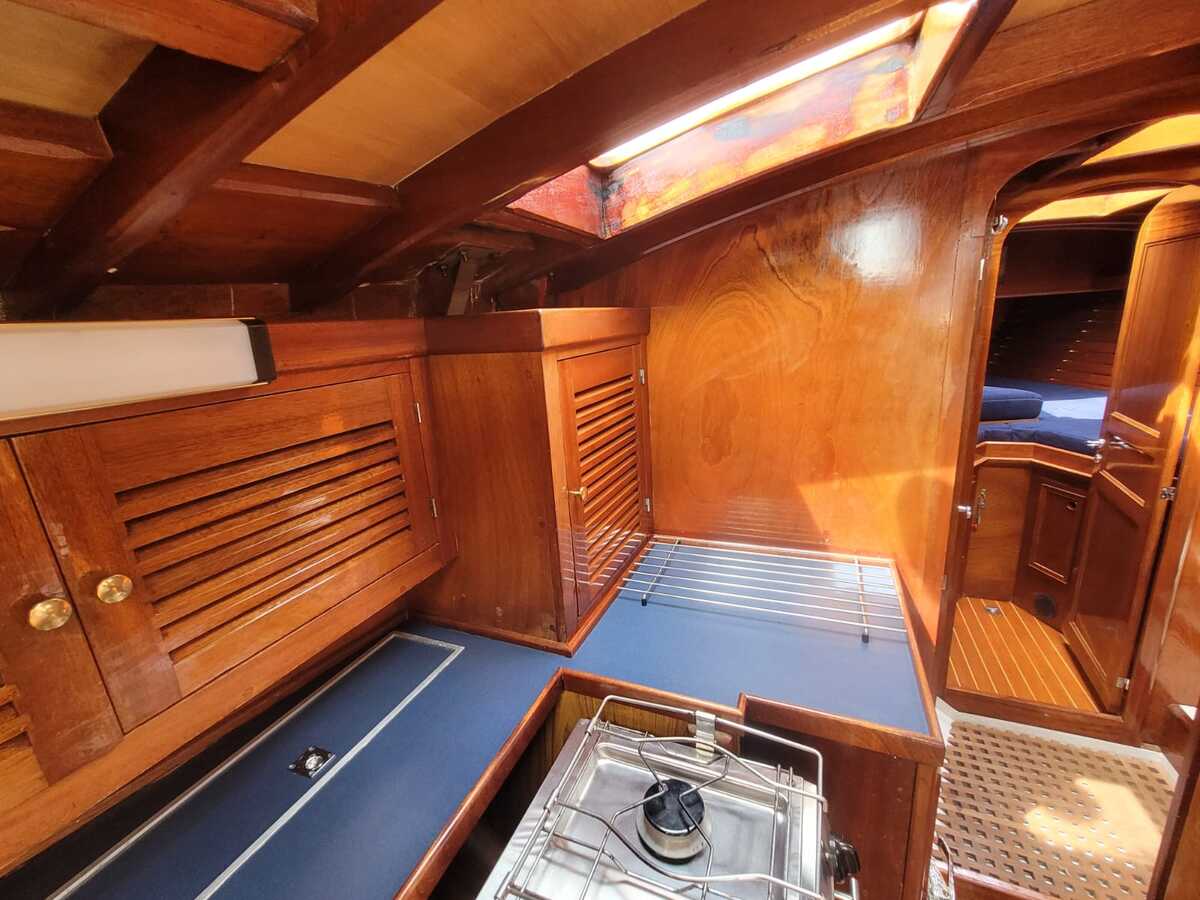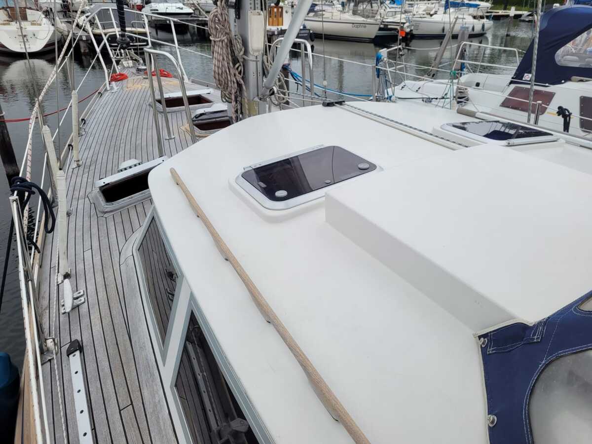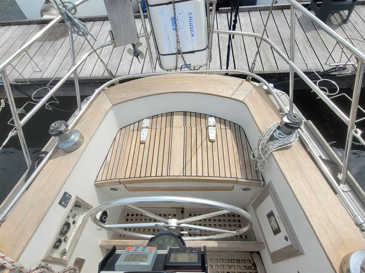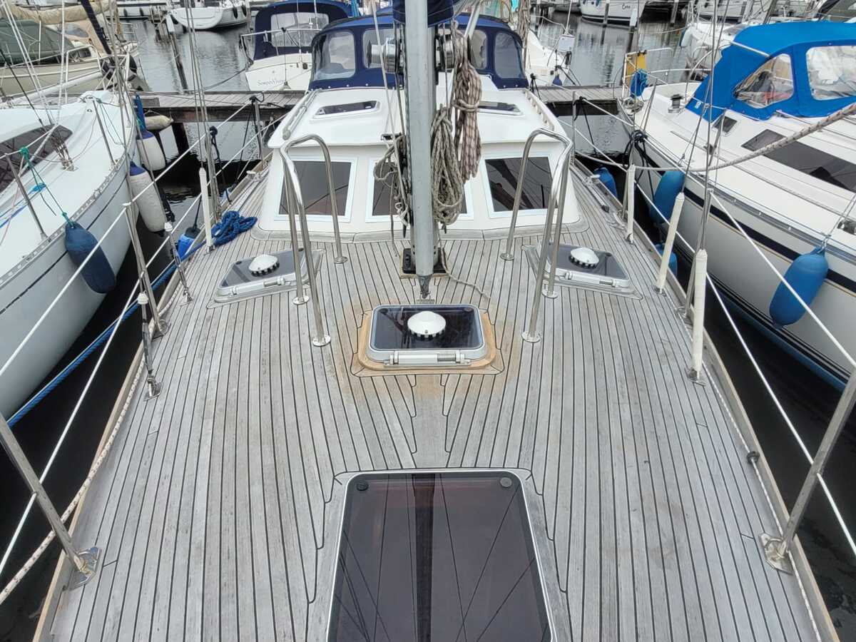 Het teakdek is vernieuwd in 2000, de naden opnieuw gerubberd in 2024.