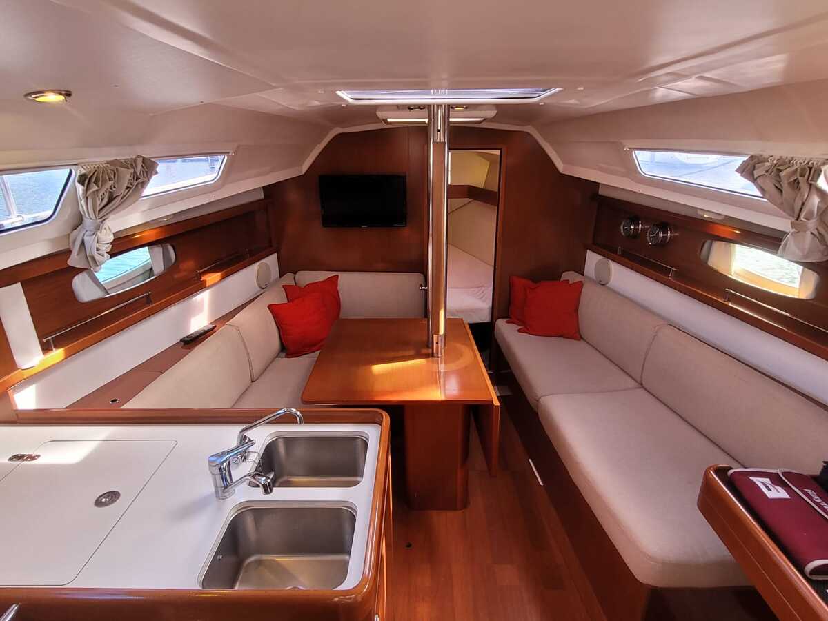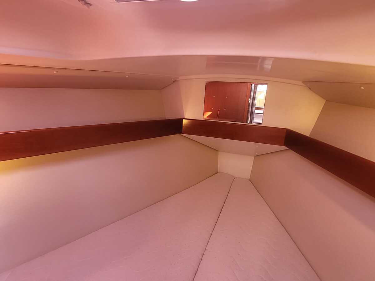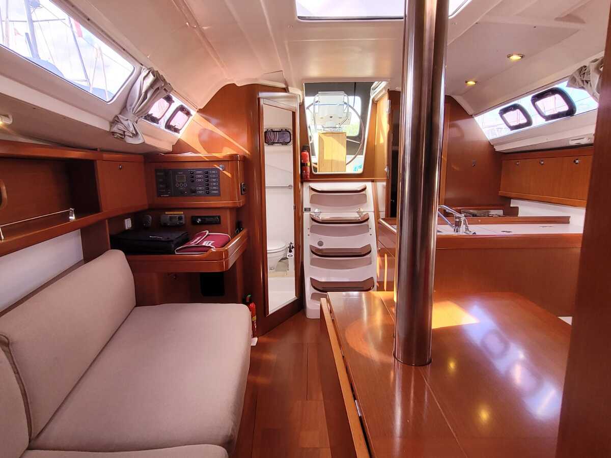 Binnen treft u een verrassend ruime en lichte salon, uitgevoerd in modern houtwerk met lichte stoffering. Dankzij de stahoogte is het interieur comfortabel in gebruik. Het schip biedt vier vaste slaapplaatsen verdeeld over twee hutten, plus twee extra slaapplaatsen in de salon.