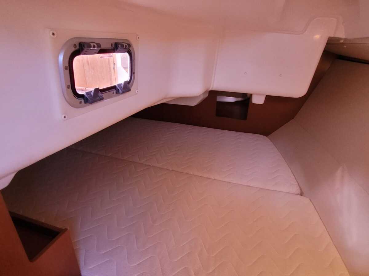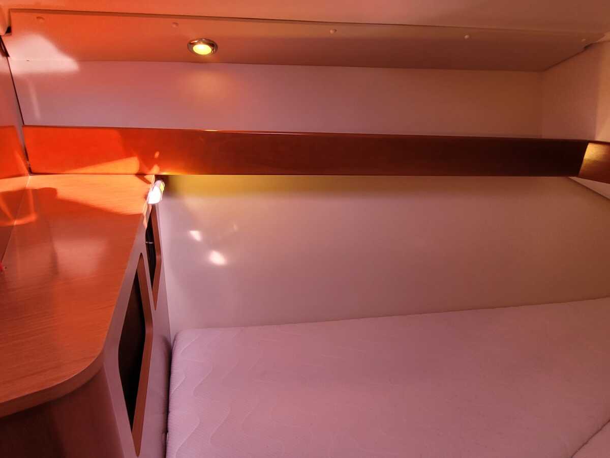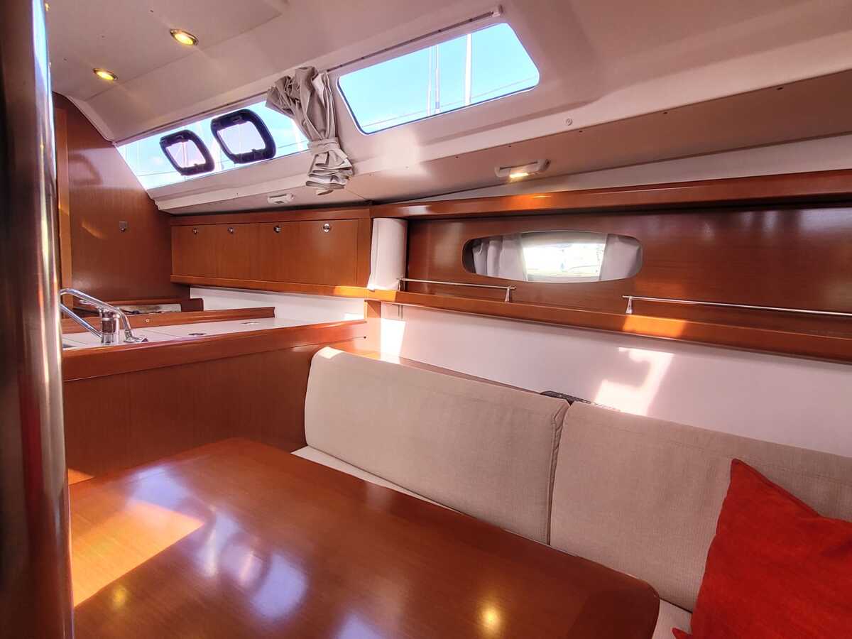 Binnen treft u een verrassend ruime en lichte salon, uitgevoerd in modern houtwerk met lichte stoffering. Dankzij de stahoogte is het interieur comfortabel in gebruik. Het schip biedt vier vaste slaapplaatsen verdeeld over twee hutten, plus twee extra slaapplaatsen in de salon.