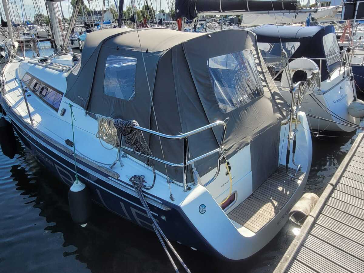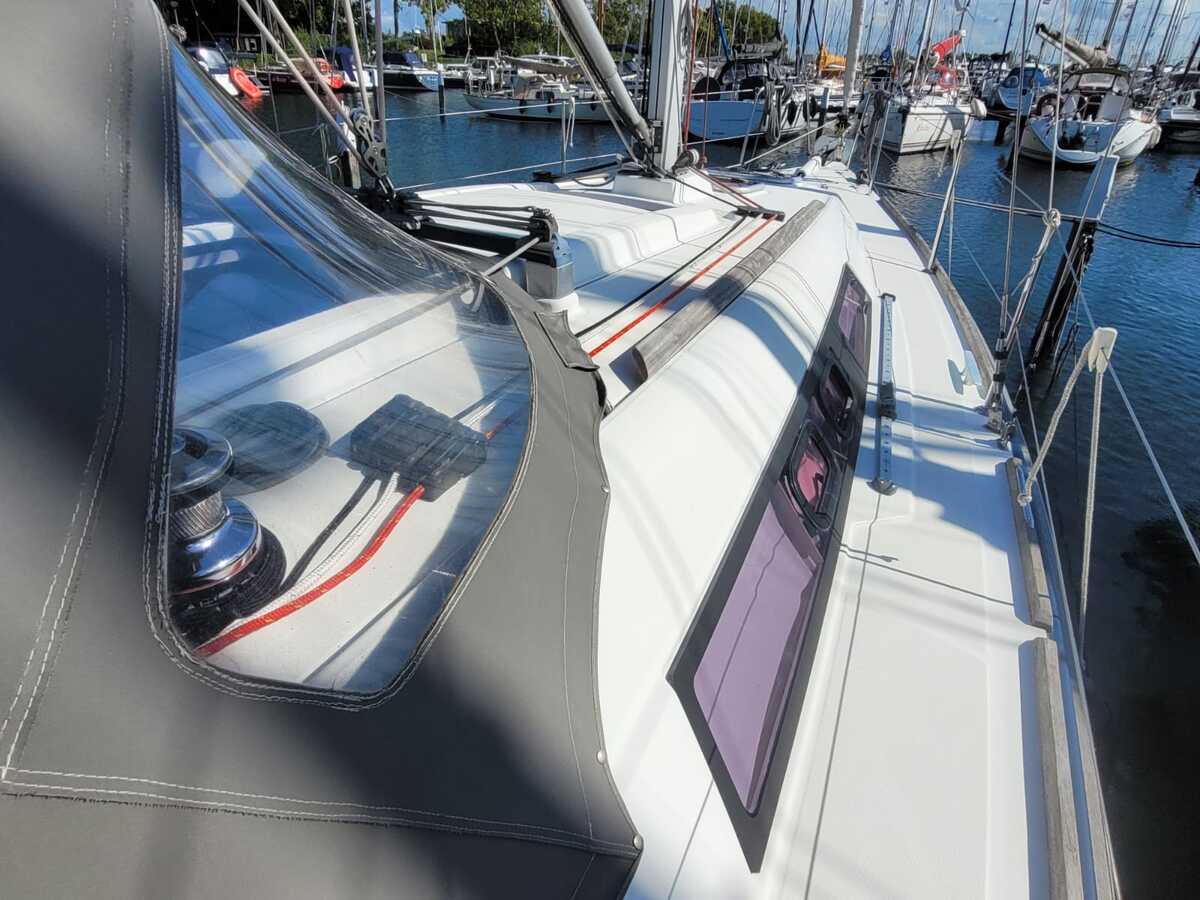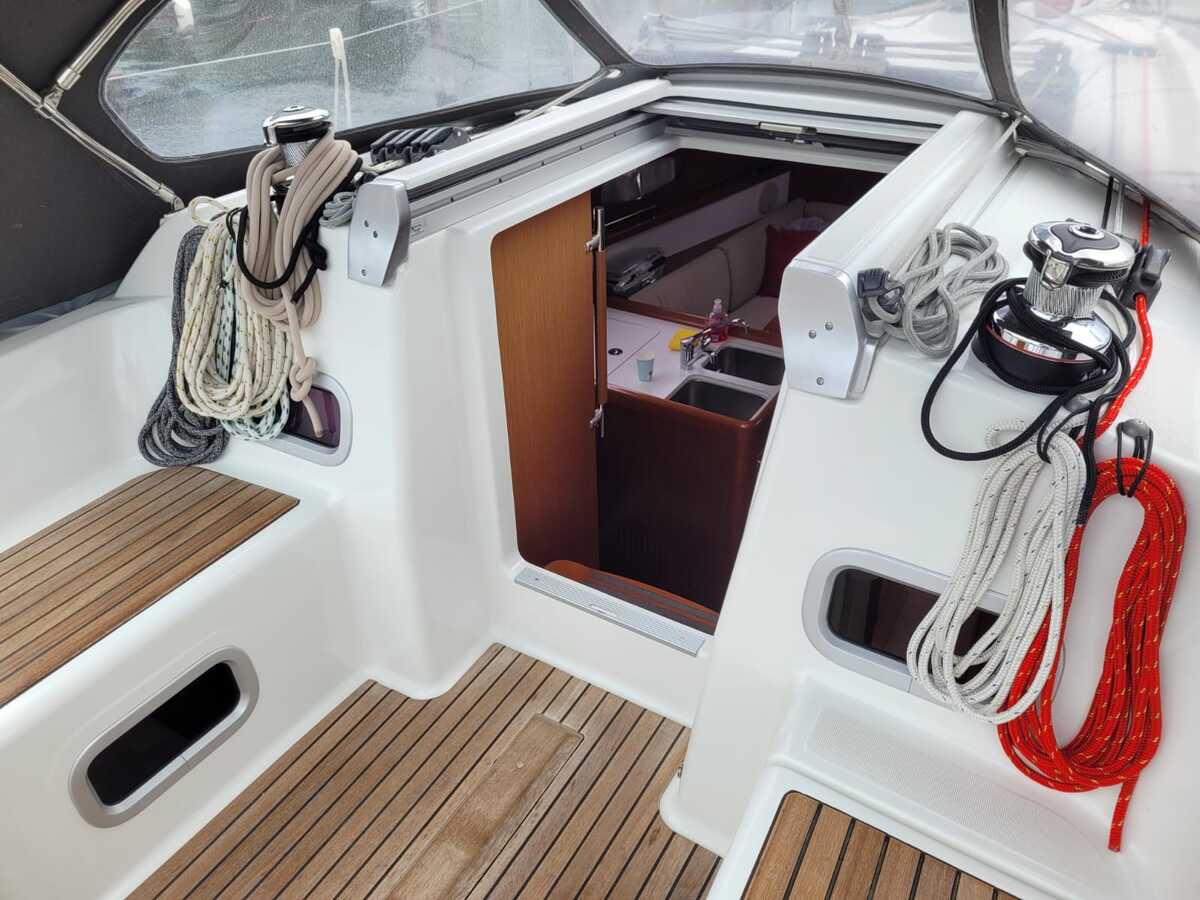 De rondspant romp is uitgevoerd in blauw Polyester, met een wit dek en een strakke, moderne uitstraling. In de kuip bevindt zich een stuurwielbesturing en dankzij de overzichtelijke lay-out is het schip eenvoudig te hanteren, ook met een kleine bemanning. De tuigage is fractioneel, met een Dacron grootzeil en genua (2010) en vier Harken selftailing lieren. Het grootzeil heeft latten en een huik; de genua is voorzien van een rolsysteem.