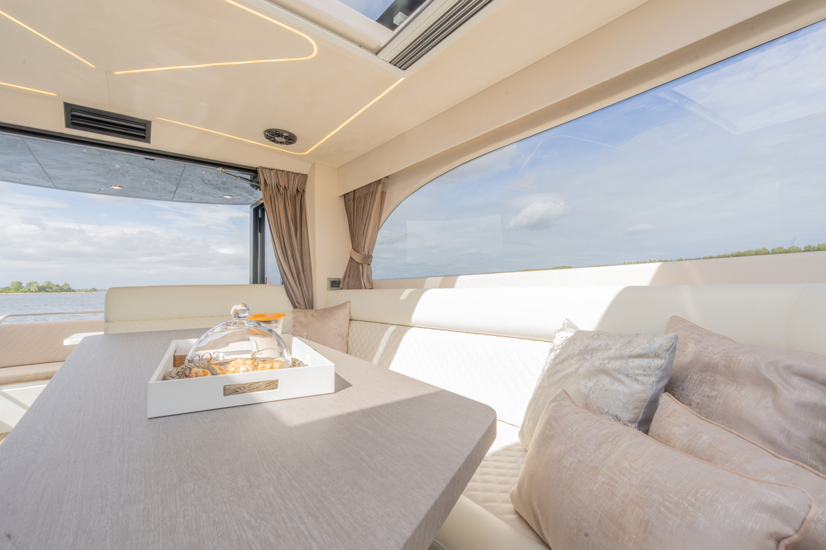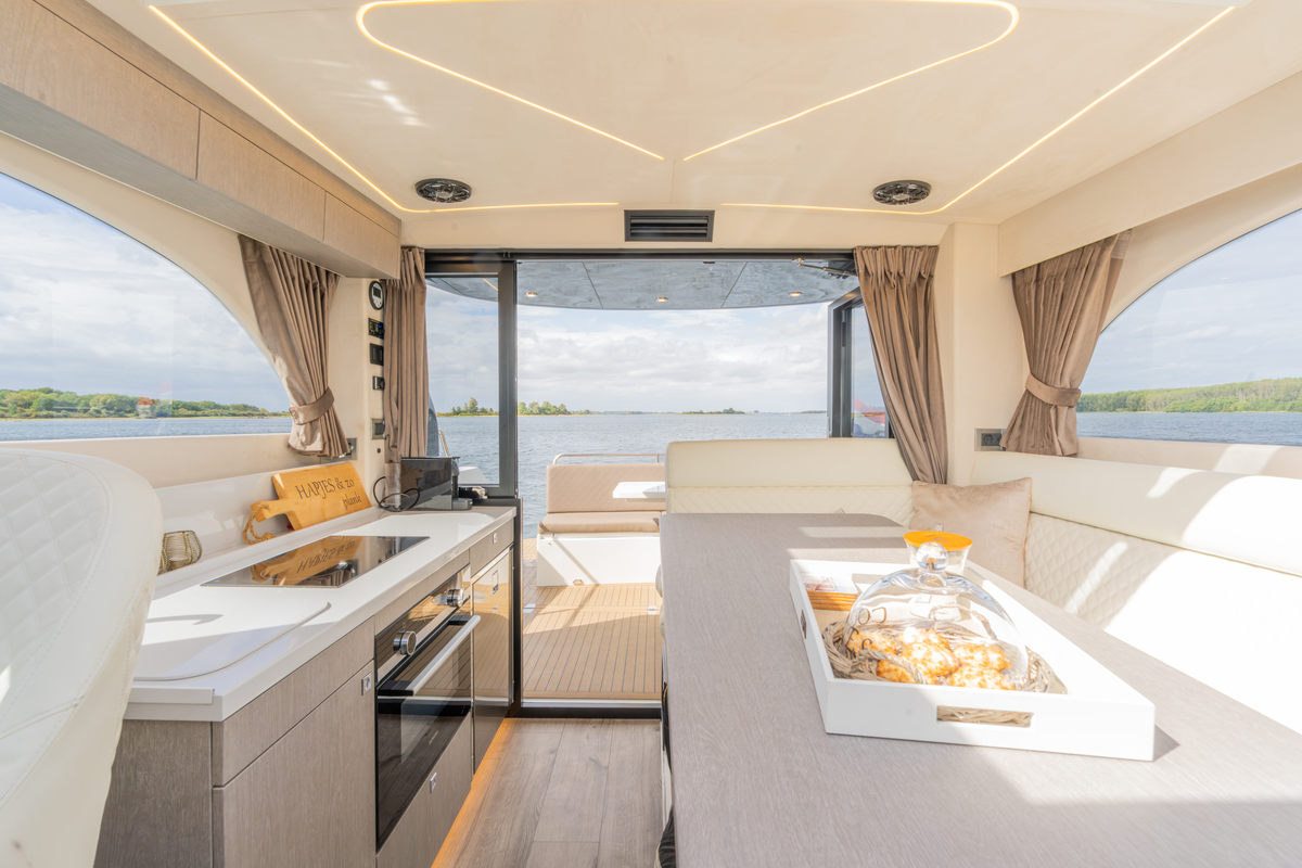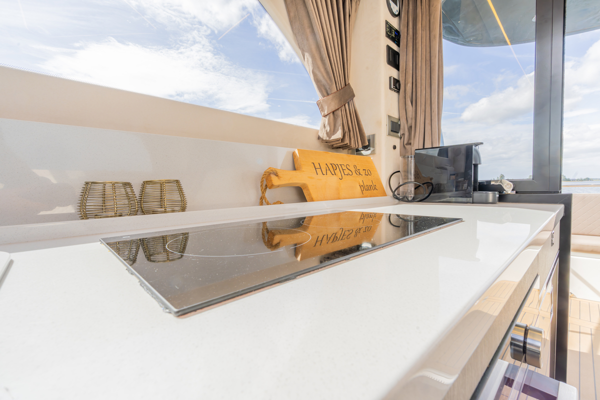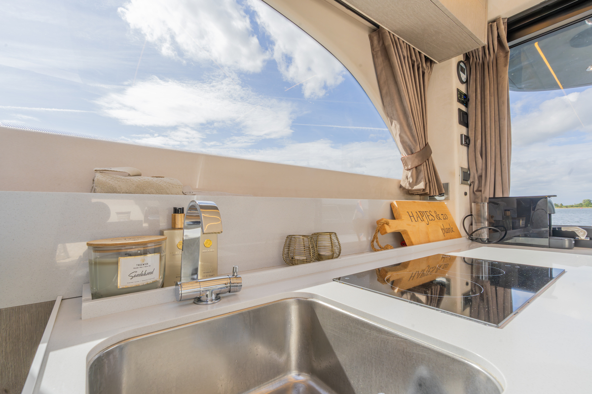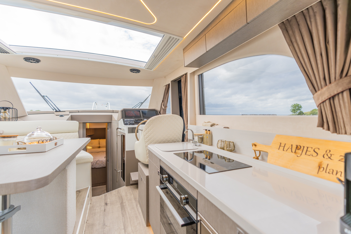 Binnen treft u een modern interieur in Lati Grijs hout, luxe wit lederen bekleding en een royale salon met veel lichtinval. Het jacht biedt twee aparte hutten met in totaal 4 vaste slaapplaatsen (plus 2 extra). De ruime badkamer beschikt over een aparte douchecabine en elektrisch toilet. De keuken is volledig uitgerust met o.a. ATAG 2-pits kookplaat, elektrische oven, combimagnetron, koelkast met vriesvak en ruime opbergruimte. Voor extra comfort zijn aanwezig Webasto heteluchtverwarming, airconditioning (8.000 BTU), boiler (40 l), buitendouche op zwemplateau en zelfs een Webasto elektrisch schuifdak.