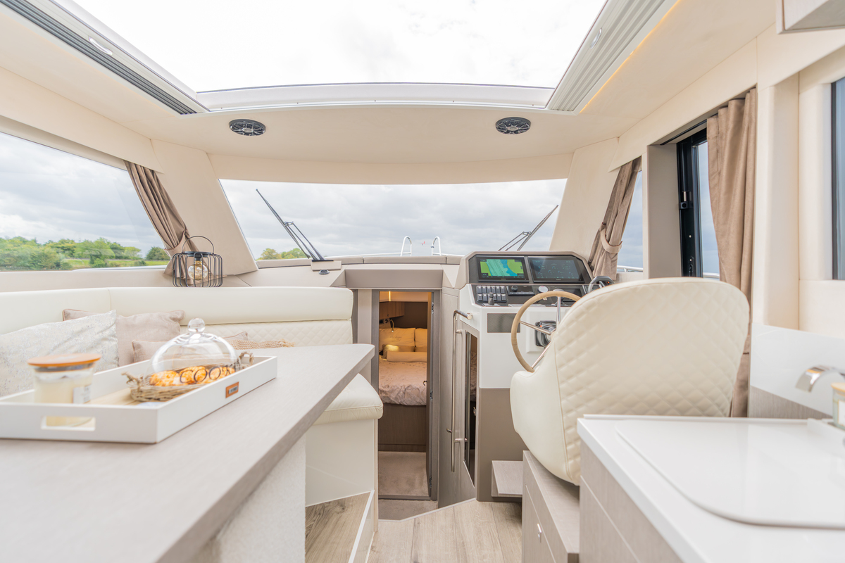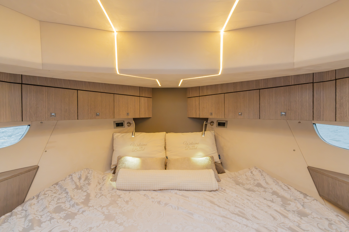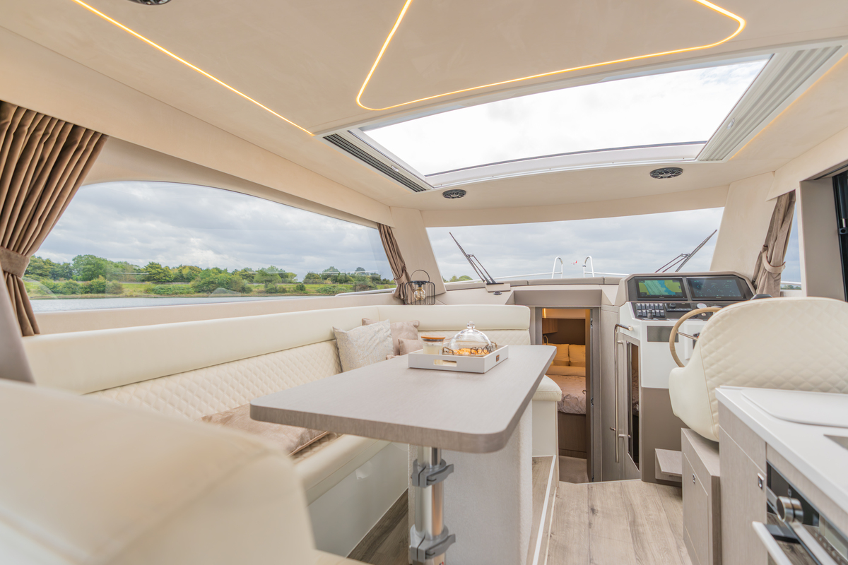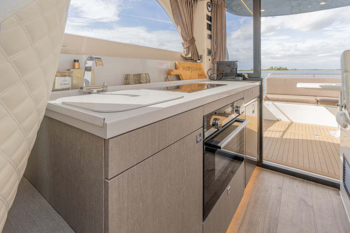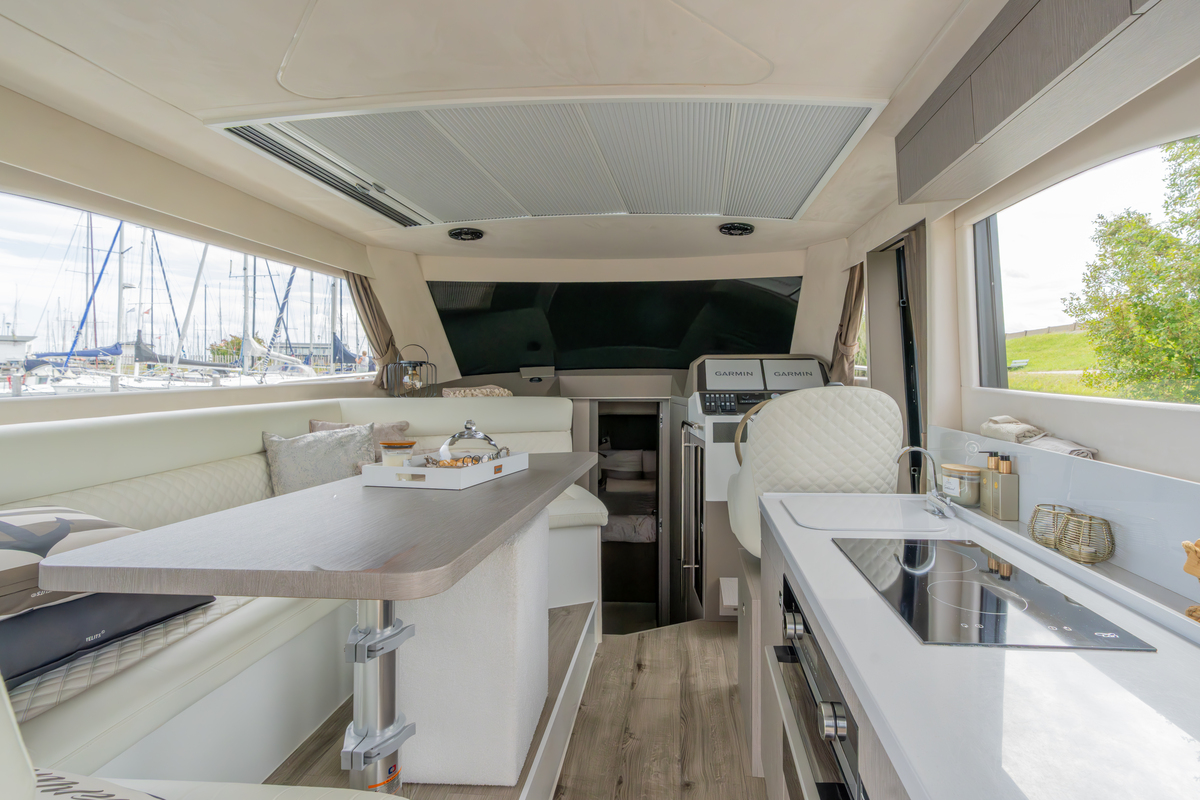 Binnen treft u een modern interieur in Lati Grijs hout, luxe wit lederen bekleding en een royale salon met veel lichtinval. Het jacht biedt twee aparte hutten met in totaal 4 vaste slaapplaatsen (plus 2 extra). De ruime badkamer beschikt over een aparte douchecabine en elektrisch toilet. De keuken is volledig uitgerust met o.a. ATAG 2-pits kookplaat, elektrische oven, combimagnetron, koelkast met vriesvak en ruime opbergruimte. Voor extra comfort zijn aanwezig Webasto heteluchtverwarming, airconditioning (8.000 BTU), boiler (40 l), buitendouche op zwemplateau en zelfs een Webasto elektrisch schuifdak.