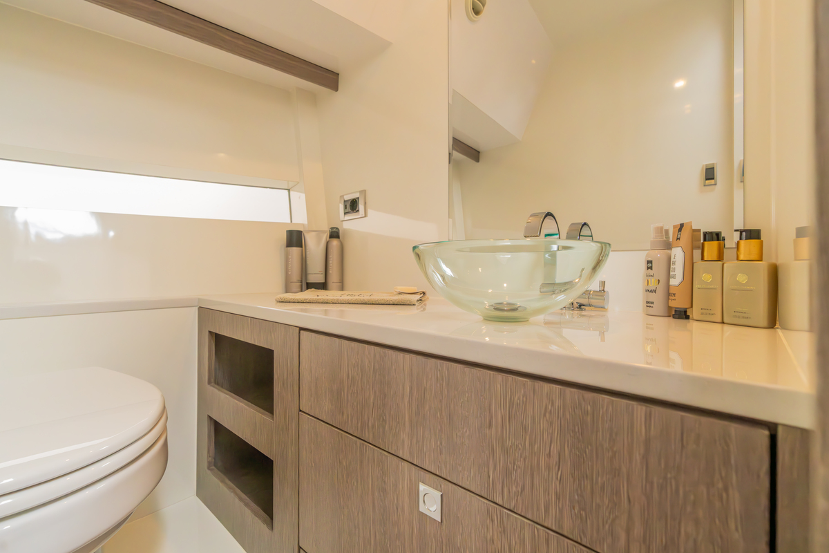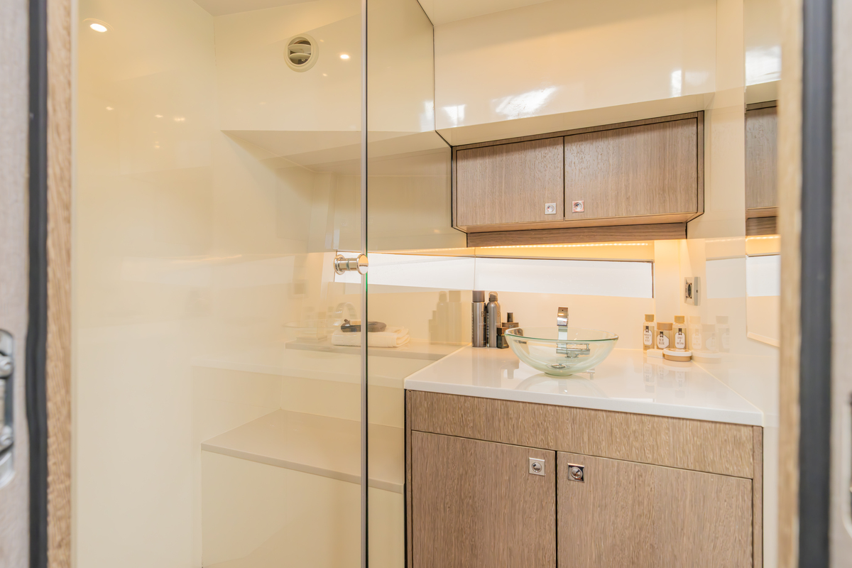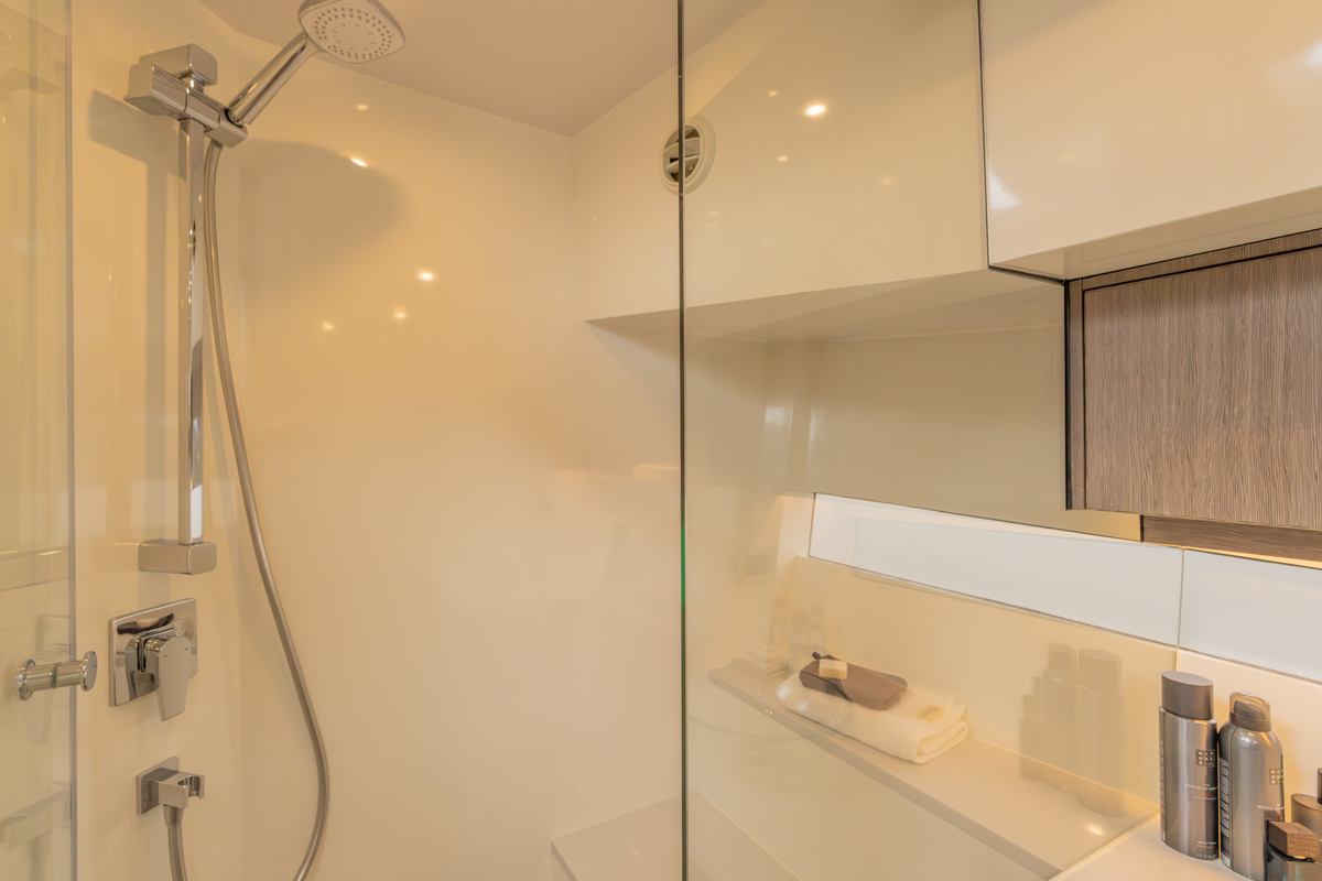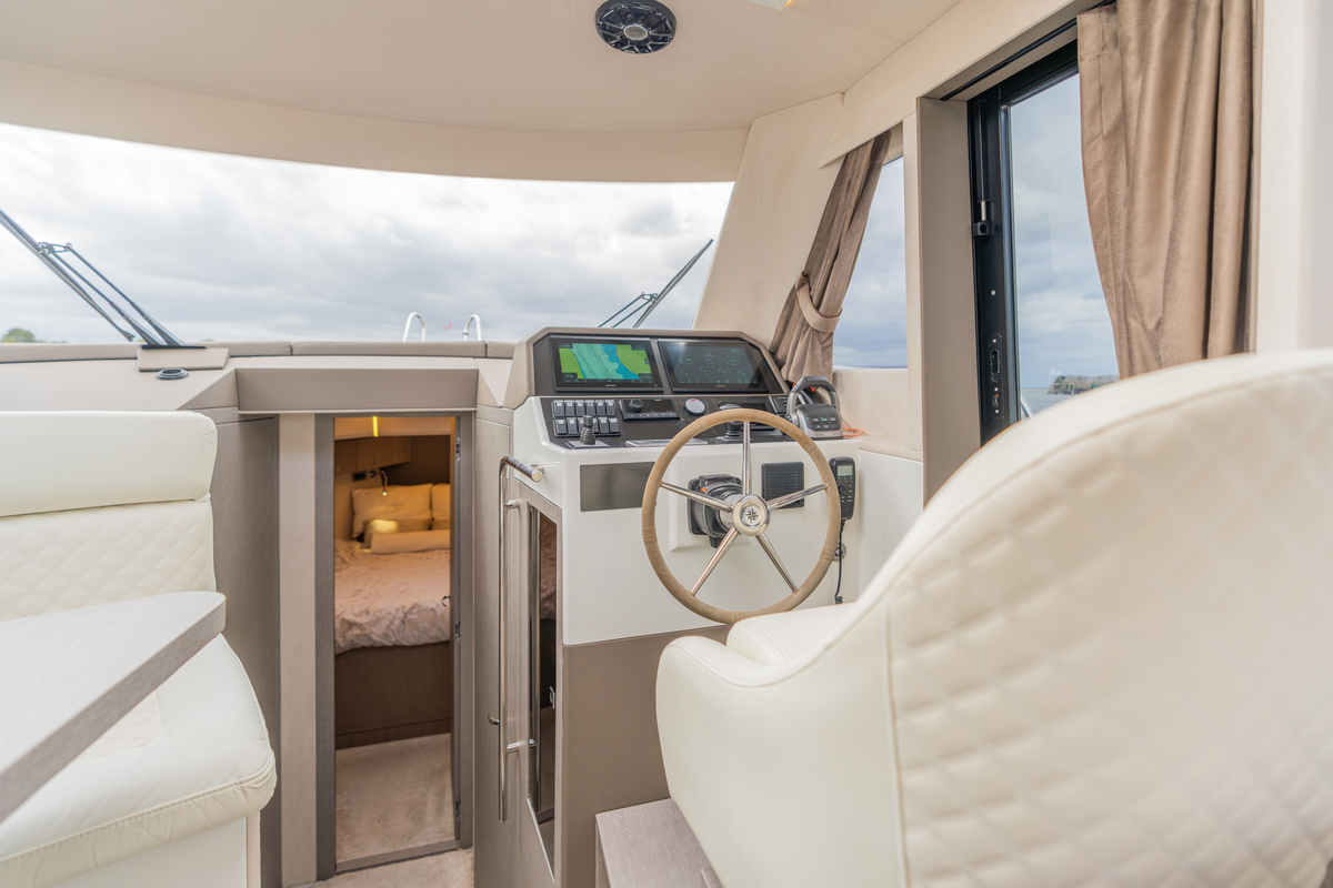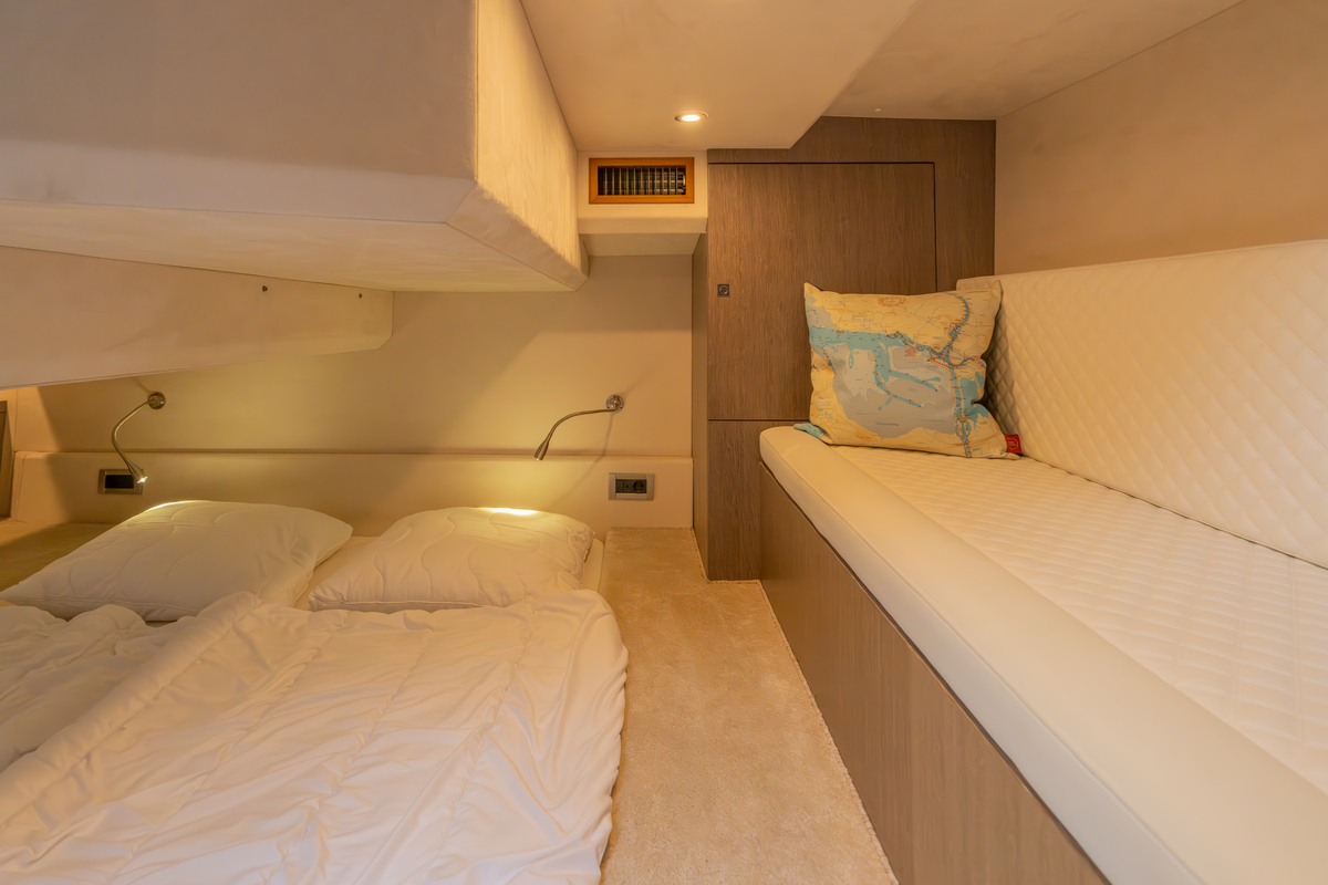 Binnen treft u een modern interieur in Lati Grijs hout, luxe wit lederen bekleding en een royale salon met veel lichtinval. Het jacht biedt twee aparte hutten met in totaal 4 vaste slaapplaatsen (plus 2 extra). De ruime badkamer beschikt over een aparte douchecabine en elektrisch toilet. De keuken is volledig uitgerust met o.a. ATAG 2-pits kookplaat, elektrische oven, combimagnetron, koelkast met vriesvak en ruime opbergruimte. Voor extra comfort zijn aanwezig Webasto heteluchtverwarming, airconditioning (8.000 BTU), boiler (40 l), buitendouche op zwemplateau en zelfs een Webasto elektrisch schuifdak.