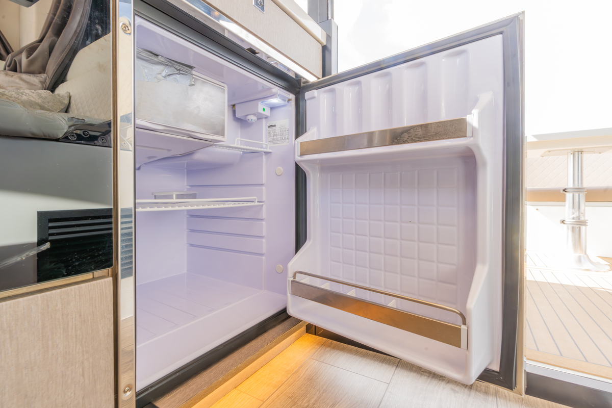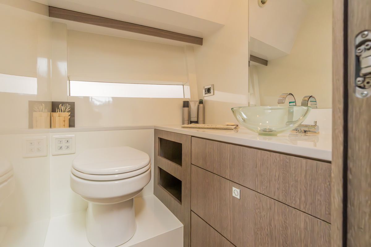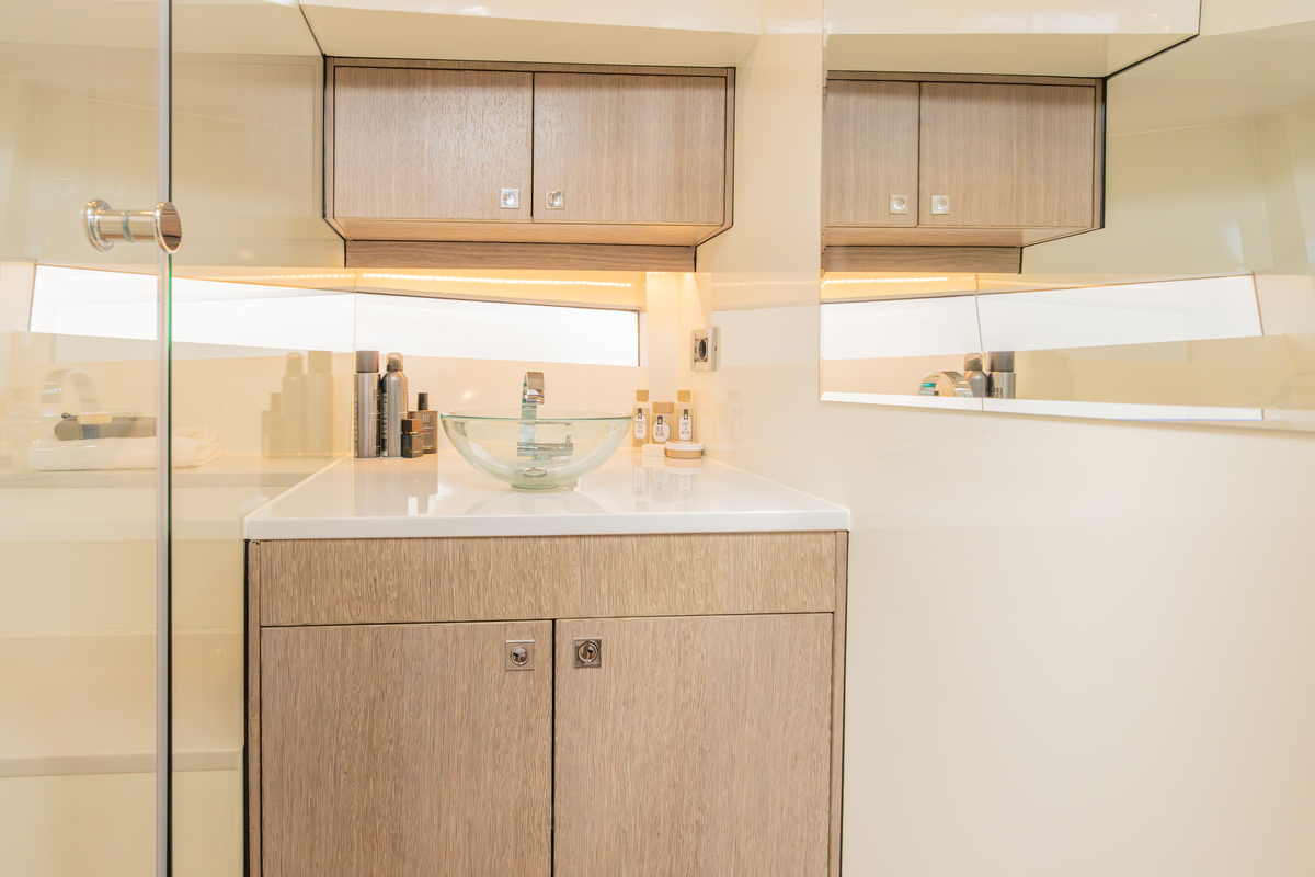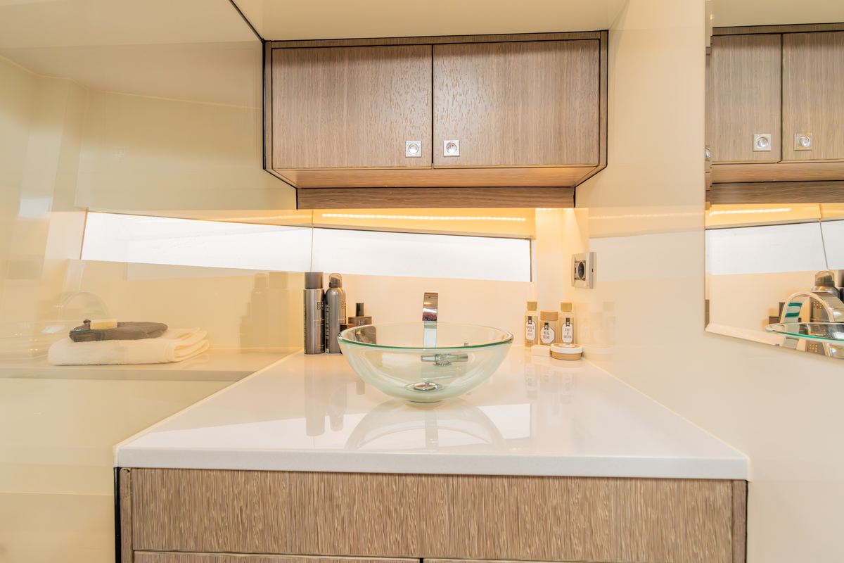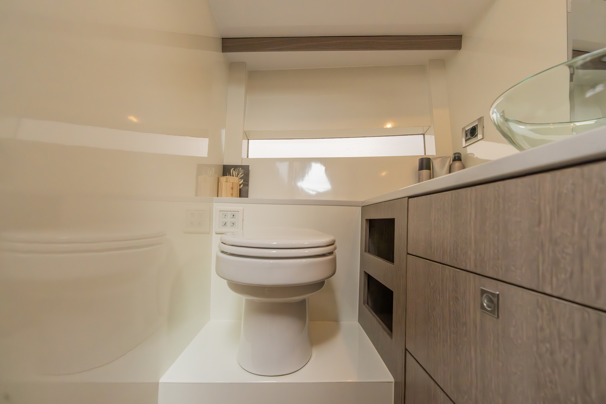 Binnen treft u een modern interieur in Lati Grijs hout, luxe wit lederen bekleding en een royale salon met veel lichtinval. Het jacht biedt twee aparte hutten met in totaal 4 vaste slaapplaatsen (plus 2 extra). De ruime badkamer beschikt over een aparte douchecabine en elektrisch toilet. De keuken is volledig uitgerust met o.a. ATAG 2-pits kookplaat, elektrische oven, combimagnetron, koelkast met vriesvak en ruime opbergruimte. Voor extra comfort zijn aanwezig Webasto heteluchtverwarming, airconditioning (8.000 BTU), boiler (40 l), buitendouche op zwemplateau en zelfs een Webasto elektrisch schuifdak.