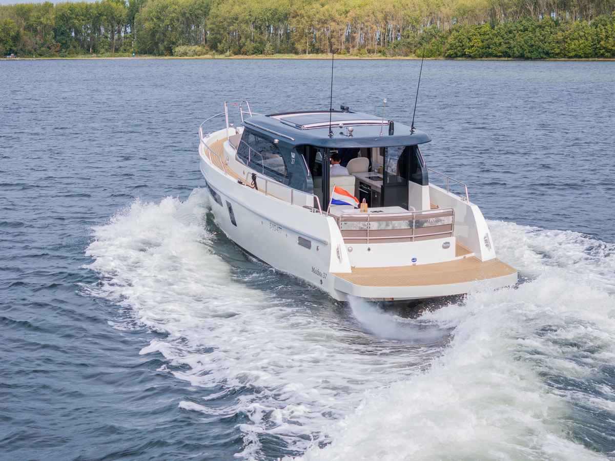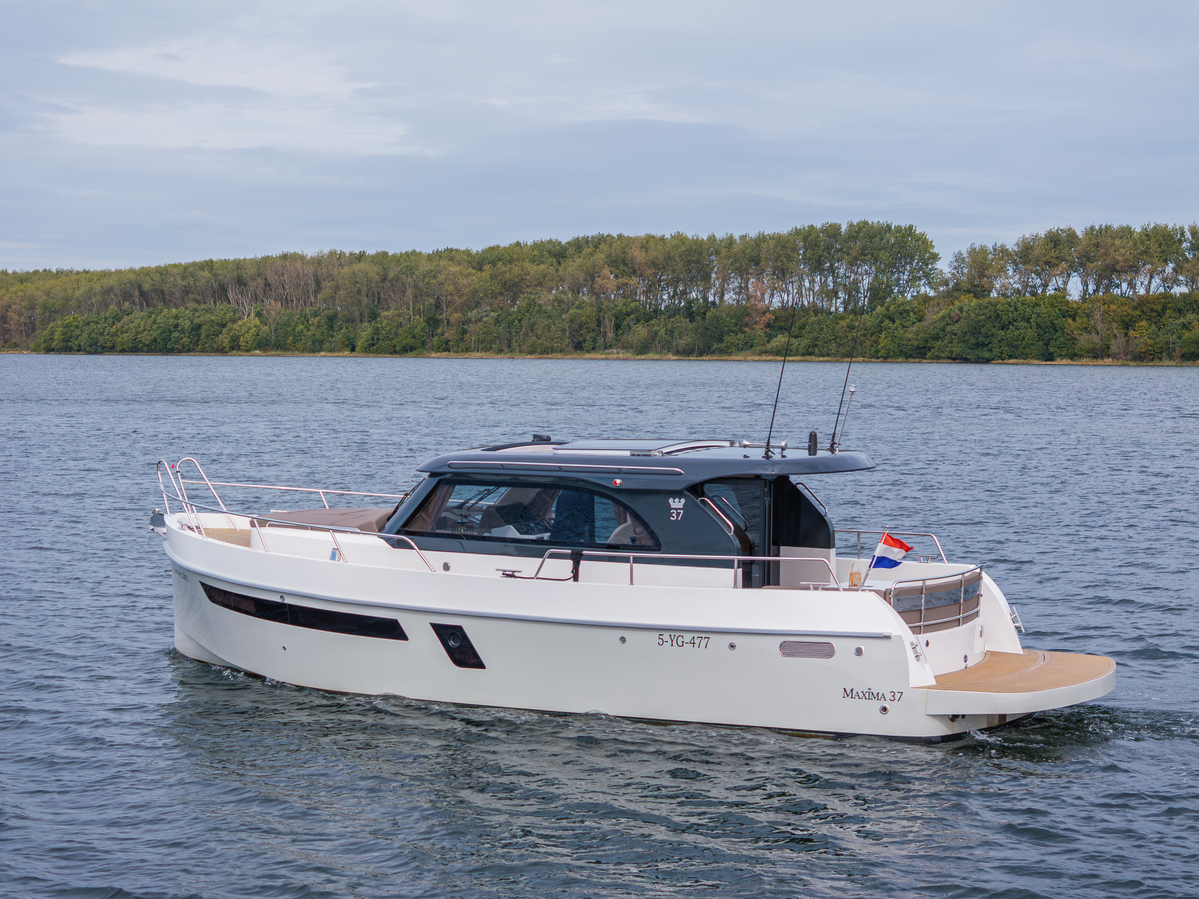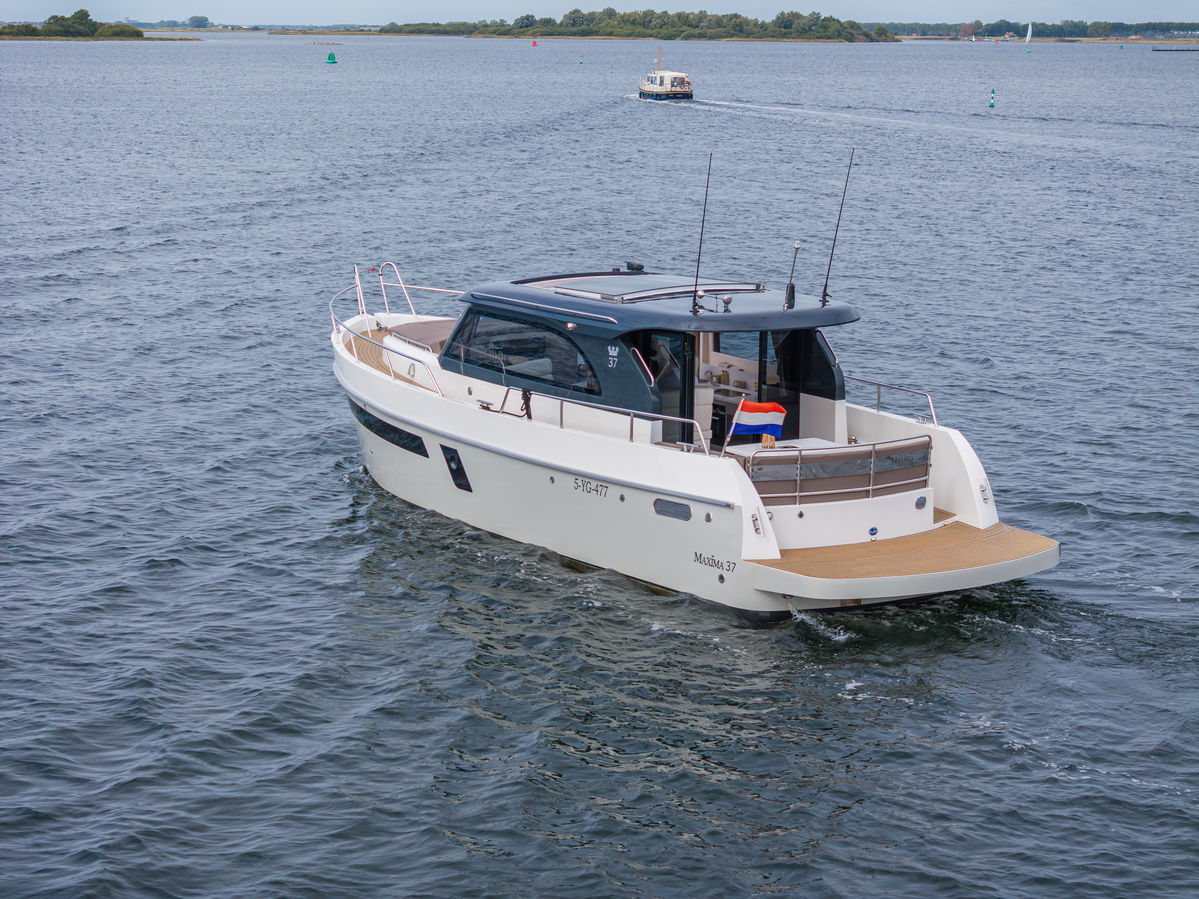 De Maxima 37 Cabin is 11,60 meter lang, 3,80 meter breed en heeft een diepgang van 1,05 meter. Dankzij de doorvaarthoogte van slechts 3,00 meter is zij veelzijdig inzetbaar op zowel binnenwateren als grotere meren en kustgebieden. Het schip wordt aangedreven door een betrouwbare Volvo Penta D4 (270 pk Diesel, bouwjaar 2023), met ca. 290 draaiuren. Deze krachtige en zuinige motor brengt u ontspannen op kruissnelheid (12 km/u) of sportief tot 33 km/u.