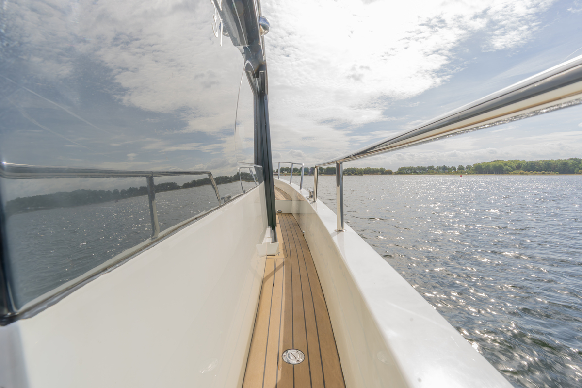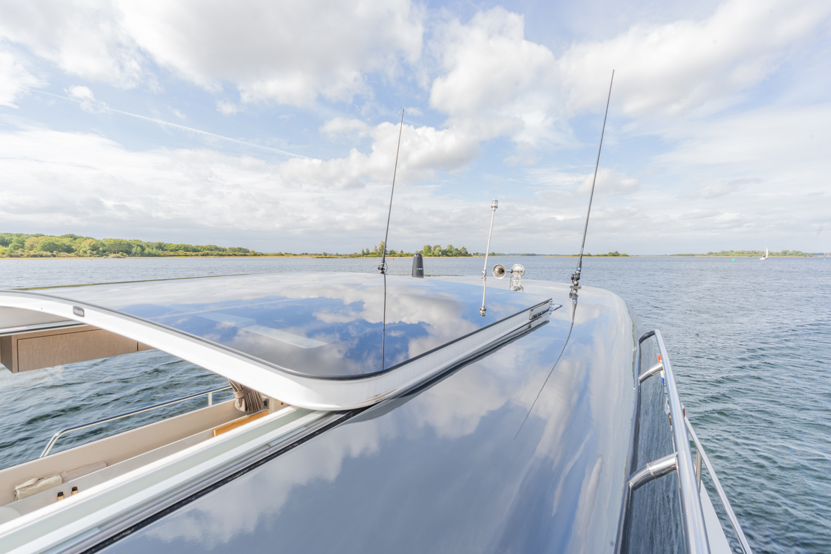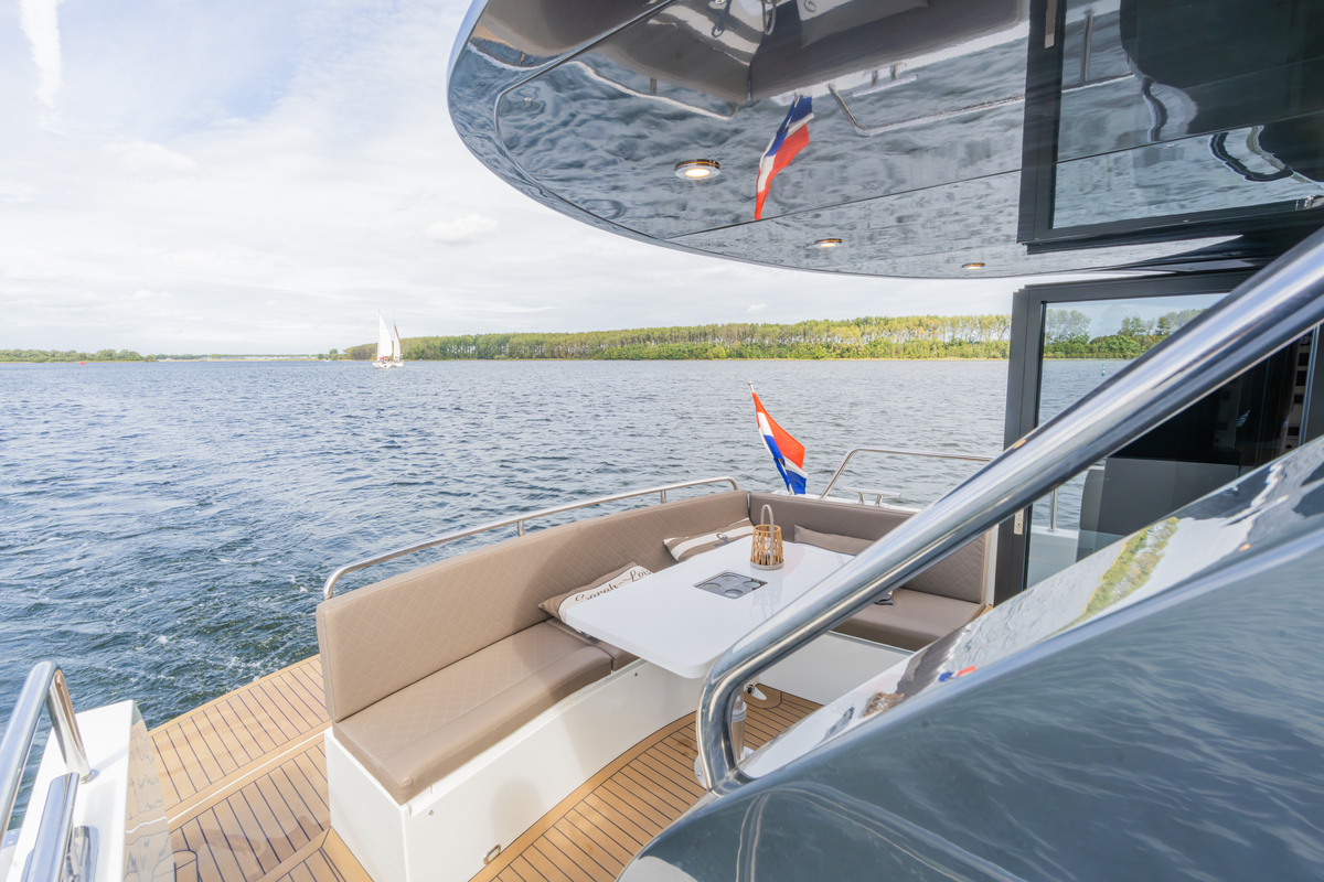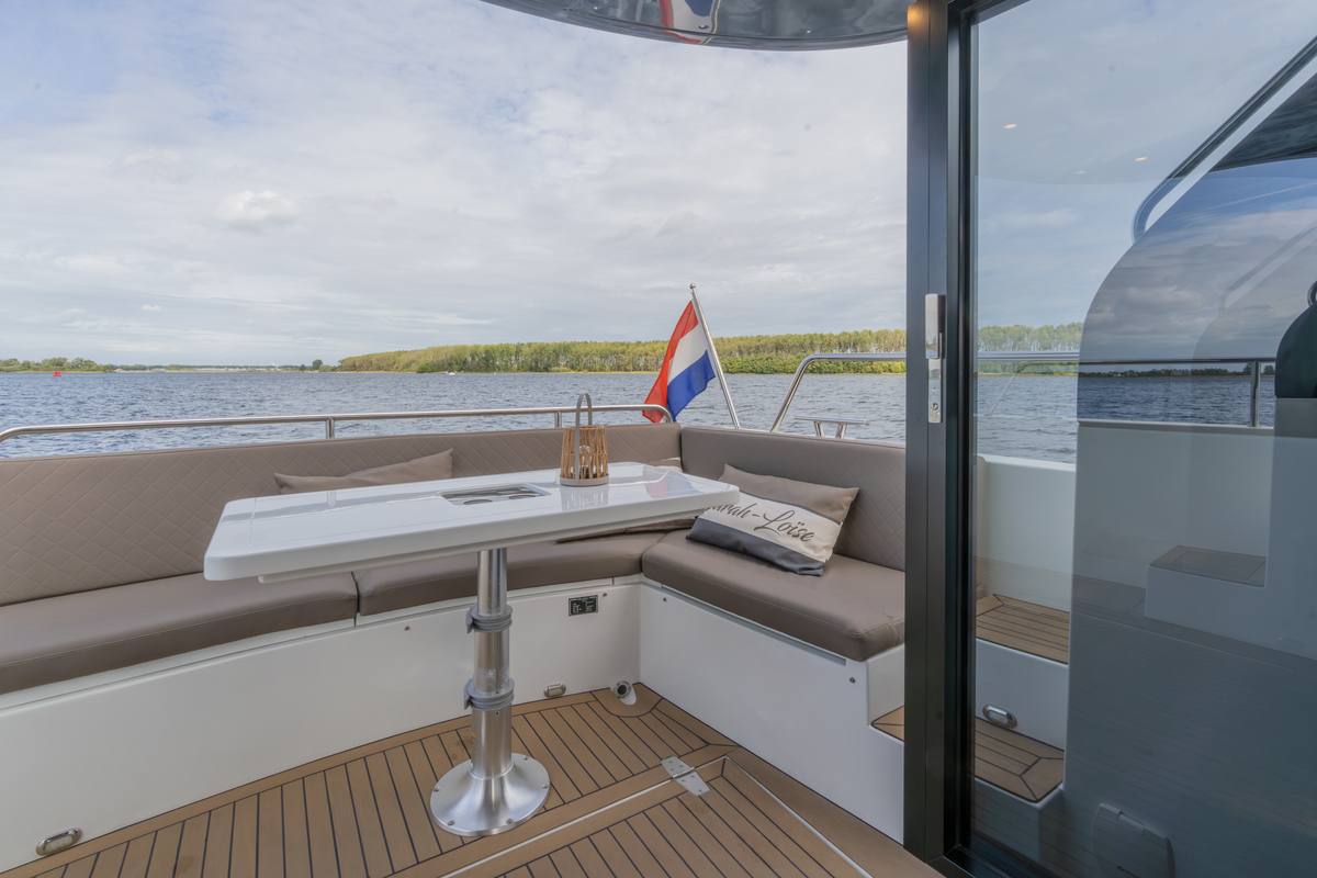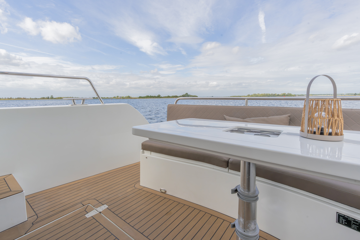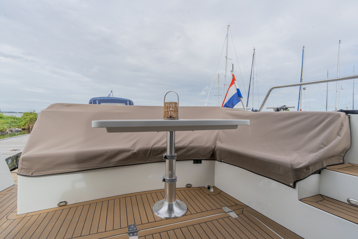 Het exterieur is even doordacht als stijlvol, met kunstteak rondom, een verlengd zwemplateau met zwemtrap, verstelbare kuiptafel die om te bouwen is tot zonnebed en zonnedek op het voordek. Voor het behoud zijn er extra kikkers, dekzeilen, nieuwe screenblindering (2025) en een optionele Talamex Highline bijboot met Suzuki 4 pk buitenboordmotor.
