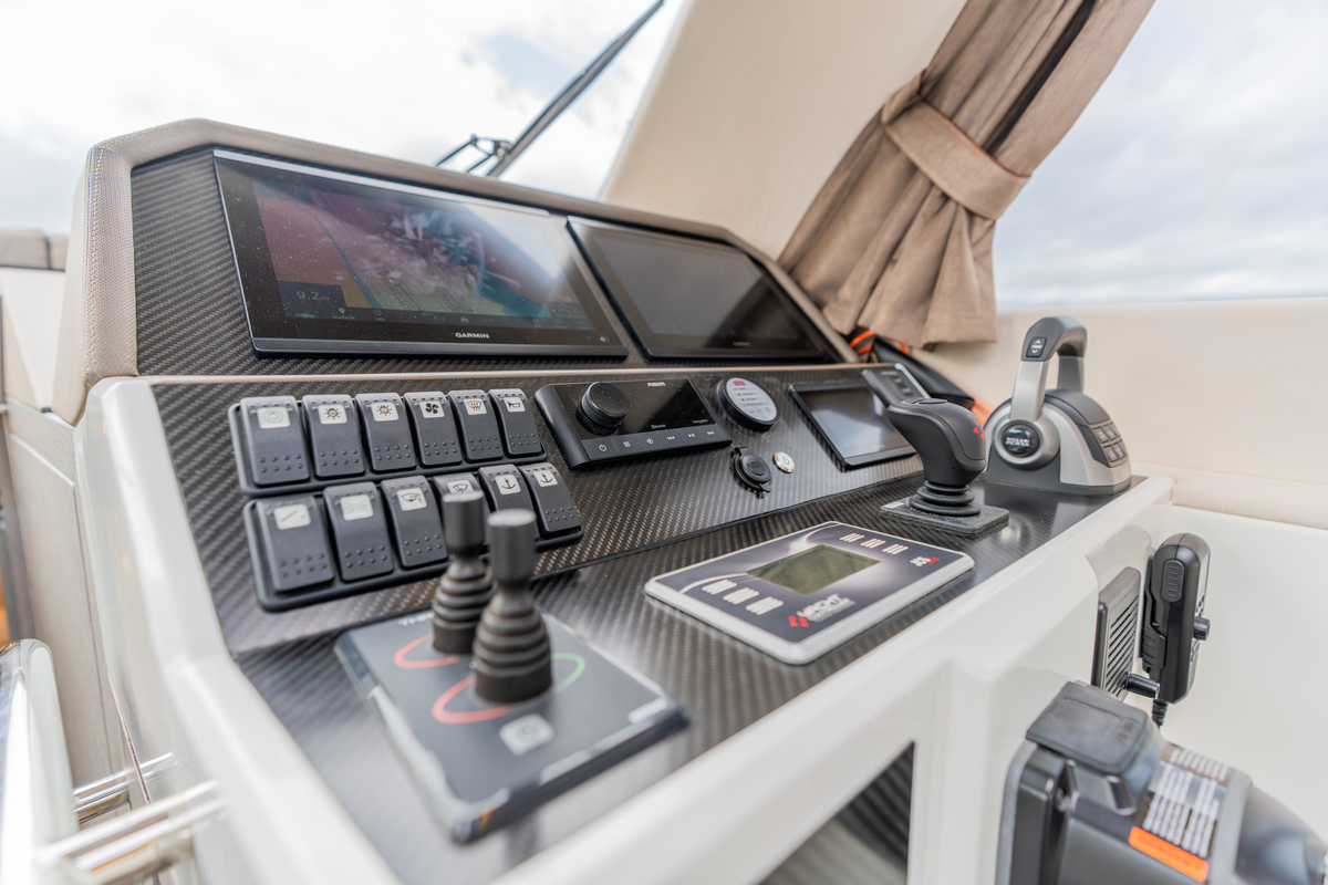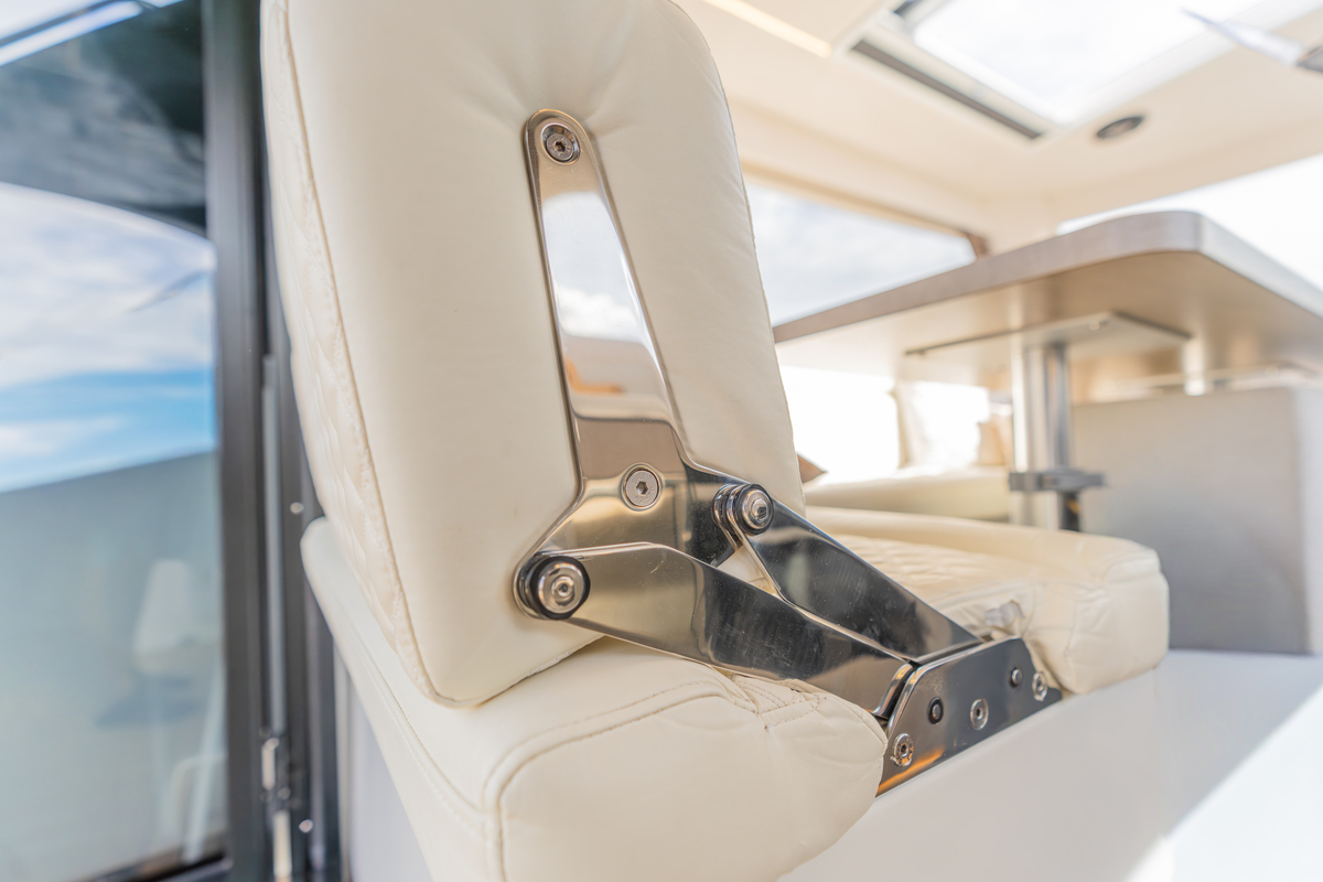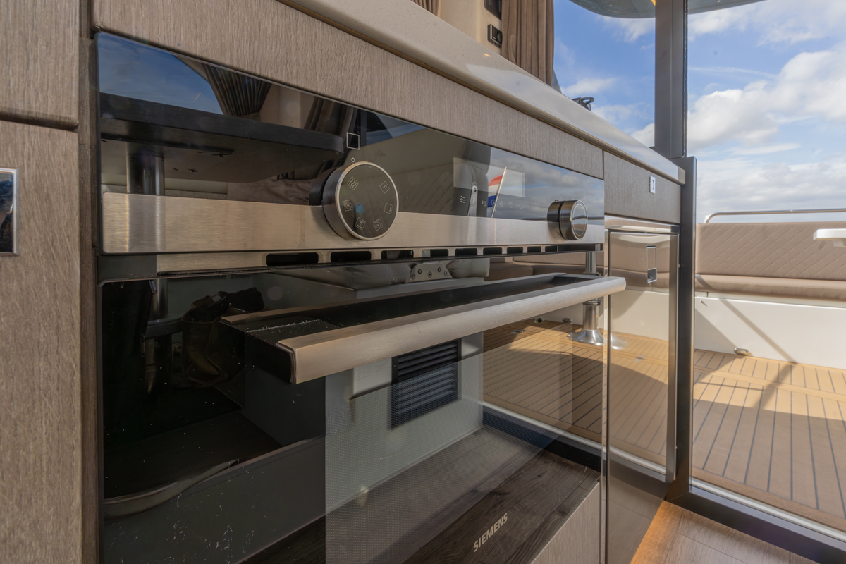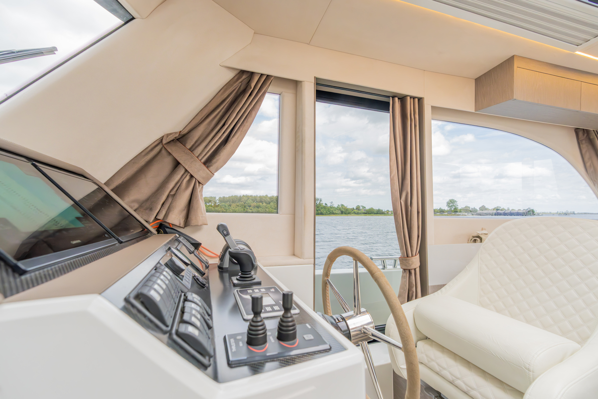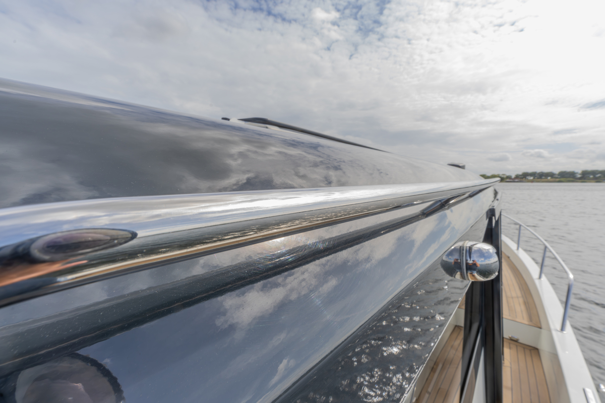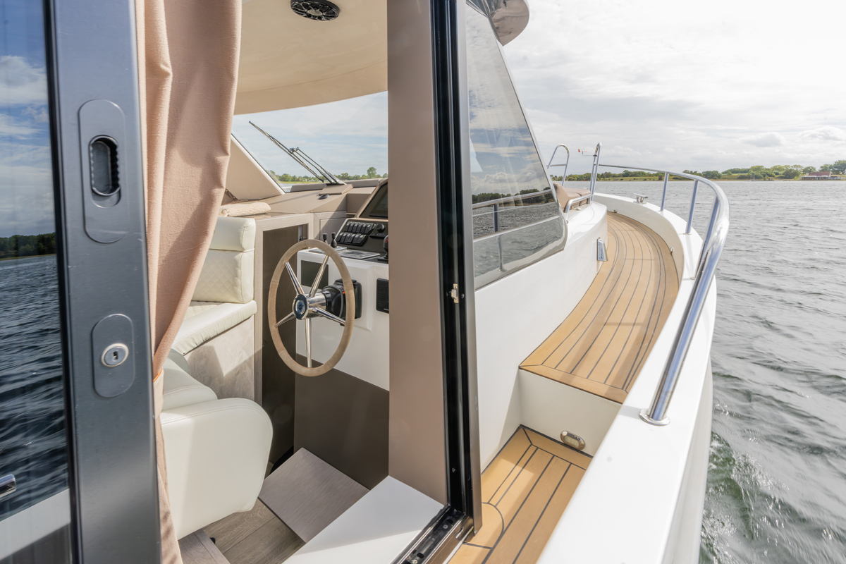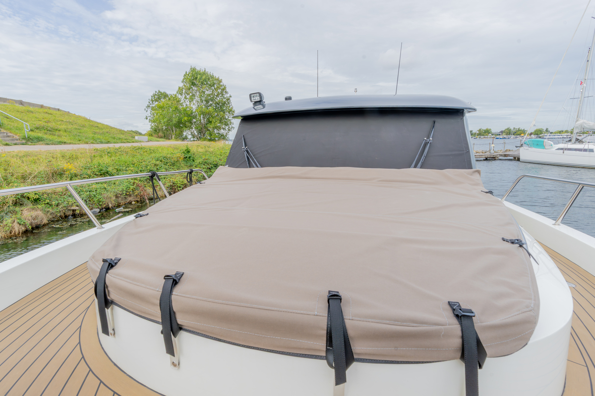 Het exterieur is even doordacht als stijlvol, met kunstteak rondom, een verlengd zwemplateau met zwemtrap, verstelbare kuiptafel die om te bouwen is tot zonnebed en zonnedek op het voordek. Voor het behoud zijn er extra kikkers, dekzeilen, nieuwe screenblindering (2025) en een optionele Talamex Highline bijboot met Suzuki 4 pk buitenboordmotor.
