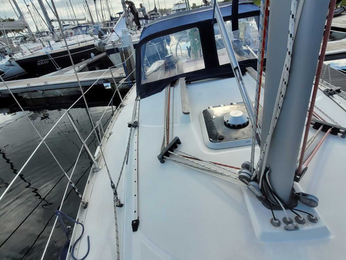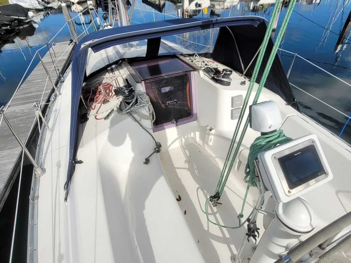 De ruime achterkuip is voorzien van stuurwielbesturing, een sprayhood en zwemplatform met zwemtrap – ideaal voor ankeren en recreatief gebruik. Aan dek bevinden zich een CQR-anker met ketting en lijn, handmatige ankerlier, en alle gebruikelijke veiligheidsvoorzieningen zoals reddingsboei, reddingsvlot, Epirb, brandblussers en hand- en elektrische bilgepomp.