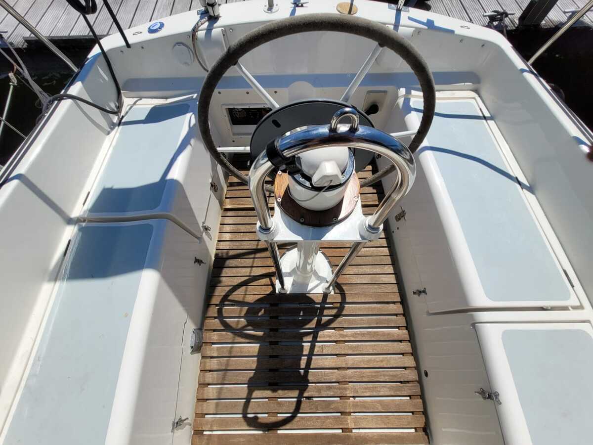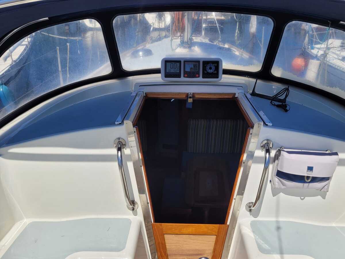 De cockpit is beschermd met een sprayhood (2017) en een cockpitzeil. De besturing is met stuurwiel buiten geplaatst, en dankzij de zelfkerende lieren (Lewmar) en goed onderhouden tuigage zeilt het schip eenvoudig solo of met een kleine crew.