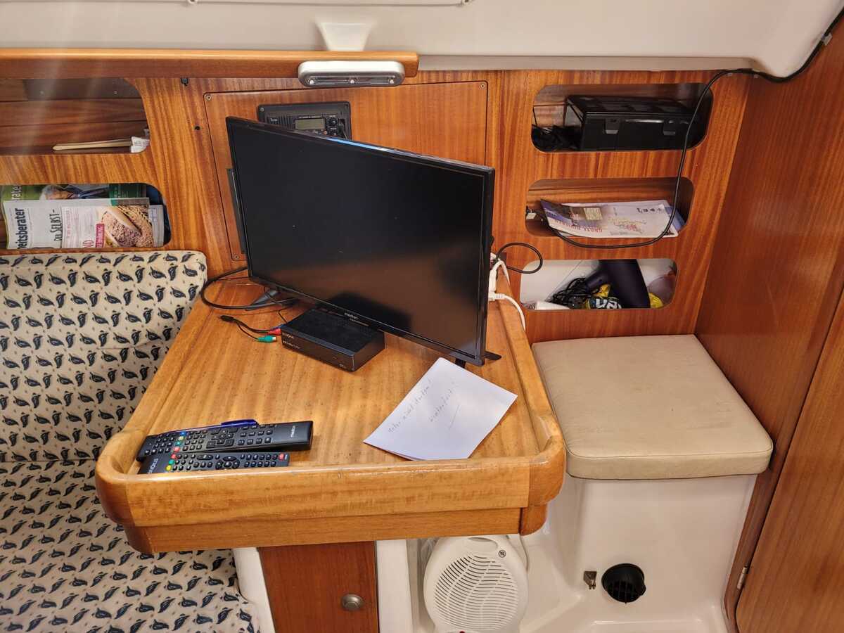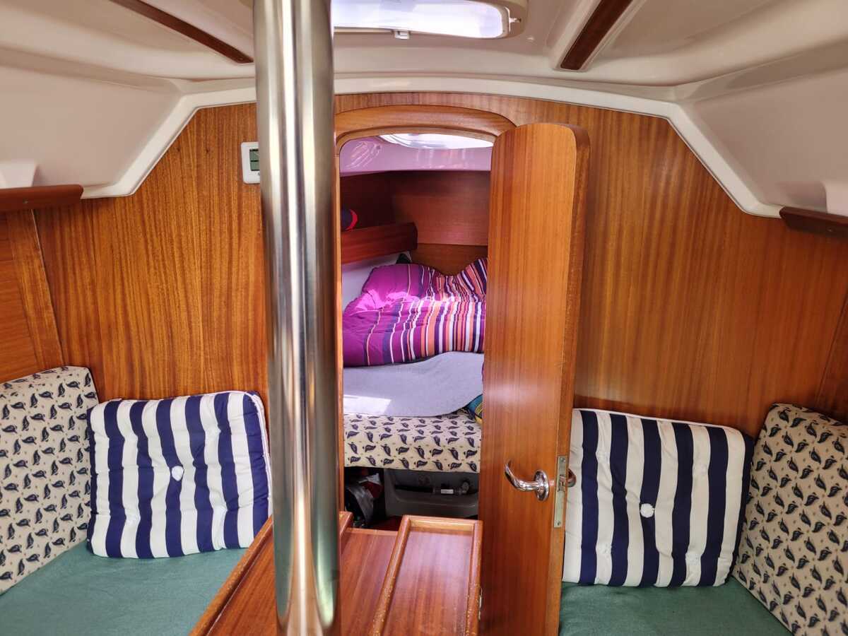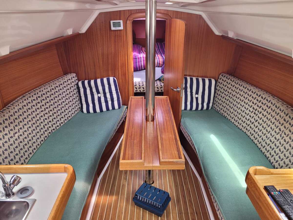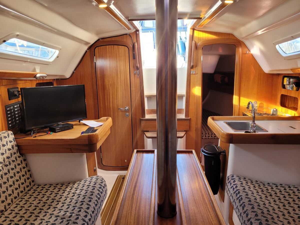 Binnenin tref je een gezellige en lichte salon met een open voorkajuit, waardoor de ruimte optisch en praktisch ruimer aanvoelt. De boot beschikt over een goed uitgeruste kombuis met koelkast, een comfortabele natte cel, en verwarming voor koelere dagen aan boord. De afwerking is warm en klassiek, met degelijk houtwerk en voldoende opbergruimte.