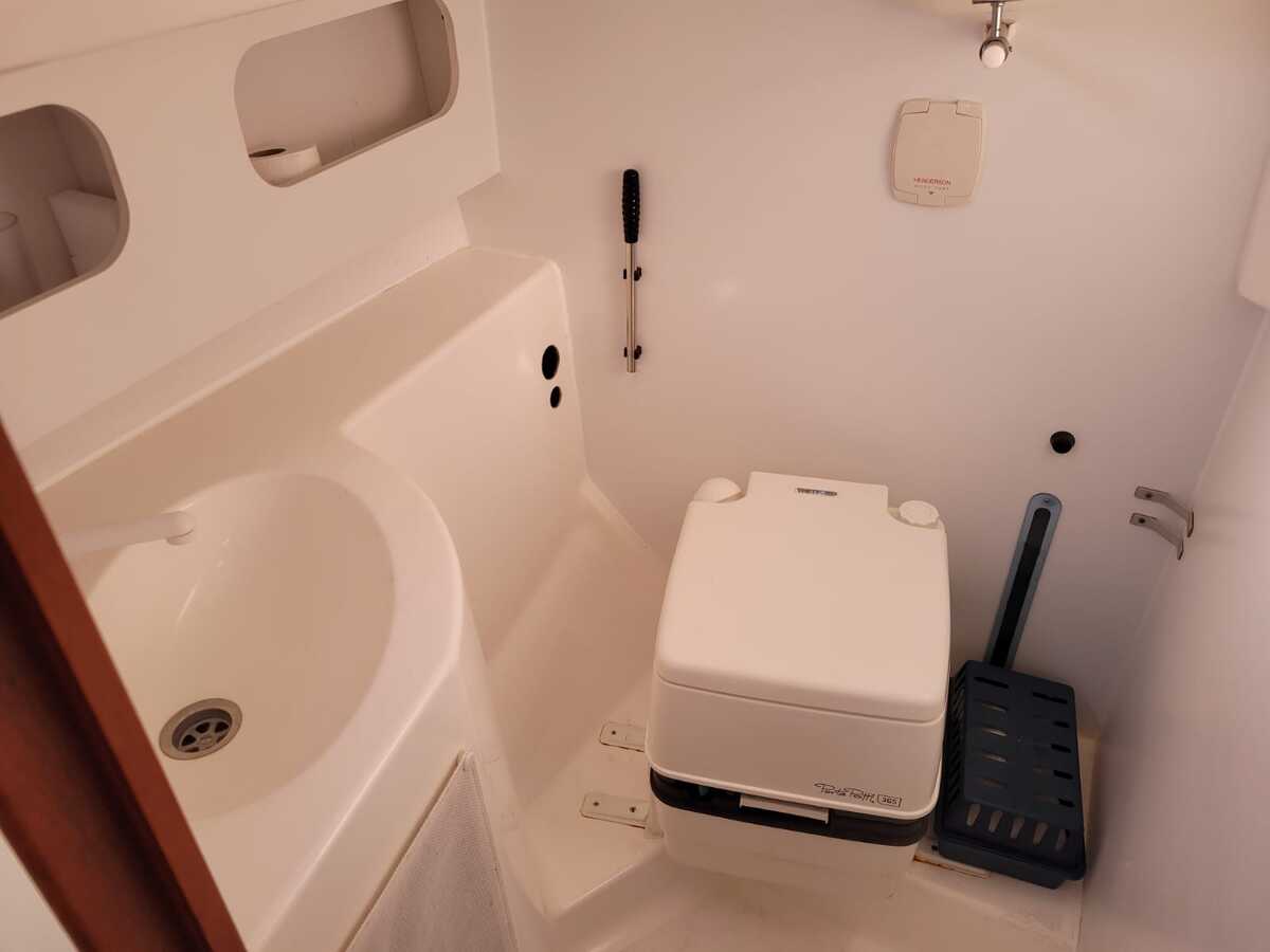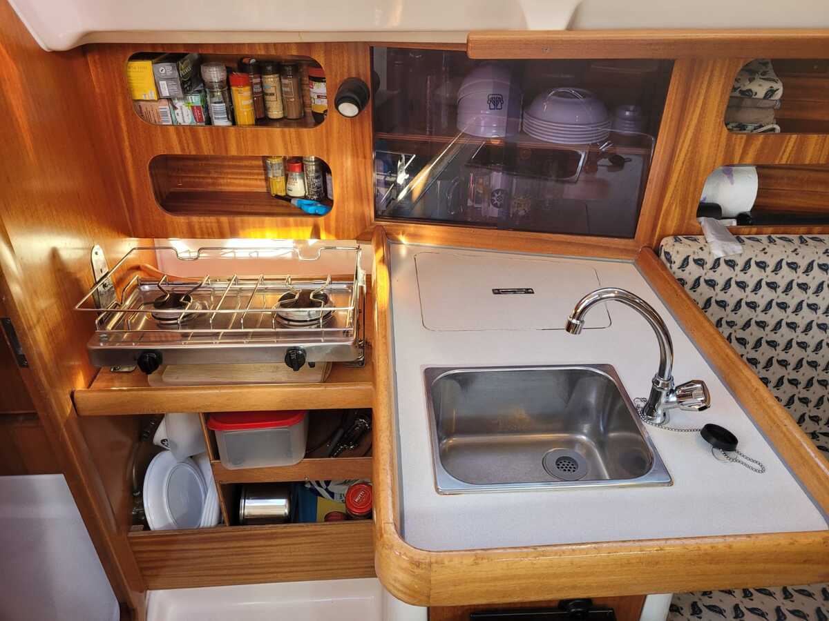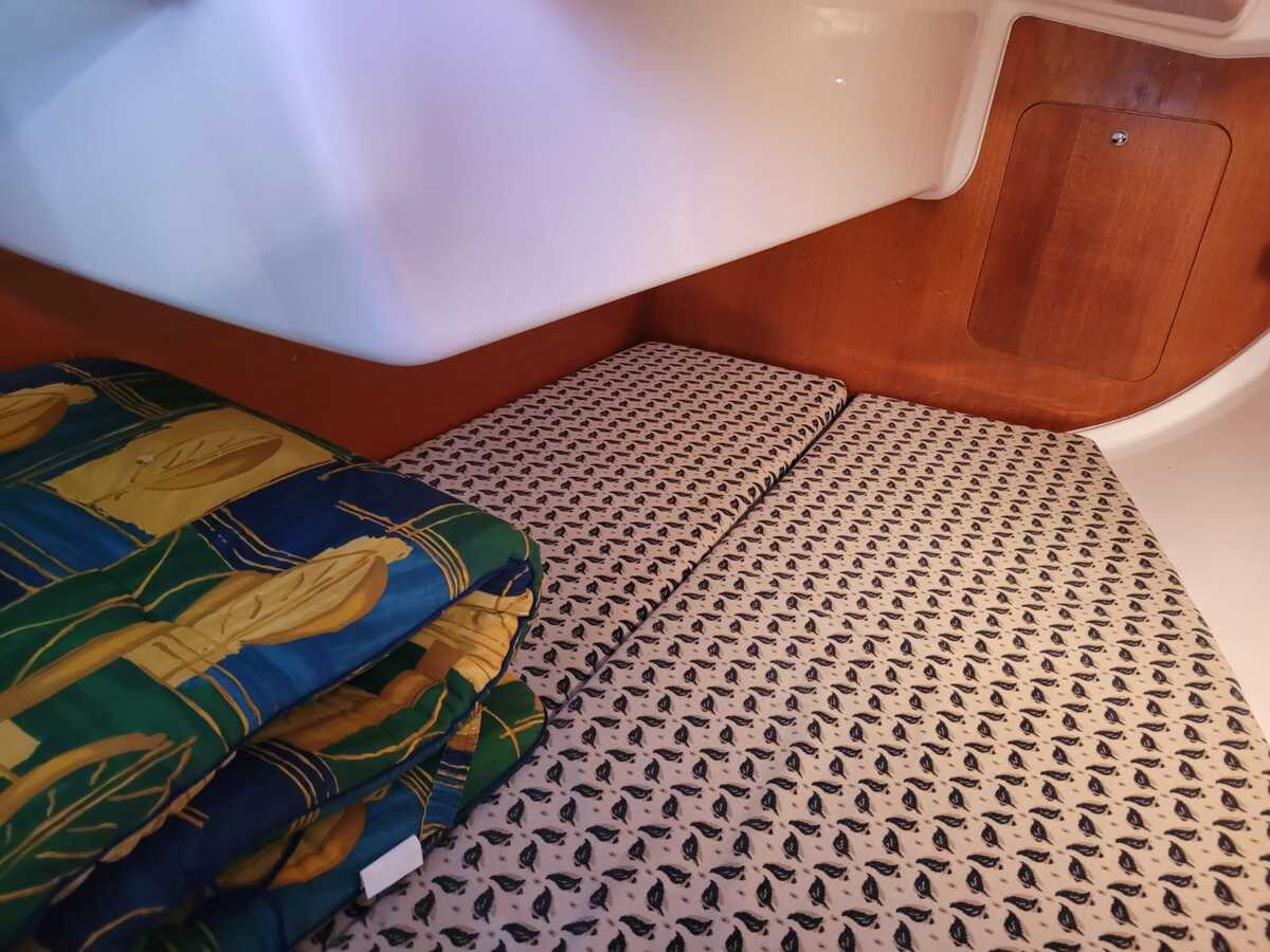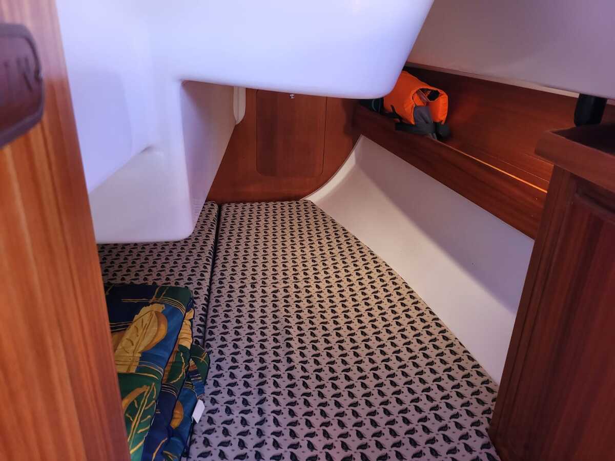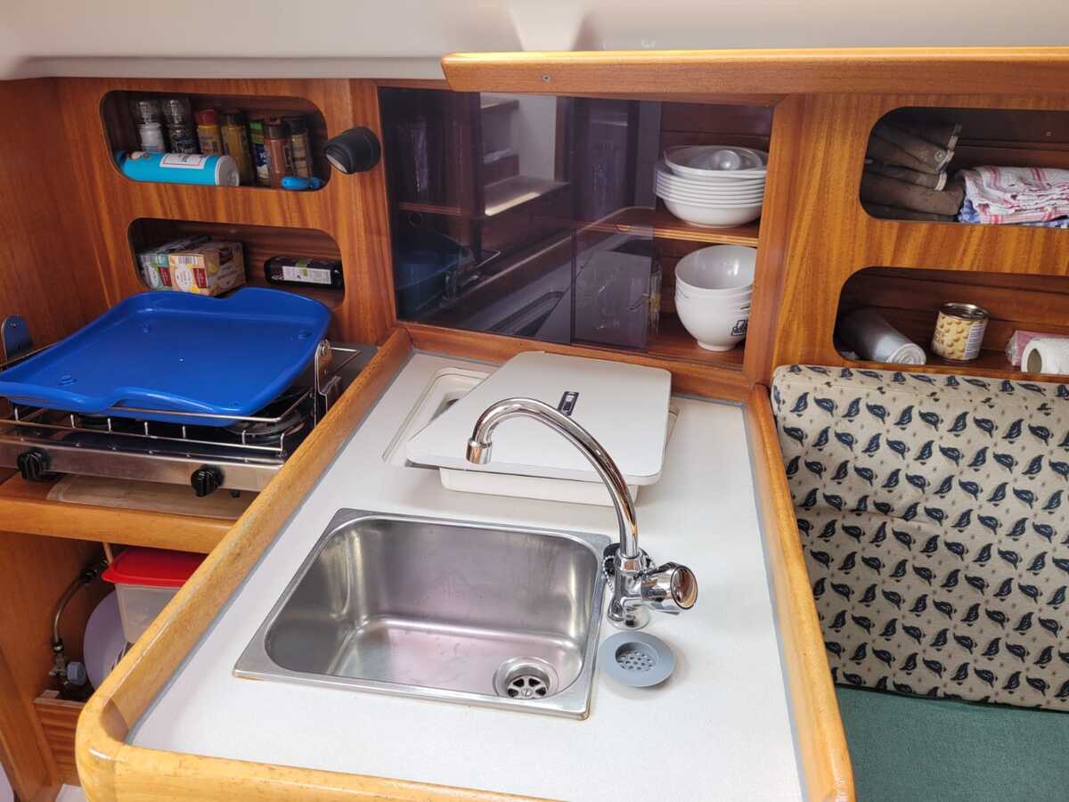 Binnenin tref je een gezellige en lichte salon met een open voorkajuit, waardoor de ruimte optisch en praktisch ruimer aanvoelt. De boot beschikt over een goed uitgeruste kombuis met koelkast, een comfortabele natte cel, en verwarming voor koelere dagen aan boord. De afwerking is warm en klassiek, met degelijk houtwerk en voldoende opbergruimte.