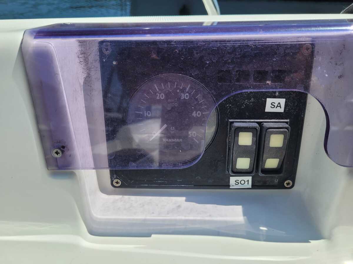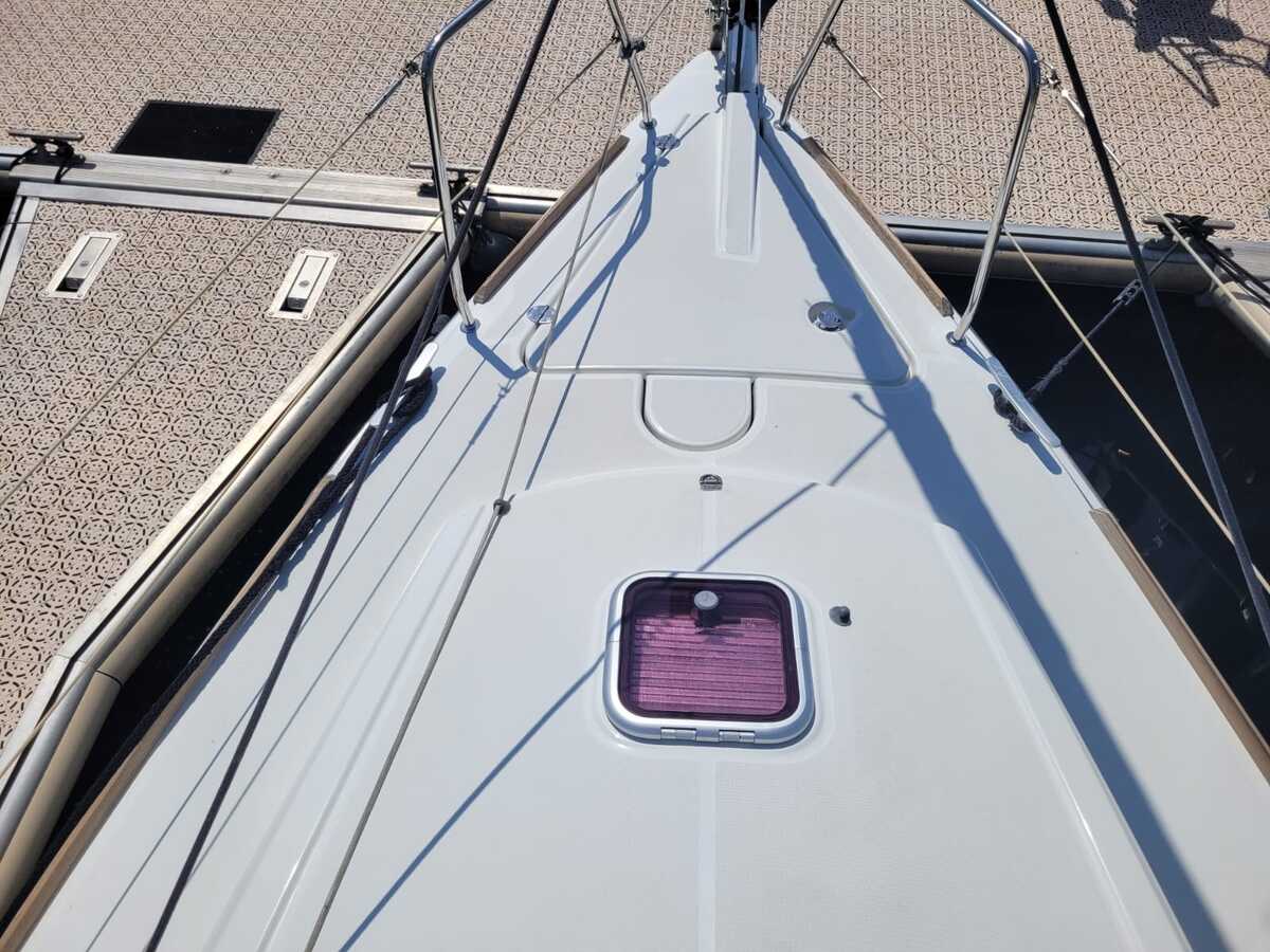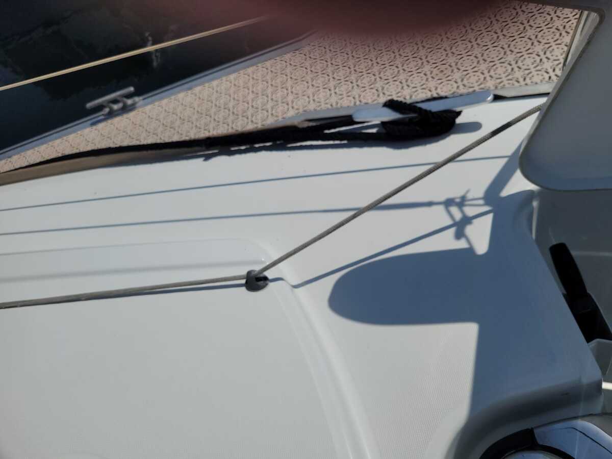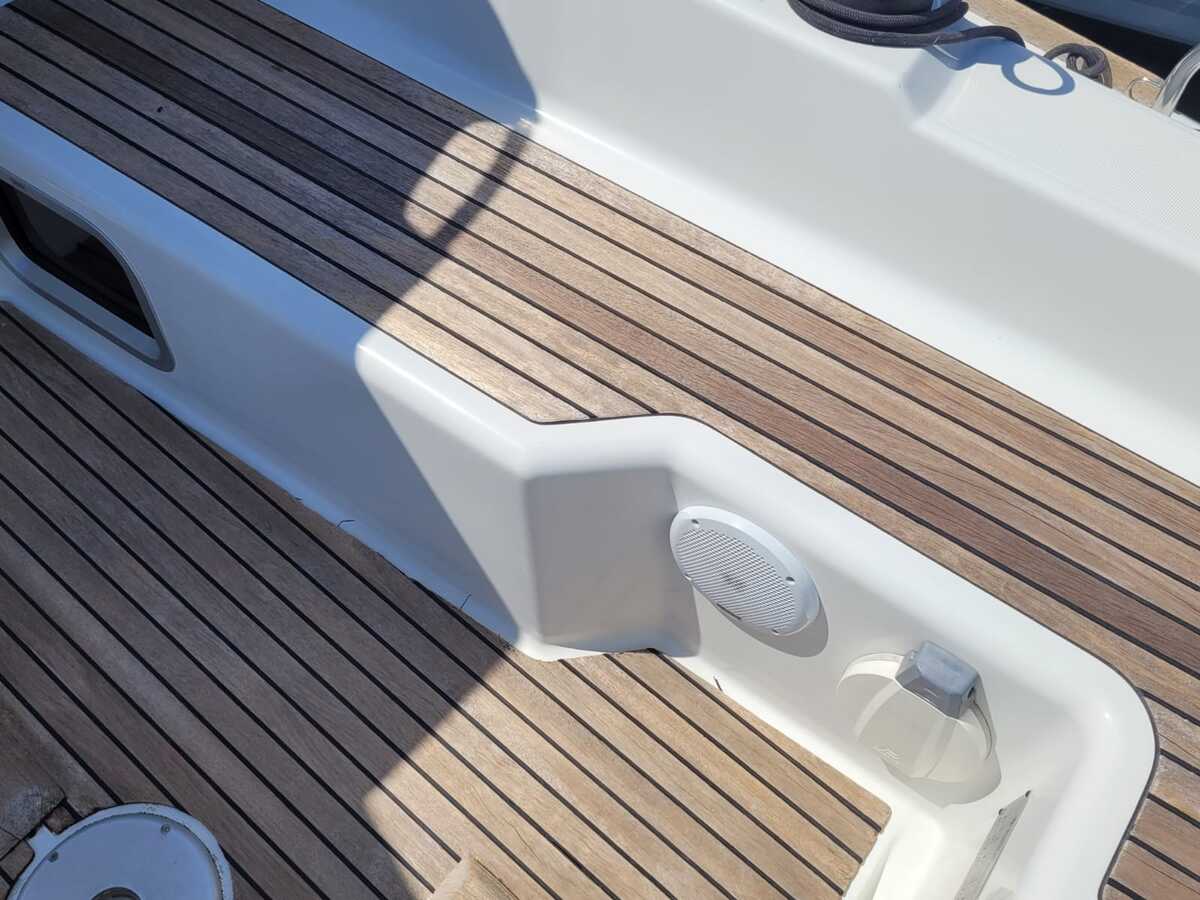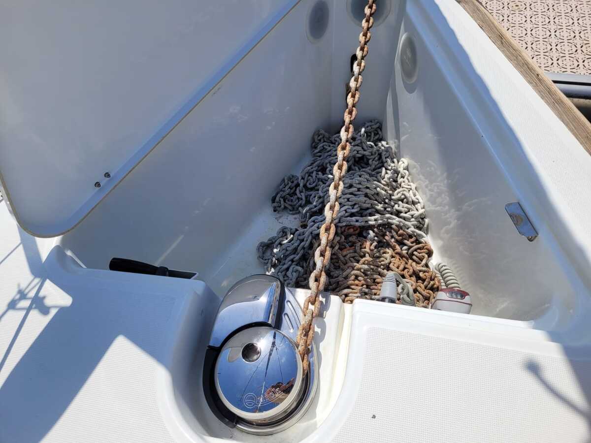 Aan dek vind je onder andere een buiskap, bimini, elektrische ankerlier, zwemplatform met zwemtrap en zeerailing De boot is klaar voor nieuwe avonturen op het water.