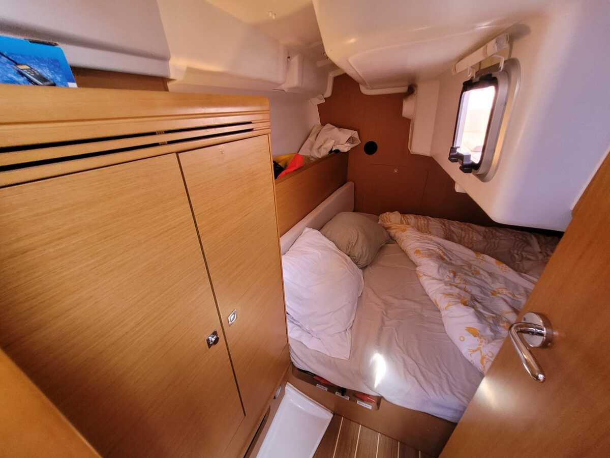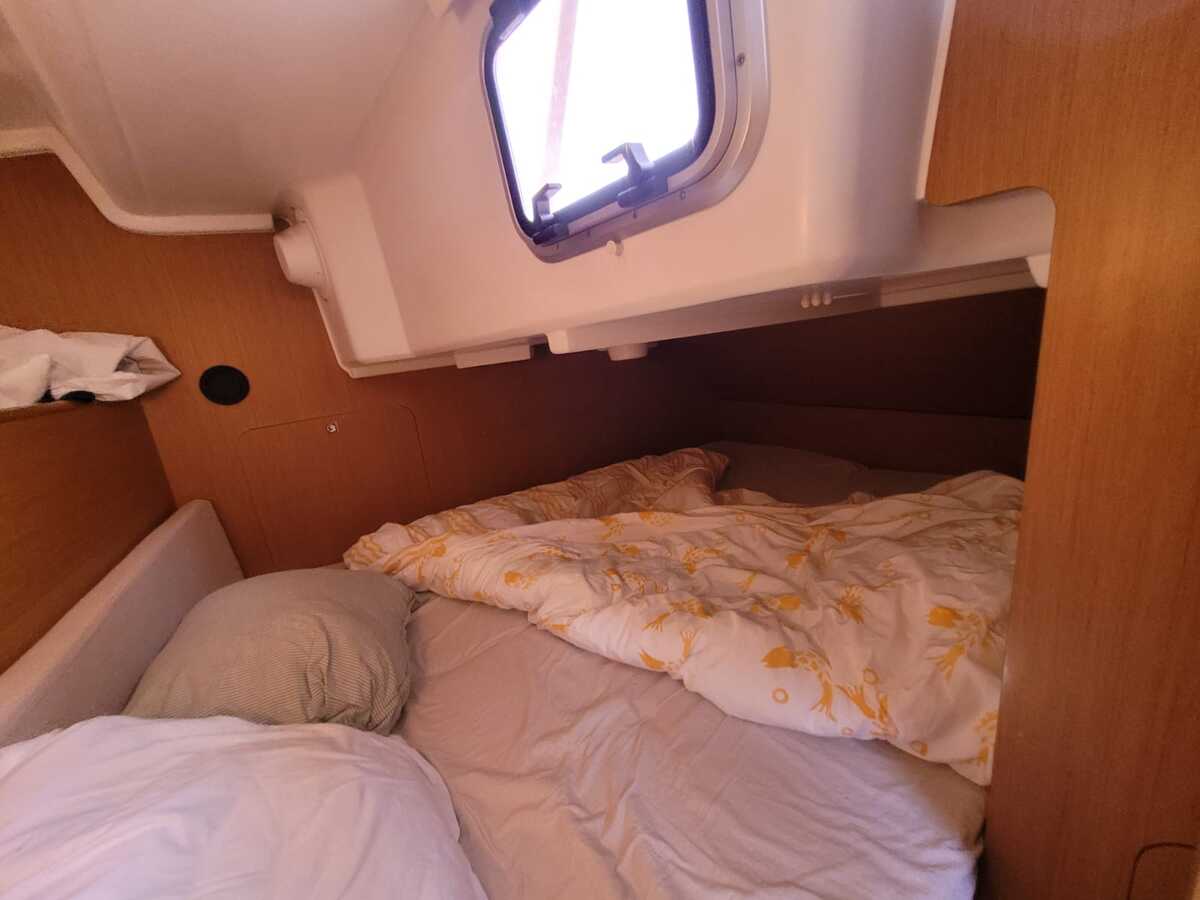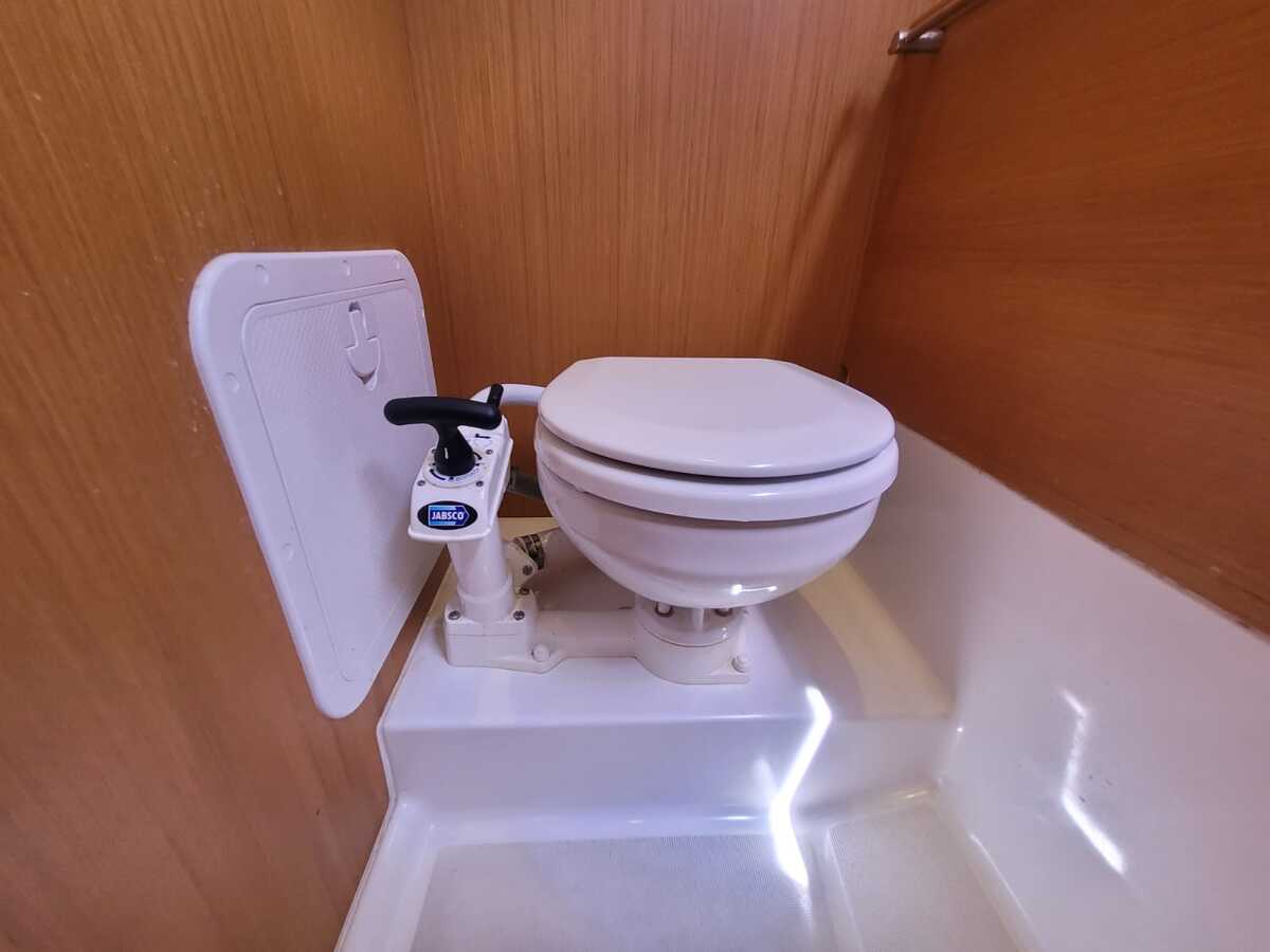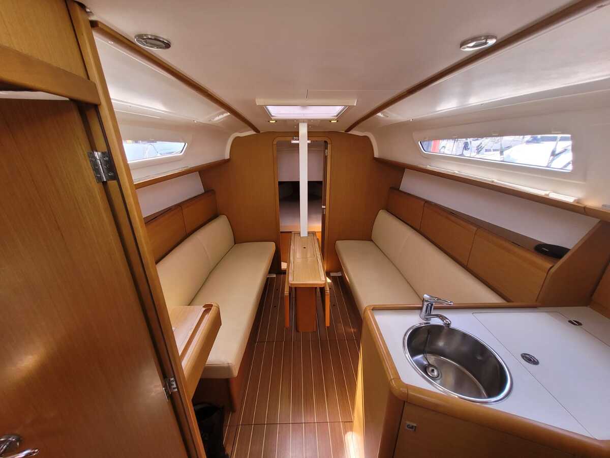 Binnen tref je een licht en modern interieur met stahoogte van circa 1,90 meter, waardoor het verblijf aan boord aangenaam ruim aanvoelt. De indeling bestaat uit een voorhut, een comfortabele salon met kaarttafel, een praktische kombuis met gasfornuis en oven, een nette natte cel en een achterkajuit. Er zijn vier vaste slaapplaatsen plus twee extra, ideaal voor familie of gasten. Voor extra comfort beschikt de boot over warm water, een Webasto heteluchtverwarming, binnen- en buitendouche en een ruime koelkast.