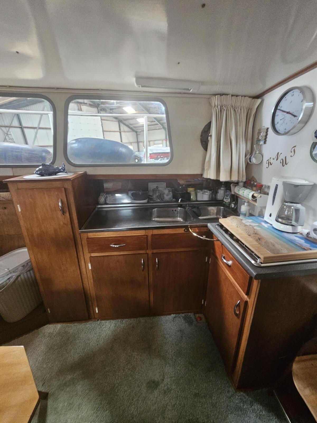 Riant stuurhuis/salon met stuurstanden banken, brede gangboorden rondom. Salon met bank en kombuis en voorin een V-vormig bed en kastenwanden. Toiletruimte