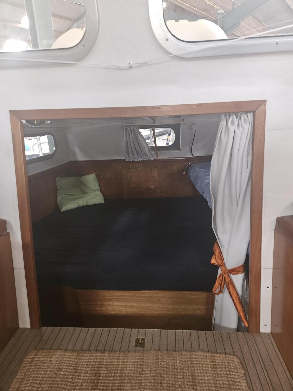 In de salon bevindt zich ook de kombuis – compact maar praktisch ingericht. Voorin is een sfeervolle hut met een V-vormig bed, geschikt voor twee vaste slaapplaatsen. Daarnaast kan er nog een slaapplaats gerealiseerd worden op de zitbank, zodat ook gasten welkom zijn aan boord.