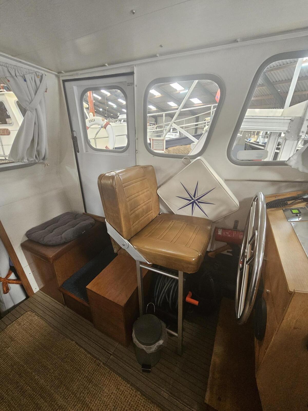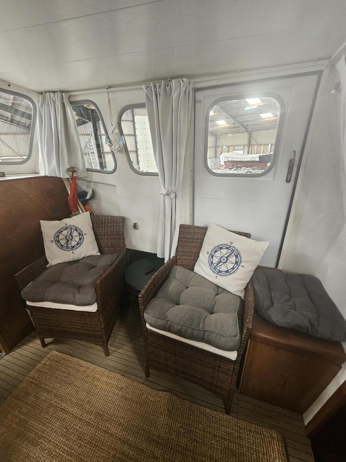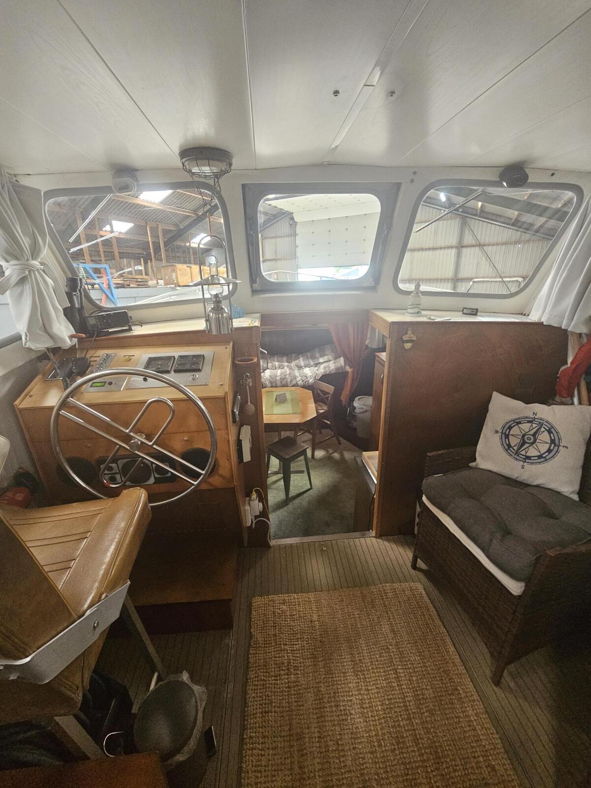 Stap aan boord via de brede gangboorden rondom, ideaal voor veilig en comfortabel bewegen op het dek. Het ruime stuurhuis/salon biedt volop licht en uitzicht, met stuurstand en comfortabele stoelen en biedt tevens toegang tot de hut met 3 slaapplaatsen.